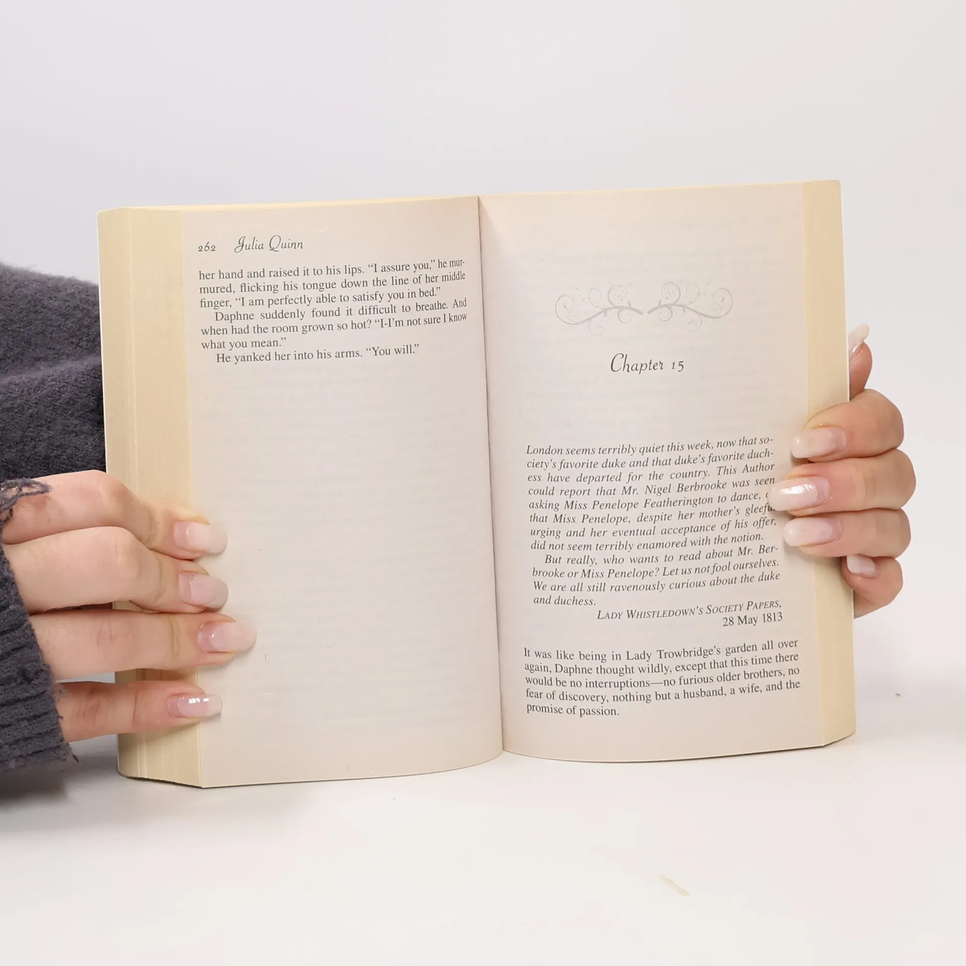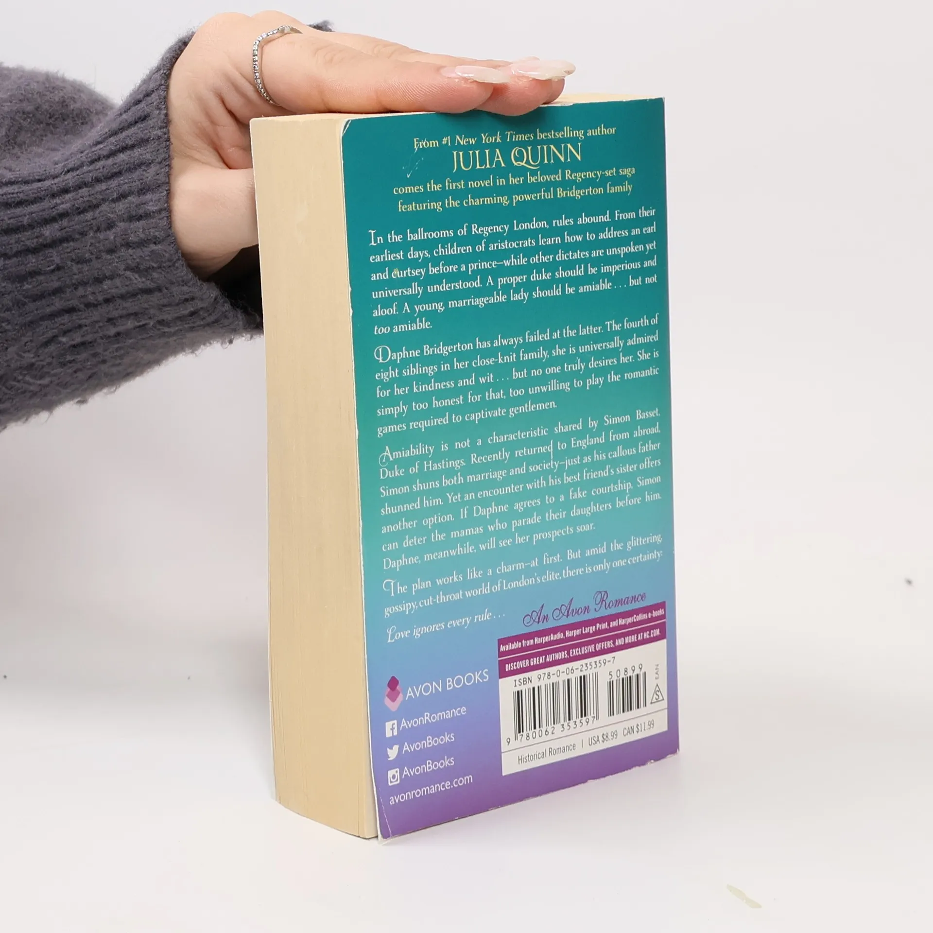 From #1 New York Times bestselling author Julia Quinn comes the first novel in her beloved Regency series featuring the charming Bridgerton family, soon to be a Netflix series. In the ballrooms of Regency London, strict social rules govern the lives of the aristocracy. Children learn the proper ways to address an earl or curtsey before a prince, while unspoken expectations loom large. A proper duke is expected to be aloof, and a marriageable lady should be amiable—but not too amiable. Daphne Bridgerton, the fourth of eight siblings, struggles with this balance. Well-liked for her kindness and wit, she finds that no one truly desires her, as her honesty keeps her from playing the romantic games that captivate gentlemen. Simon Basset, the Duke of Hastings, has returned to England determined to avoid marriage and society, having been emotionally scarred by his father's neglect. An unexpected encounter with Daphne, his best friend’s sister, leads to a proposal for a fake courtship. This arrangement allows Simon to fend off the matchmaking mamas, while boosting Daphne’s prospects and reputation. Initially, the plan works perfectly, but in the glittering, gossipy world of London’s elite, love proves to be a force that disregards all rules.