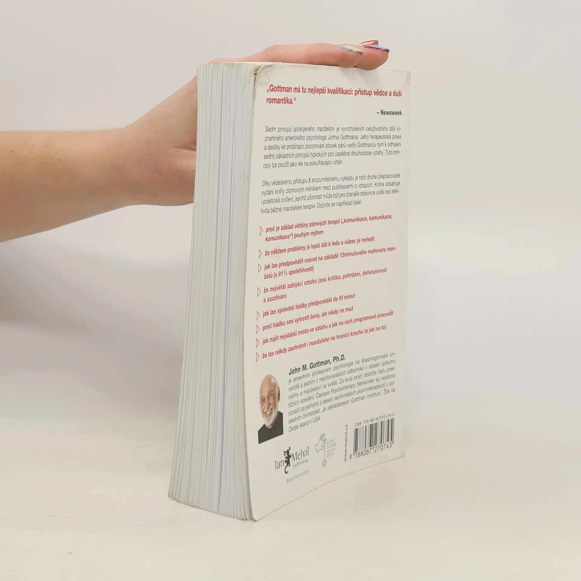 „Sedm principů spokojeného manželství“ představuje vrchol celoživotního díla amerického psychologa Johna Gottmana, jednoho z nejvlivnějších odborníků na manželství a rodičovství. Díky více než dvacetiletému výzkumu nabízí Gottman hluboký vhled do dynamiky partnerských vztahů. Autor zahájil svůj výzkum v roce 1992 se 700 novomanželskými páry, které si nahrávaly 15minutové rozhovory. Analýzou těchto záznamů předpověděl, zda páry vydrží dalších deset let, s úspěšností 94 %. Klíčovým faktorem pro úspěch vztahu se ukázal být poměr pozitivních a negativních interakcí, přičemž páry, které zůstaly spolu, měly pětkrát více pozitivních interakcí než negativních. Gottman se zaměřuje na mýty o komunikaci a identifikuje destruktivní vzorce, které mohou vést k rozchodu. Kniha obsahuje profily párů, které se dokázaly zachránit, a také příběhy těch, kteří proplouvají životem společně. Čtenáři najdou dotazníky a cvičení, které pomohou identifikovat problémy ve vztahu a zaměřit se na jejich řešení. První vydání knihy vyšlo v roce 1999 a stalo se bestsellerem, přičemž aktualizované vydání z roku 2015 přináší nejnovější výzkumy.