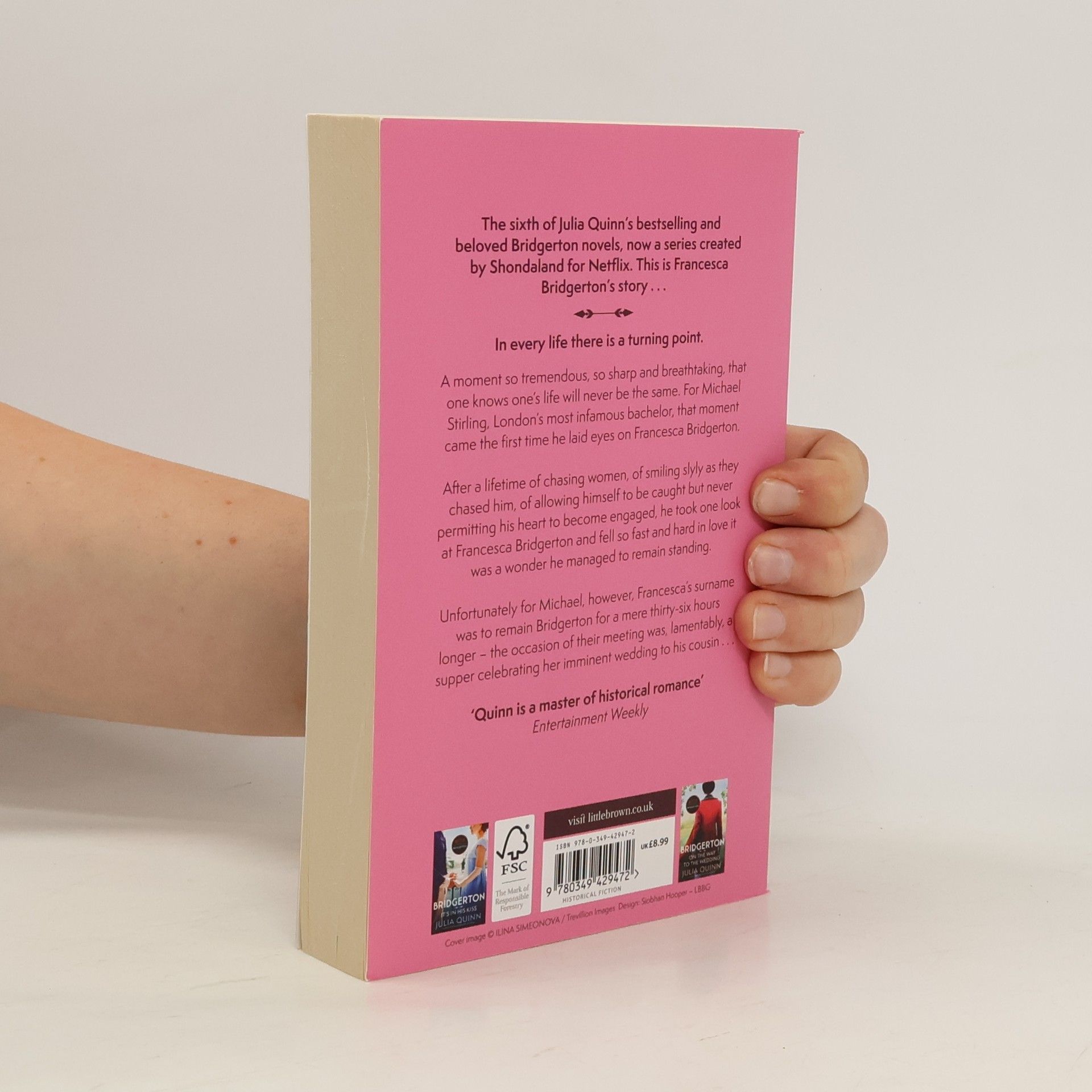 In every life there is a turning point. A moment so tremendous, so sharp and breath-taking, that one knows one's life will never be the same. For Michael Stirling, London's most infamous bachelor, that moment came the first time he laid eyes on Francesca Bridgerton. After a lifetime of chasing women, of smiling slyly as they chased him, of allowing himself to be caught but never permitting his heart to become engaged, he took one look at Francesca Bridgerton and fell so fast and hard into love it was a wonder he managed to remain standing. Unfortunately for Michael, however, Francesca's surname was to remain Bridgerton for only a mere thirty-six hours longer - the occasion of their meeting was, lamentably, a supper celebrating her imminent wedding to his cousin.