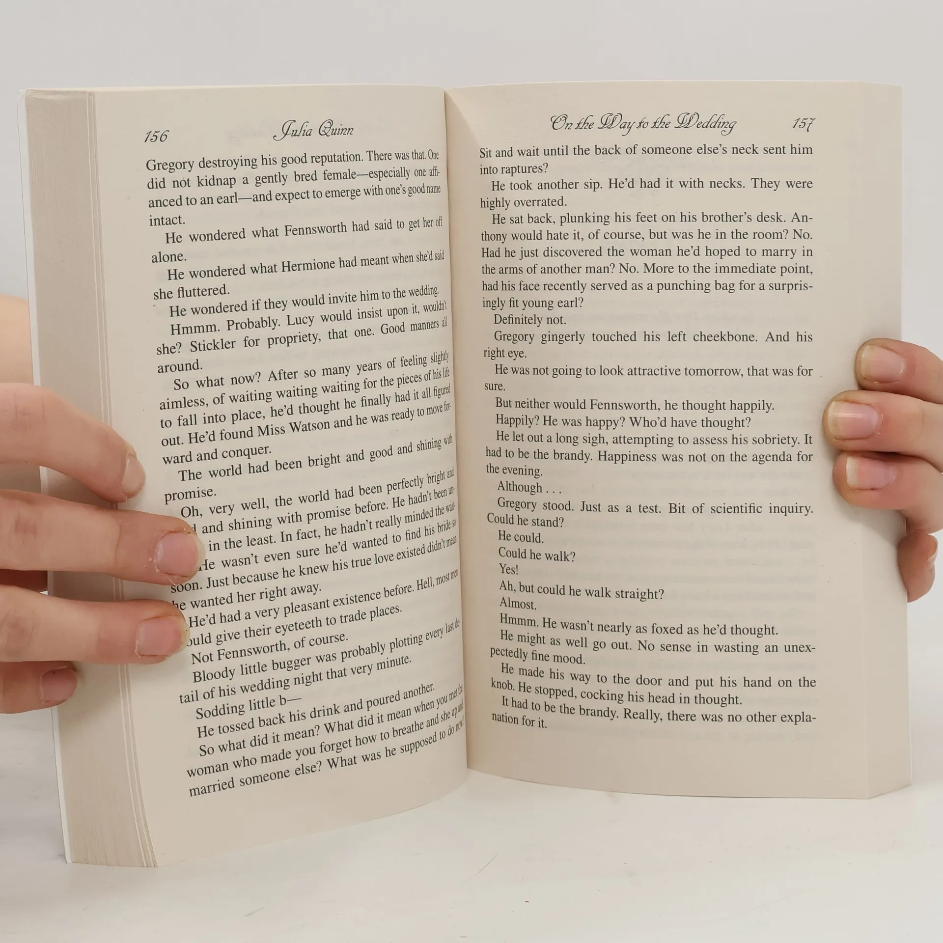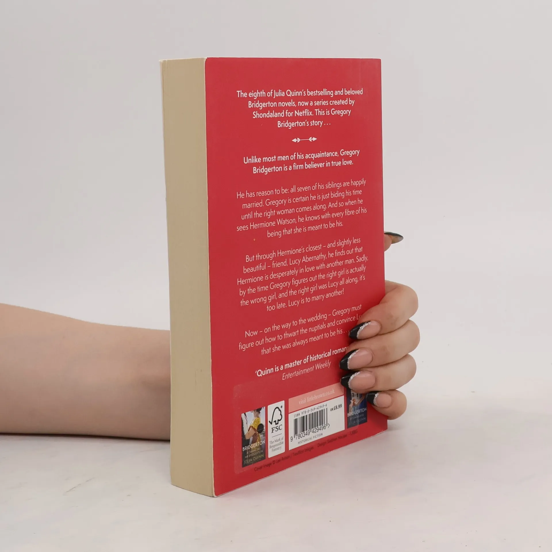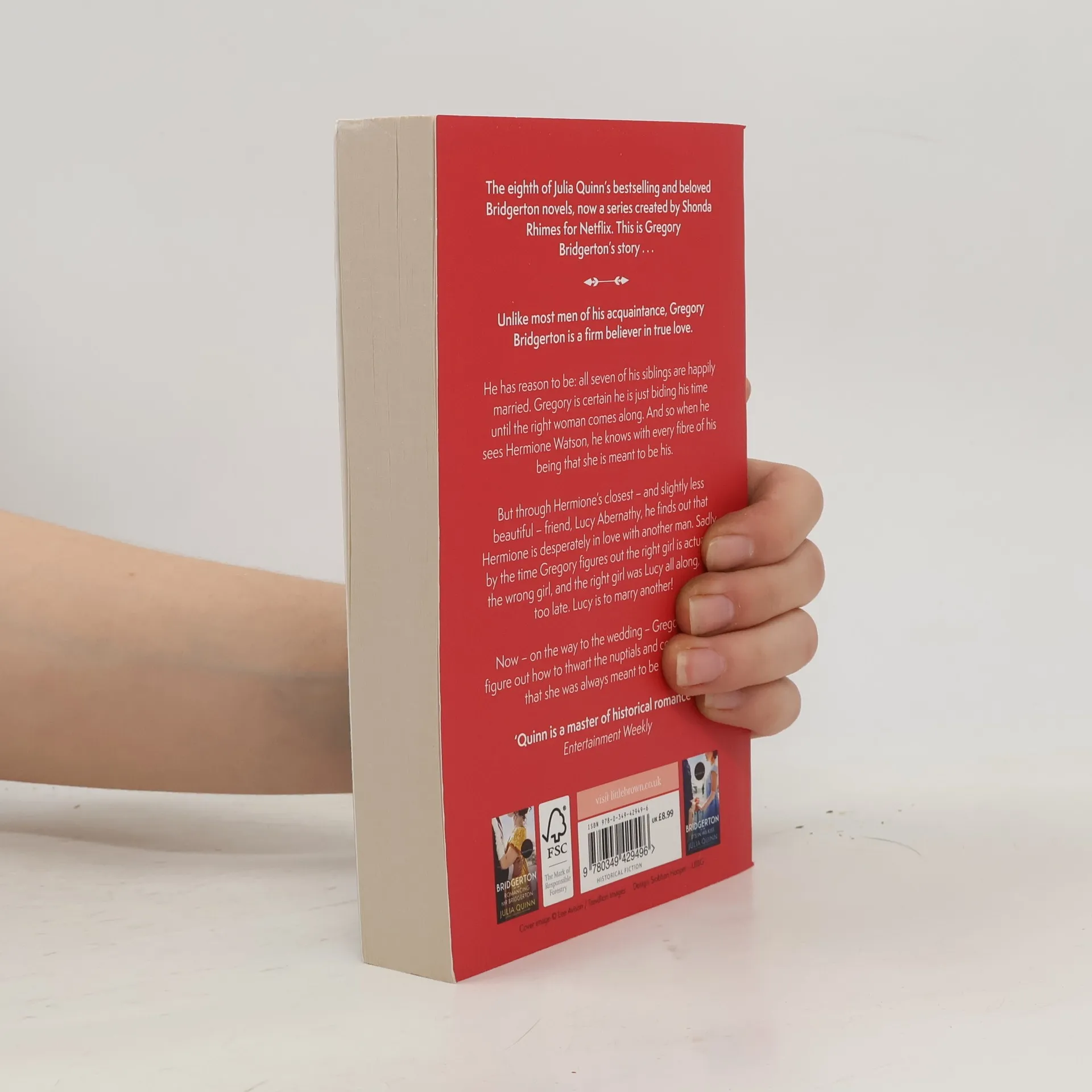 Unlike most men of his acquaintance, Gregory Bridgerton believes in true love. And he is convinced that when he finds the woman of his dreams, he will know in an instant that she is the one. And that is exactly what happened. Except. She wasn't the one. In fact, the ravishing Miss Hermione Watson is in love with another. But her best friend, the ever-practical Lady Lucinda Abernathy, wants to save Hermione from a disastrous alliance, so she offers to help Gregory win her over. But in the process, Lucy falls in love. With Gregory! Except. Lucy is engaged. And her uncle is not inclined to let her back out of the betrothal, even once Gregory comes to his senses and realizes that it is Lucy, with her sharp wit and sunny smile, who makes his heart sing. And now, on the way to the wedding, Gregory must risk everything to ensure that when it comes time to kiss the bride, he is the only man standing at the altar.