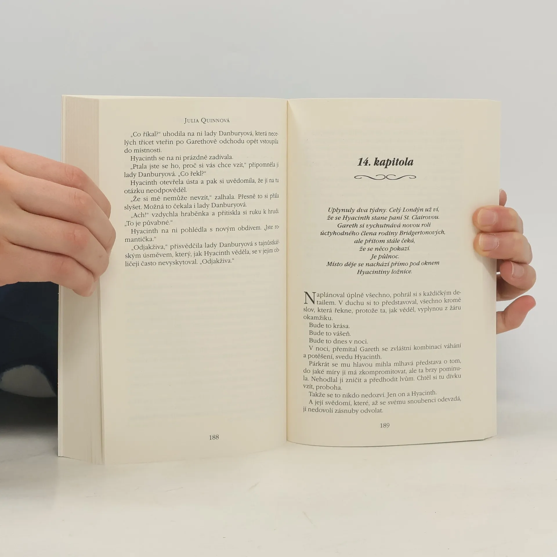 Gareth St. Clair je v pěkné bryndě. Otec ho připravil o dědictví a jemu zbyl pouze starý rodinný deník, který může ukrývat tajemství z jeho minulosti a klíč k budoucnosti. Bohužel je psaný v italštině, z níž Gareth neumí ani slovo. Hyacinth Bridgertonová je dívka, které je podle Garetha lepší se vyhnout, umí ale italsky. Když se tihle dva náhodou setkají, Gareth Hyacint přiměje, aby mu slíbila, že deník přeloží. Jak se tak ponořují do tajemného textu, zjišťují, že odpovědi nenajdou v deníku, nýbrž jeden v druhém. A že nic není tak prosté – nebo tak složité – jako jediný, dokonalý polibek.