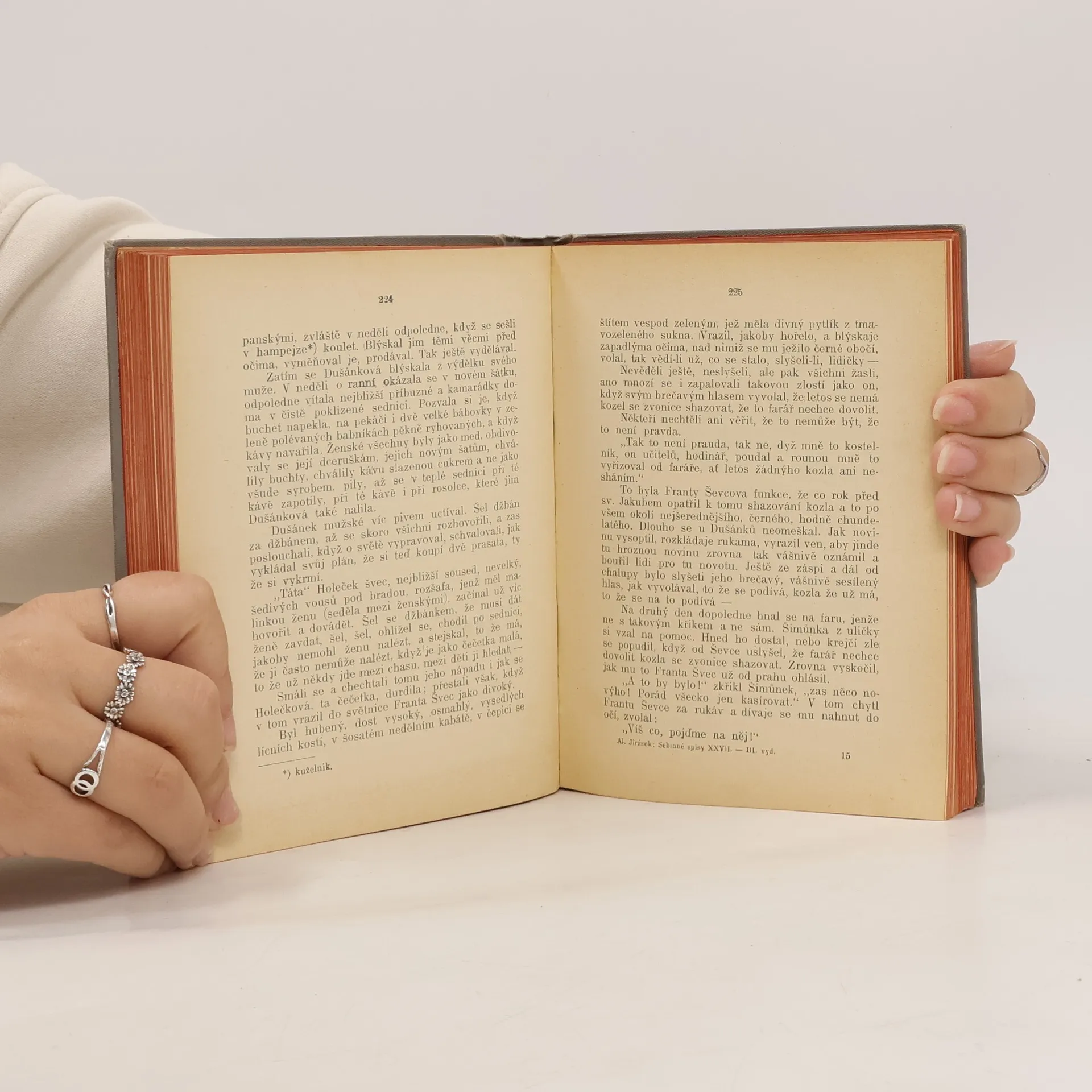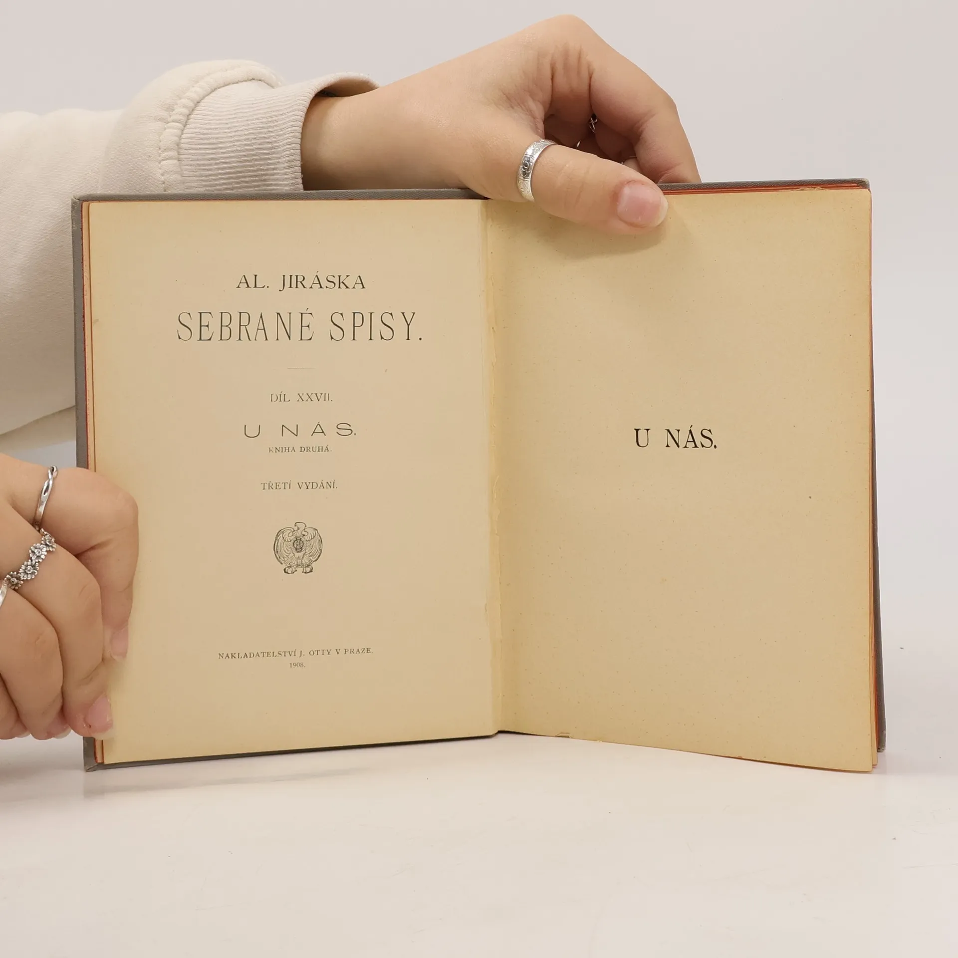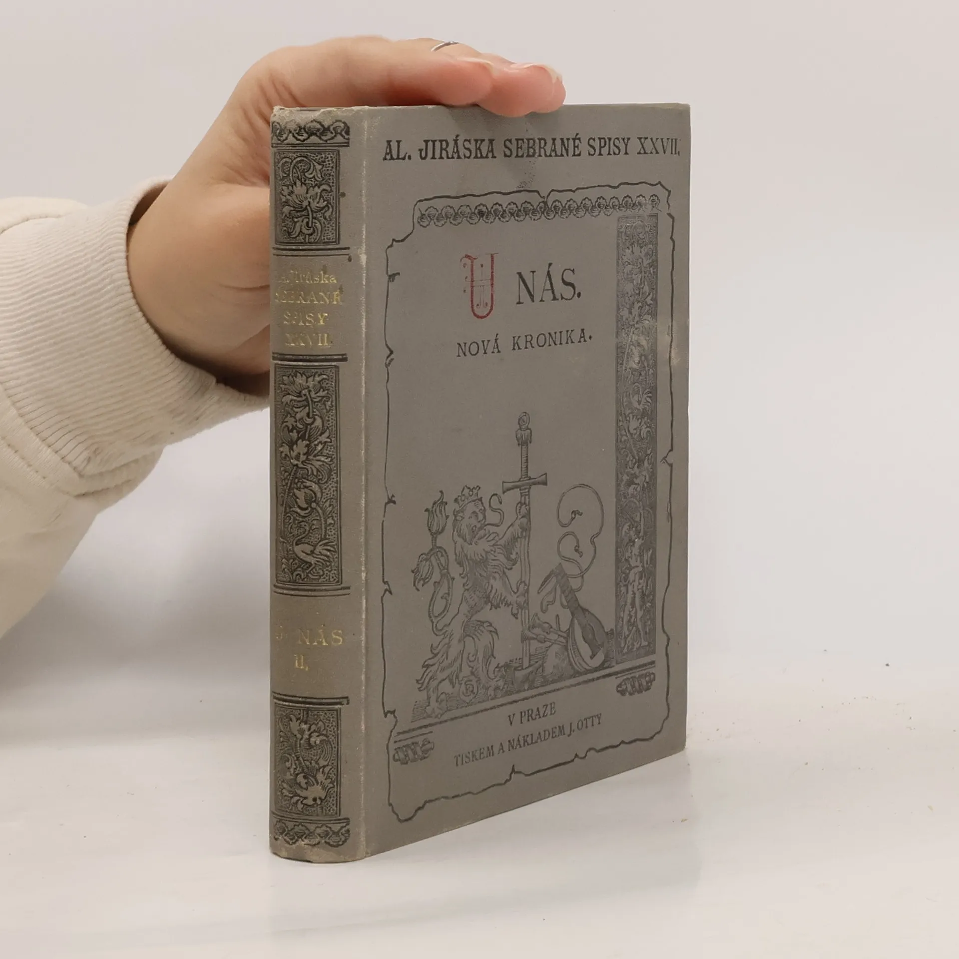 Alois Jirásek: U NÁS. Románová čtyřdílná kronika. Kniha prvá - ÚHOR. Psáno roku 1895 - 1896. Druhé vydání v roce 1926. Nakladatelství J. Otto, spol. s r.o. v Praze, edice: Nová kronika. Tiskem České grafické unie, a.s. v Praze. Vazba celoplátěná nakladatelská s barevným popisem nahřbetu, stužková záložka.