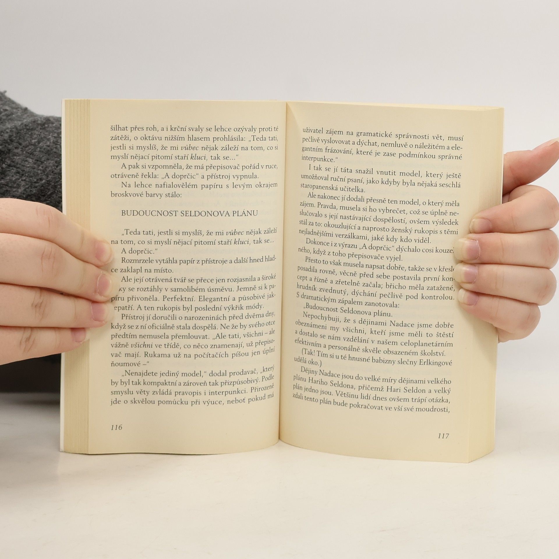 Seldonův plán leží v troskách – a s ním i impérium Nadace. Na Mezka, mutanta netušených psychických schopností, nestačily ani rovnice nejnadanějšího matematika všech dob. Vše však ještě není ztraceno: kdesi na druhém konci Galaxie se skrývá Drahá Nadace, v níž se i přes dlouhá století barbarství měly zachovat veškeré vědomosti lidstva. Mezkovi se Druhou Nadaci napoprvé nepodařilo najít. Teď si je jistý, že napodruhé to již vyjde. Osud lidstva spočívá v rukou Arkadie Darellové, čtrnáctileté dívky obtížené hrozným tajemstvím. A zatímco se vědci Druhé Nadace připravují na rozhodující střetnutí s Mezkem, zástupci přemožené První Nadace se vydávají do vesmíru na beznadějnou cestu. I oni chtějí přispět ke zkáze Druhé Nadace – dřív, než ona zničí je!