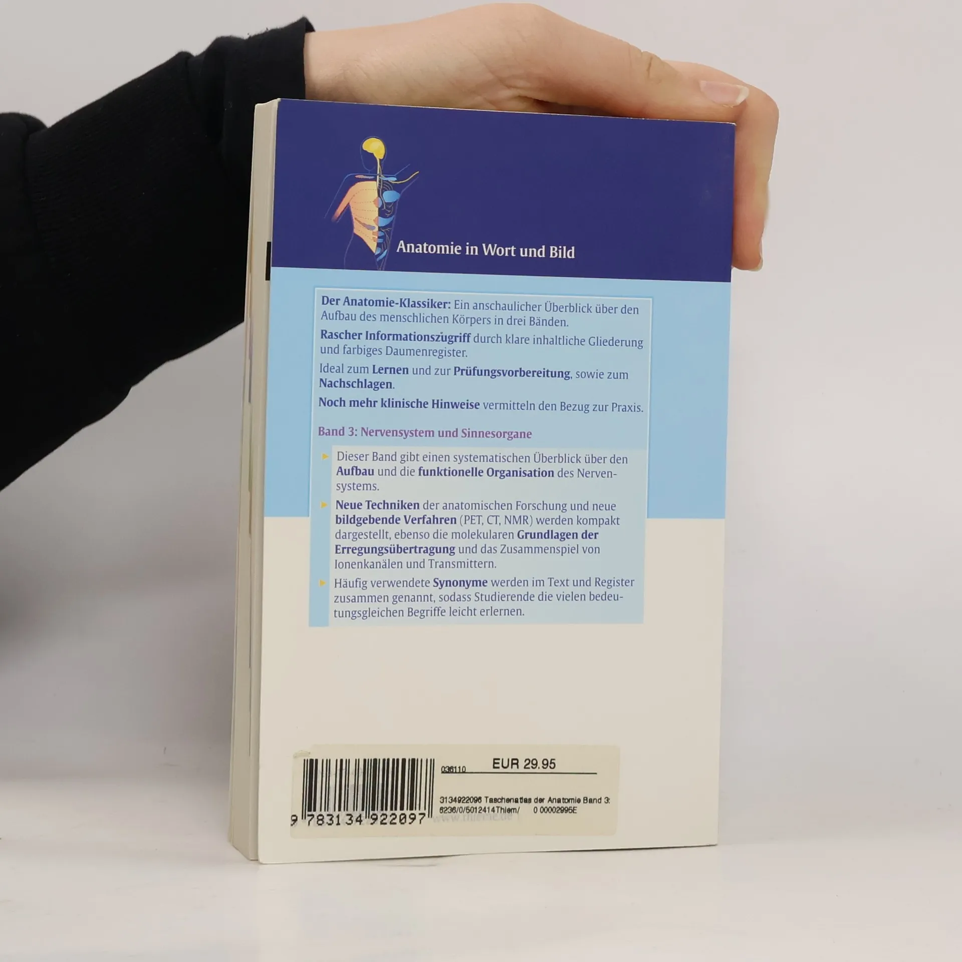 Im dritten Band wird dem Anfänger nicht nur eine Einführung in den elementaren Aufbau des Nervensystems und der Sinnesorgane, sondern auch in einfacher und knapper Form Einblick in den gegenwärtigen Stand der Erkenntnis gegeben: Ergebnisse der Elektronenmikroskopie, der Histochemie und Elektrophysiologie sind durch neue immunhistochemische und autoradiographisch gewonnene Forschungsergebnisse erweitert. Ebenfalls dargestellt werden Embryonalentwicklung und Hirnfunktion.