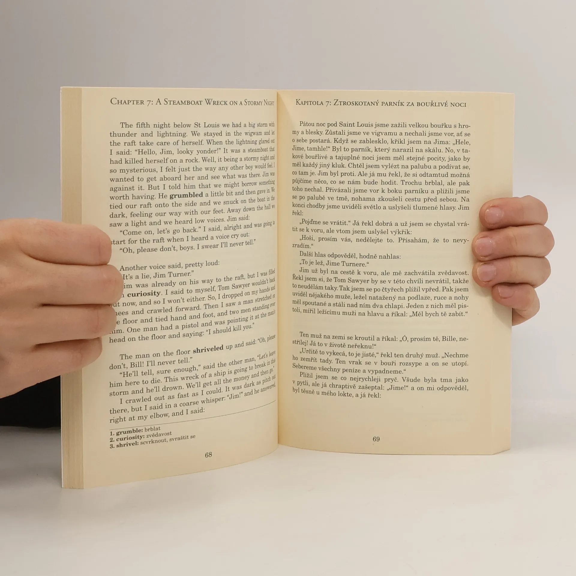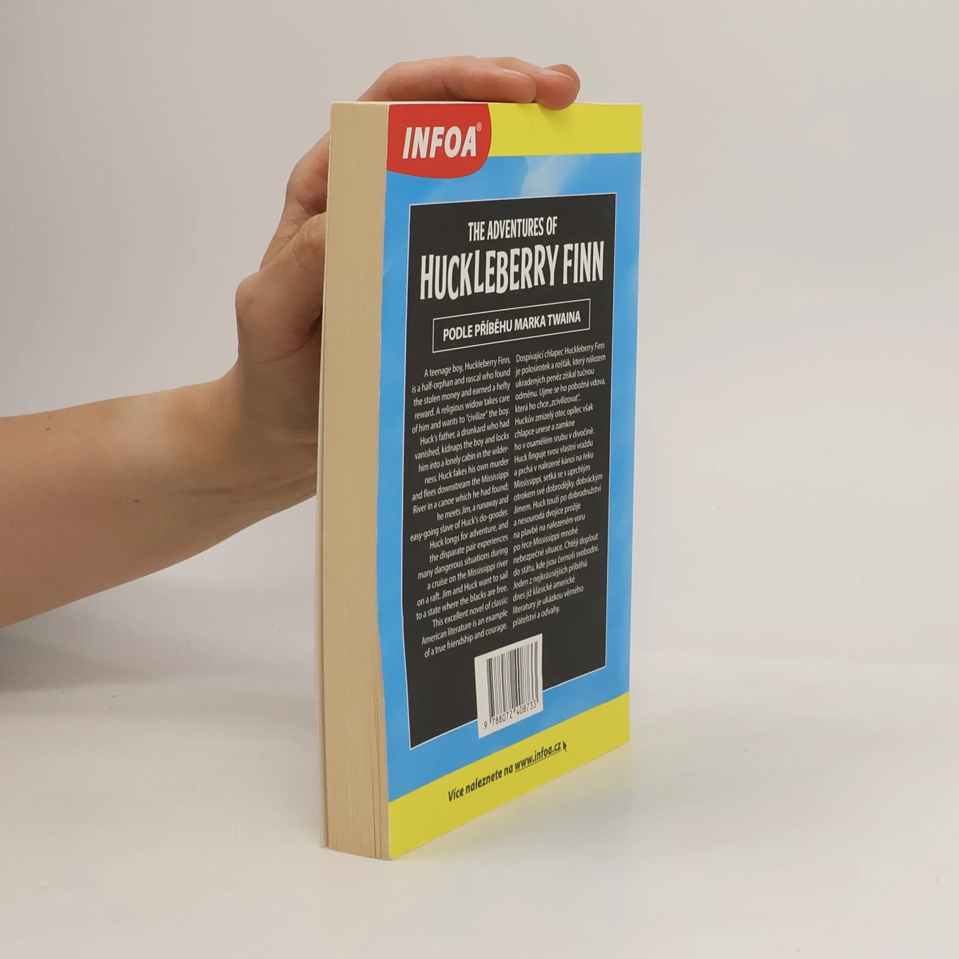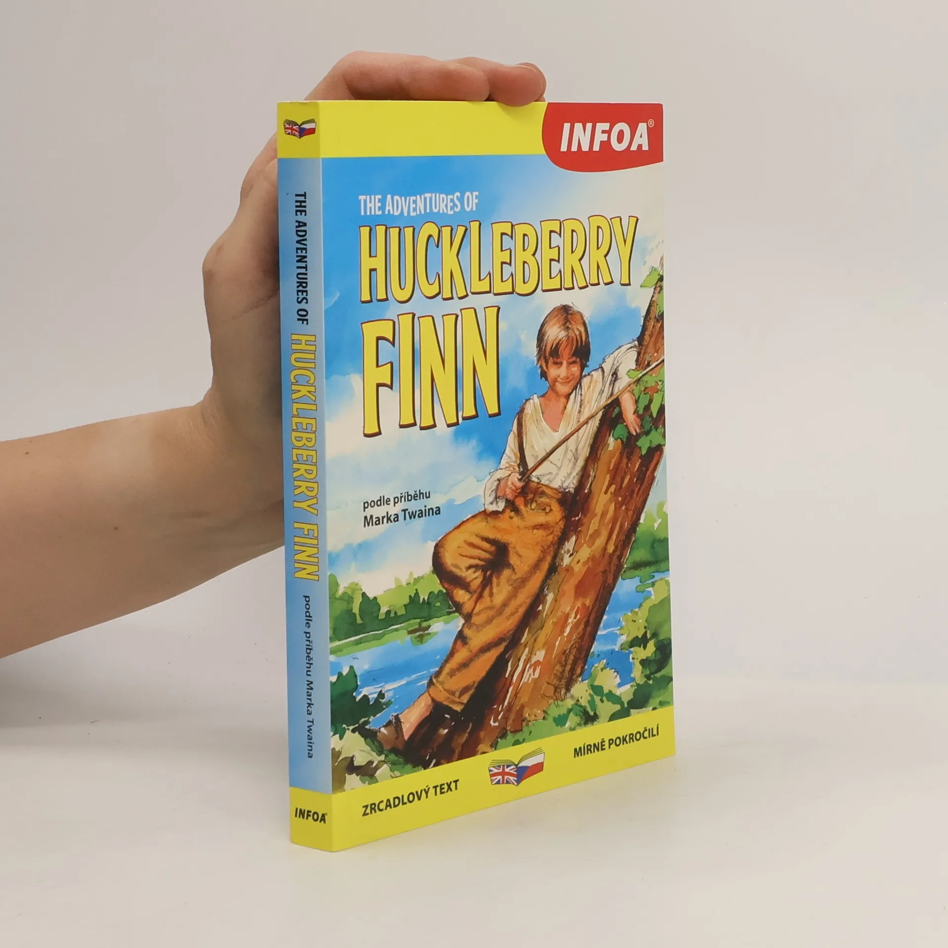 Převyprávěno podle příběhu Marka Twaina - souběžný česko-anglický text. Dospívající chlapec Huckleberry Finn je polosirotek a rošťák, který nálezem ukradených peněz získal tučnou odměnu. Ujme se ho pobožná vdova, která ho chce „zcivilizovat“. Huckův zmizelý otec opilec však chlapce unese a zamkne ho v osamělém srubu v divočině. Huck finguje svou vlastní vraždu a prchá v nalezené kánoi na řeku Mississippi, setká se s uprchlým otrokem své dobrodějky, dobráckým Jimem. Huck touží po dobrodružství a nesourodá dvojice prožije na plavbě na nalezeném voru po řece Mississippi mnohé nebezpečné situace.