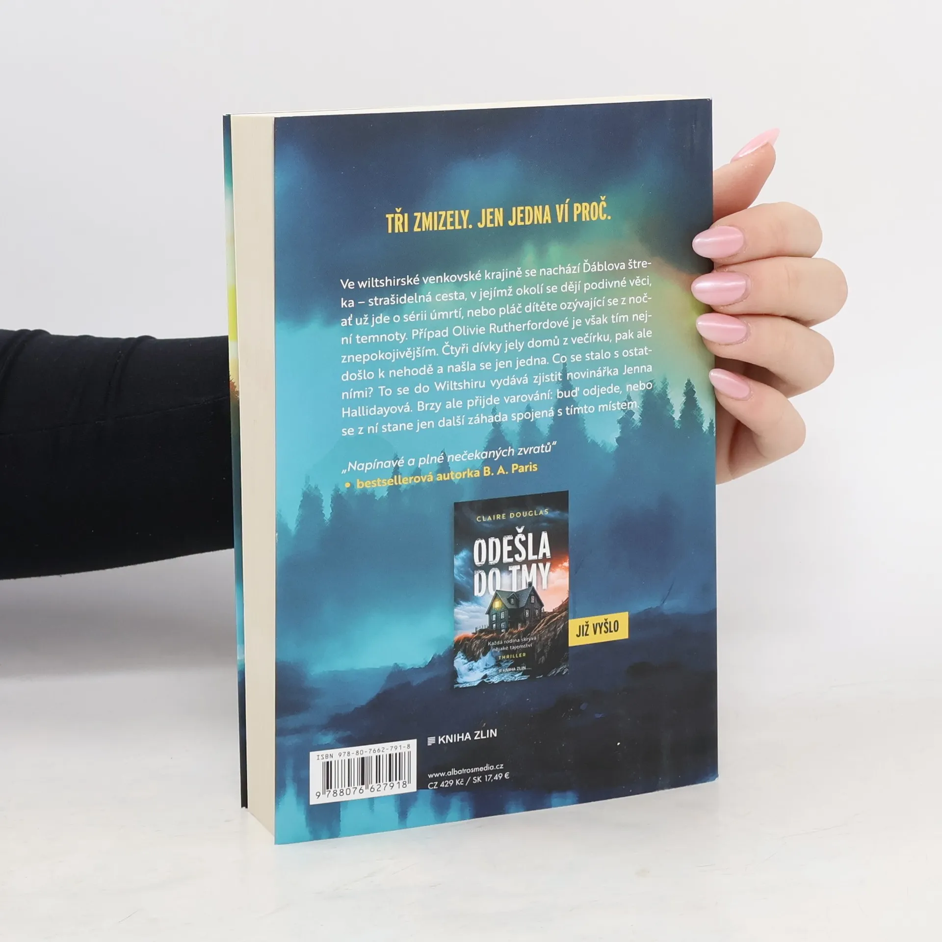 Tři zmizely. Jen jedna ví proč. Ve wiltshirské venkovské krajině se nachází Ďáblova štreka – strašidelná cesta, v jejímž okolí se dějí podivné věci, ať už jde o sérii úmrtí nebo pláč dítěte ozývající se z noční temnoty. Případ Olivie Rutherfordové je však tím nejznepokojivějším. Čtyři dívky jely domů z večírku, pak ale došlo k nehodě a našla se jen jedna. Co se stalo s ostatními? To se do Wiltshiru vydává zjistit novinářka Jenna Hallidayová. Brzy ale přijde varování: buď odjede, nebo se z ní stane jen další záhada spojená s tímto místem. Po knize Odešla do tmy se českým čtenářům představuje další mysteriózní detektivní thriller oblíbené autorky Claire Douglas.
