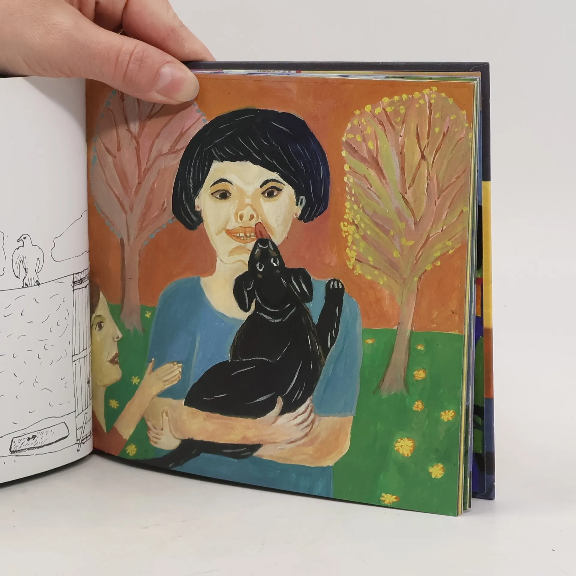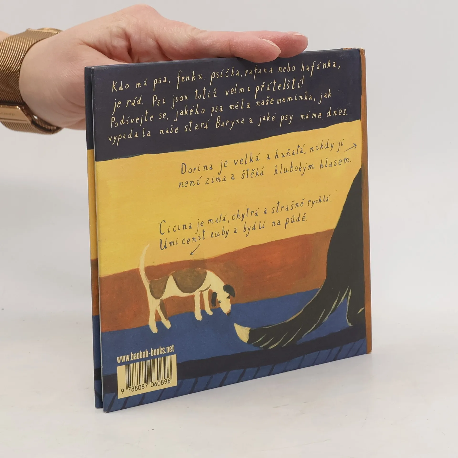 Kdo má psa, fenku, psíčka, rafana nebo hafánka je moc rád, psi jsou totiž velmi přátelští! Podívejte se jakého psa měla naše maminka, jak vypadala naše stará Baryna a jaké psy máme dnes. Cicina je malá, chytrá a strašně rychlá. Umí cenit zuby a bydlí na půdě. Dorina je velká a huňatá, nikdy jí není zima a štěká hlubokým hlasem. Tereza Říčanová opět bez sentimentu a tentokrát skrze psy, vypráví slovem i obrazem o domově a každodenních maličkostech, ale taky o zrození, smrti a věrnosti, jak jinak. Tereza Říčanová je ztělesněním autorského pohledu na dětskou literaturu. Tato malířka, spisovatelka a performerka je jako vichřice: razantní malby, které jistě ovlivnil jak expresionismus, tak tvorba naivistů, lapidární a přitom nezaměnitelně krásné texty inspirované dětskou myslí, to vše tvoří dohromady knihy, které otevírají dětem zcela jedinečný pohled na lidský život. Ten je v jejím podání vždy svázán se základními otázkami lidského bytí: ať už vypráví o slavení svátků nebo o kozách... všednost venkovských dnů je existence sama: zpěv písní, biblické příběhy, zvířecí i lidský koloběh. A tak je to i v Psí knížce, volném pokračování autorčiny série ze života na statku.