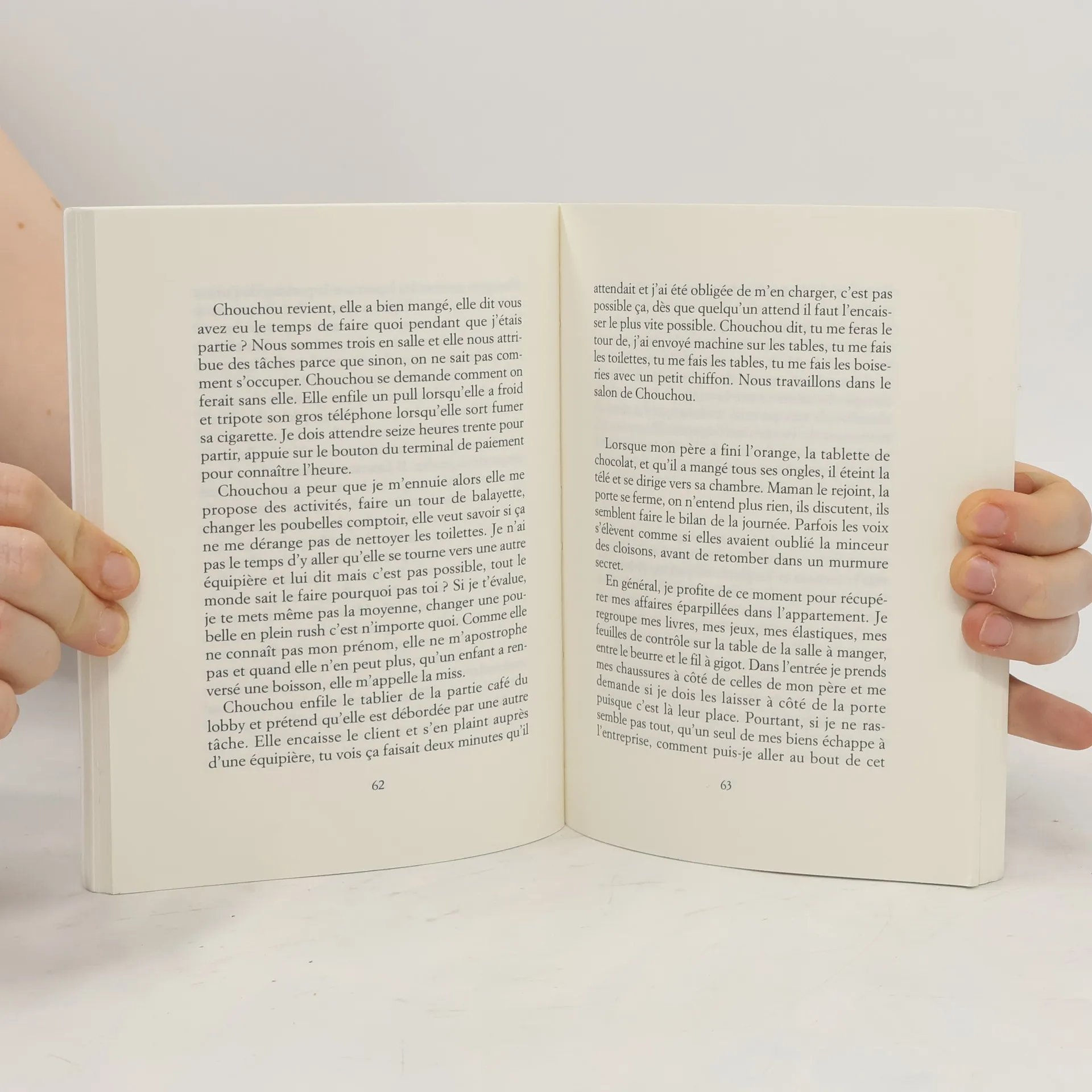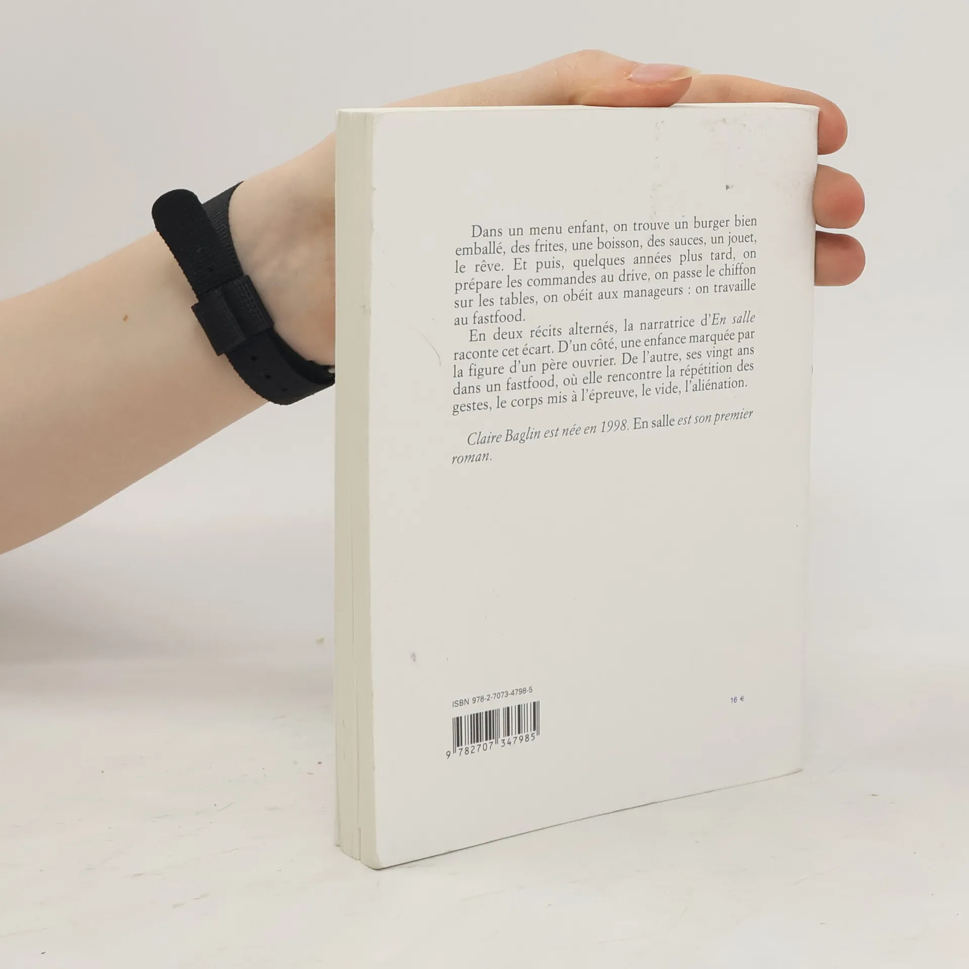 Dans un menu enfant, on trouve un burger bien emballé, des frites, une boisson, des sauces, un jouet, le rêve. Et puis, quelques années plus tard, on prépare les commandes au drive, on passe le chiffon sur les tables, on obéit aux manageurs : on travaille au fastfood. En deux récits alternés, la narratrice d'En salle raconte cet écart. D'un côté, une enfance marquée par la figure d'un père ouvrier. De l'autre, ses vingt ans dans un fastfood, où elle rencontre la répétition des gestes, le corps mis à l'épreuve, le vide, l'aliénation.