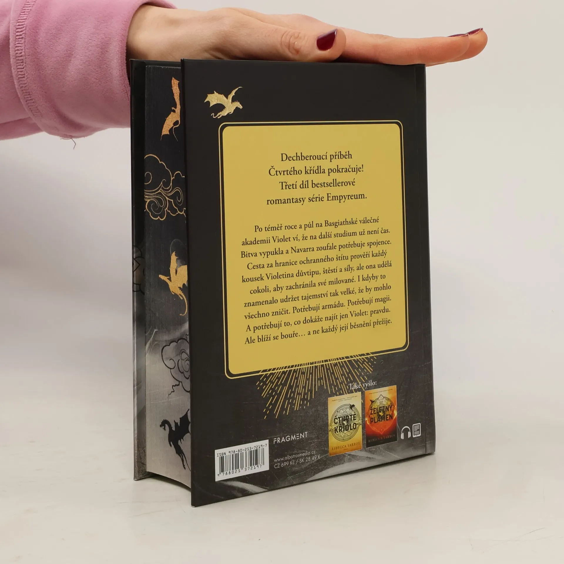 Dechberoucí příběh Čtvrtého křídla pokračuje! Třetí díl bestsellerové romantasy série Empyreum. Po téměř roce a půl na Basgiathské válečné akademii Violet ví, že na další studium už není čas. Bitva vypukla a Navarra zoufale potřebuje spojence. Cesta za hranice ochranného štítu prověří každý kousek Violetina důvtipu, štěstí a síly, ale ona udělá cokoli, aby zachránila své milované. I kdyby to znamenalo udržet tajemství tak velké, že by mohlo všechno zničit. Potřebují armádu. Potřebují magii. A potřebují to, co dokáže najít jen Violet: pravdu. Ale blíží se bouře… a ne každý její běsnění přežije.