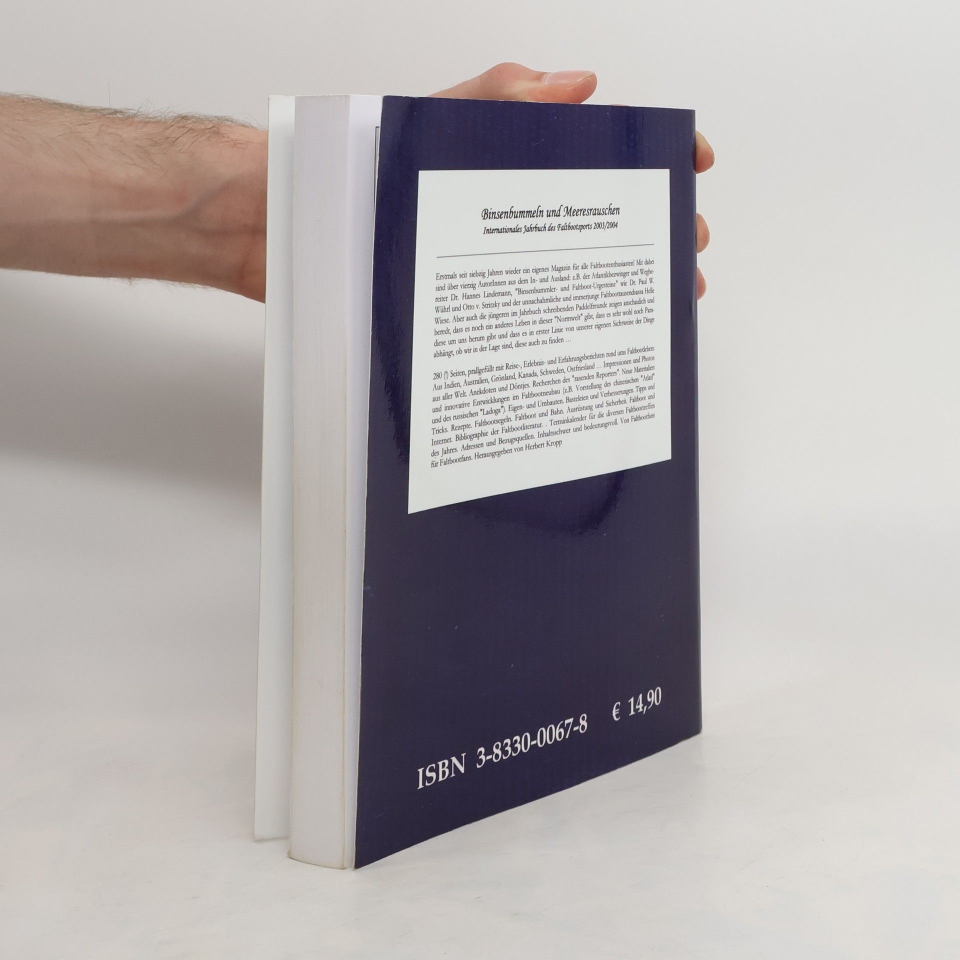 Seit den 70erJahren das 1. Buch für Faltbootenthusiasten (daher auch kein Vergleichstitel). Das Buch enthält Reise, Erlebnis und Erfahrungsberichte rund um das Faltboot. Es kommen 40 Autoren aus dem In und Ausland zu Wort. Jedem stehen etwa 2 bis 15 Seiten zur Verfügung. Von den einzelnen Autoren werden auch Anleitungen zum individuellen Umbau sowie Tipps für Basteleien und Verbesserungen am Faltboot gegeben. Bei guter Verschlagwortung findet man auch Hinweise auf Ausrüstung und Sicherheit, das Faltboot im Internet, eine ausführliche Bibliographie zur Faltbootliteratur und einen Terminkalender mit Faltboottreffen. Interessante und mit viel Engagement geschriebene Tagebuchaufzeichnungen runden den Band ab. Überwiegend Text, kleine SchwarzWeißFotos, Skizzen und Zeichnungen. Für Faltbootfans eine wahre Fundgrube. (3