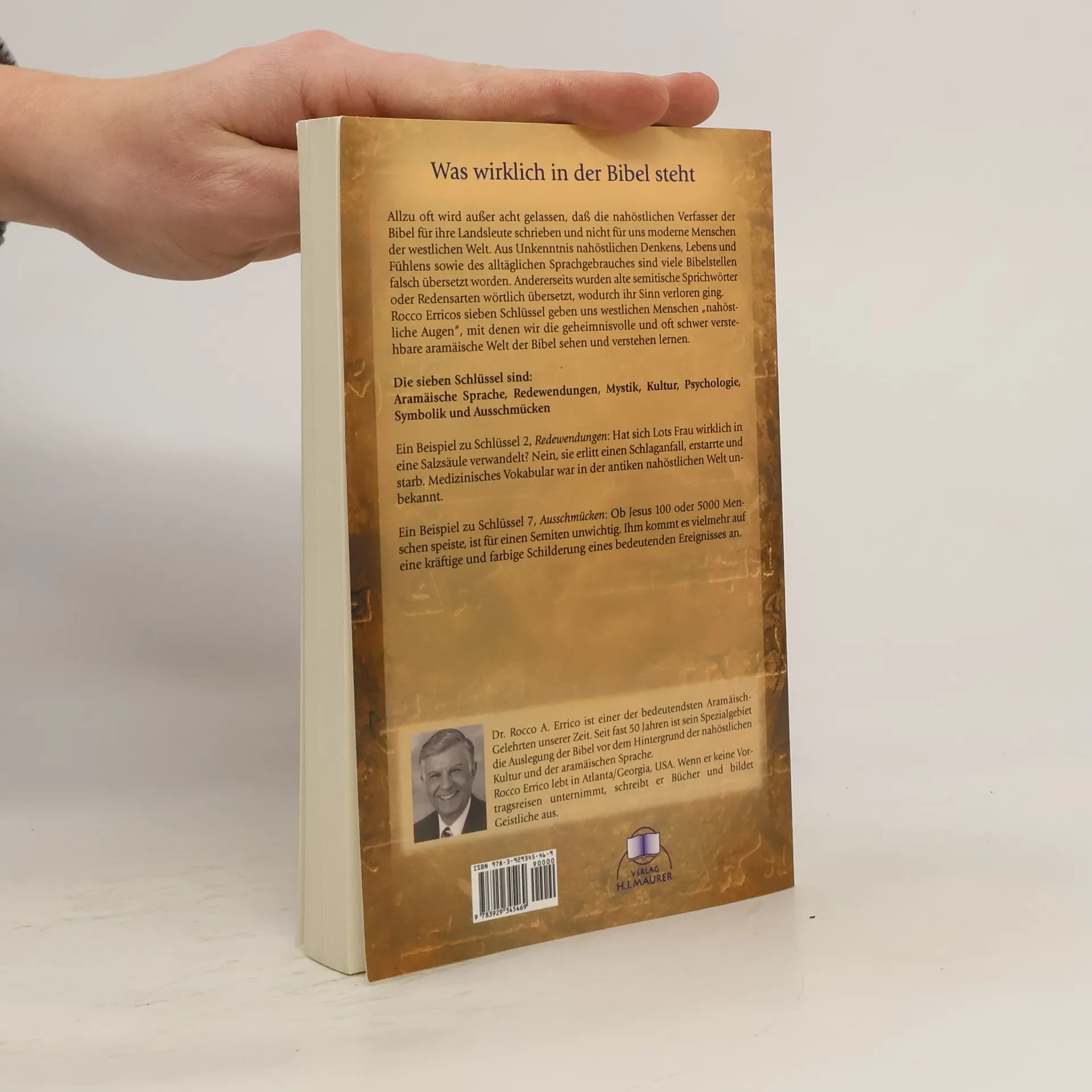 Trotz ihrer universellen Weisheit ist die Bibel ein nahöstliches Buch, das für Menschen des Nahen Ostens geschrieben wurde. Jede ihrer Seiten spiegelt nahöstliches Denken und Fühlen, Sitten, Gebräche, Redeweise und ausmalende Erzählkunst wider. Diese zumeist übersehene Tatsache fordert auf, darüber nachzudenken, ob die Bibel wortwörtlich zu verstehen ist oder ob sich buchstäbliche Deutung nicht geradezu verbietet. Wie kann man erkennen, was wirklich gemeint ist? Wie wurden die biblischen Geschichten ursprünglich verstanden? Ist die Bibel überhaupt richtig übersetzt? Diese und viele weitere Fragen beantwortet Dr. Rocco Errico in diesem Buch. Unter Zuhilfenahme seiner „sieben Schlüssel“ und aramäischer Bibelmanuskripte baut er eine Brücke zwischen unserem westlichen Denken und den sozialen Gegebenheiten des antiken Nahen Ostens. Jahrhundertlang missverstandene oder widersprüchlich erscheinende Bibelverse werden dadurch (oft überraschend) erhellt und ihre Bedeutung, die immer einfach und unkompliziert war, erkannt.