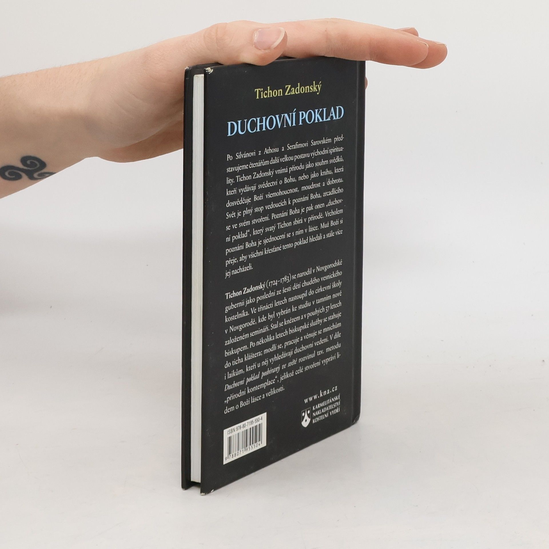 Po Silvánovi z Athosu a Serafimovi Sarovském představujeme čtenářům další velkou postavu východní spirituality. Tichon Zadonský vnímá přírodu jako souhrn svědků, kteří vydávají svědectví o Bohu, nebo jako knihu, která dosvědčuje Boží všemohoucnost, moudrost a dobrotu. Svět je plný stop vedoucích k poznání Boha, zrcadlícího se ve svém stvoření. Poznání Boha je pak onen „duchovní poklad“, který svatý Tichon sbírá v přírodě. Vrcholem poznání Boha je sjednocení s ním v lásce. Muž Boží si přeje, aby všichni křesťané tento poklad hledali a stále více jej nacházeli. Tichon Zadonský (1724-1783) se narodil v Novgorodské gubernii jako poslední ze šesti dětí chudého vesnického kostelníka. Ve třinácti letech nastoupil do církevní školy v Novgorodě, kde byl vybrán ke studiu v tamním nově založeném semináři. Stal se knězem a v pouhých 37 letech biskupem. Po několika letech biskupské služby se stahuje do ticha kláštera; modlí se, pracuje a věnuje se mnichům i laikům, kteří u něj vyhledávají duchovní vedení. V díle Duchovní poklad posbíraný ve světě rozvinul tzv. metodu „přírodní kontemplace“, jelikož celé stvoření vypráví lidem o Boží lásce a velikosti.