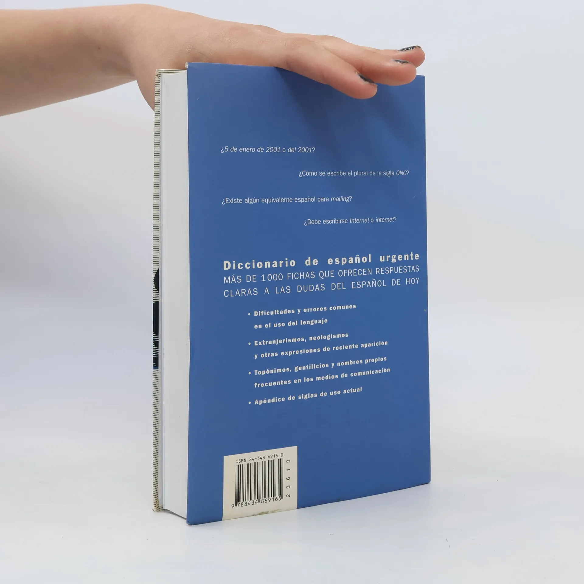 Diccionario de español que contiene: - Dificultades y errores comunes en el uso del lenguaje - Extranjerismos, neologismos y otras expresiones de reciente aprarición - Topónimos, gentilicios y nombres propios frecuentes en los medios de comunicación - Apéndice de siglas de uso actual.