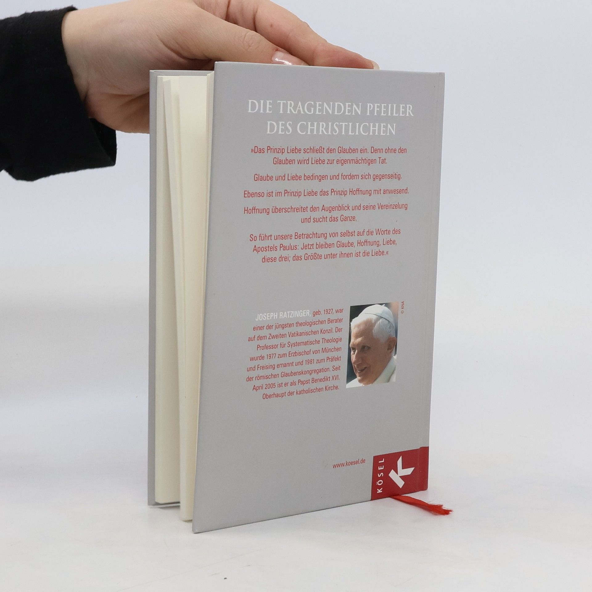 This book offers 365 thought-provoking impulses, excerpted from “Introduction to Christianity” (“Einführung in das Christentum. Vorlesungen über das Apostolische Glaubensbekenntnis”), published by the same author.Back of the Die tragenden Pfeiler des Christlichen – “Das Prinzip Liebe schließt den Glauben ein. Denn ohne den Glauben wird Liebe zur eigenmächtigen Tat.Glaube und Liebe bedingen und fordern sich gegenseitig.Ebenso ist im Prinzip Liebe das Prinzip Hoffnung mit anwesend.Hoffnung überschreitet den Augenblick und seine Vereinzelung und sucht das Ganze.So führt unsere Betrachtung von selbst auf die Worte des Apostels Jetzt bleiben Glaube, Hoffnung, Liebe, diese drei; das Größte unter ihnen ist die Liebe.“