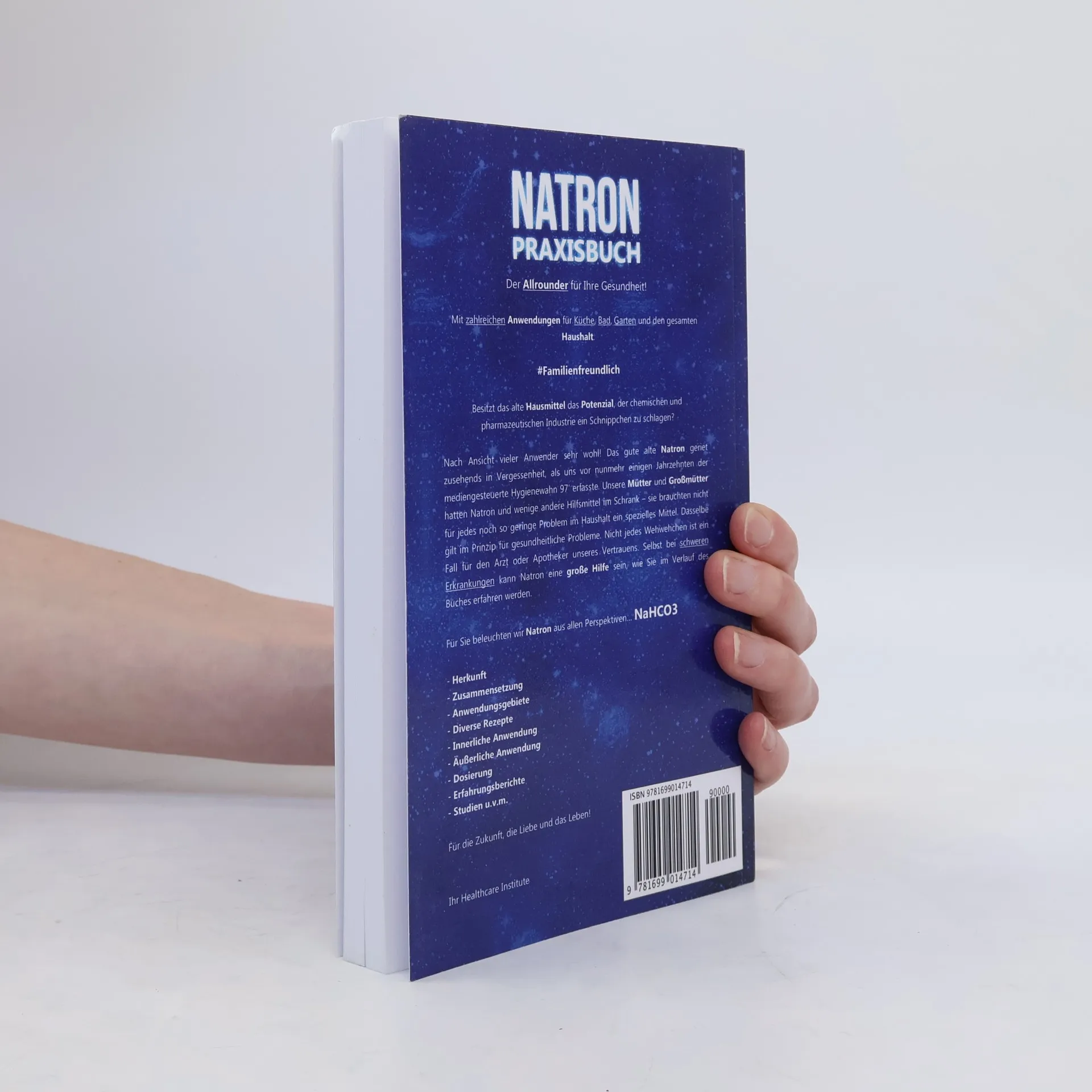 Besitzt das alte Hausmittel das Potenzial , der chemischen und pharmazeutischen Industrie ein Schnippchen zu schlagen ? Nach Ansicht vieler Anwender sehr wohl! Das gute alte Natron geriet zusehends in Vergessenheit, als uns vor nunmehr einigen Jahrzehnten der mediengesteuerte Hygienewahn 97‘ erfasste. Unsere Mütter und Großmütter hatten Natron und wenige andere Hilfsmittel im Schrank – sie brauchten nicht für jedes noch so geringe Problem im Haushalt ein spezielles Mittel. Dasselbe gilt im Prinzip für gesundheitliche Probleme . Nicht jedes Wehwehchen ist ein Fall für den Arzt oder Apotheker unseres Vertrauens. Selbst bei schweren Erkrankungen kann Natron eine große Hilfe sein, wie Sie im Verlauf des Buches erfahren werden.In diesem Praxisbuch beleuchten wir den Allrounder Natron aus allen Perspektiven!Für die Zukunft , die Liebe und das Leben !Ihr Healthcare Institute