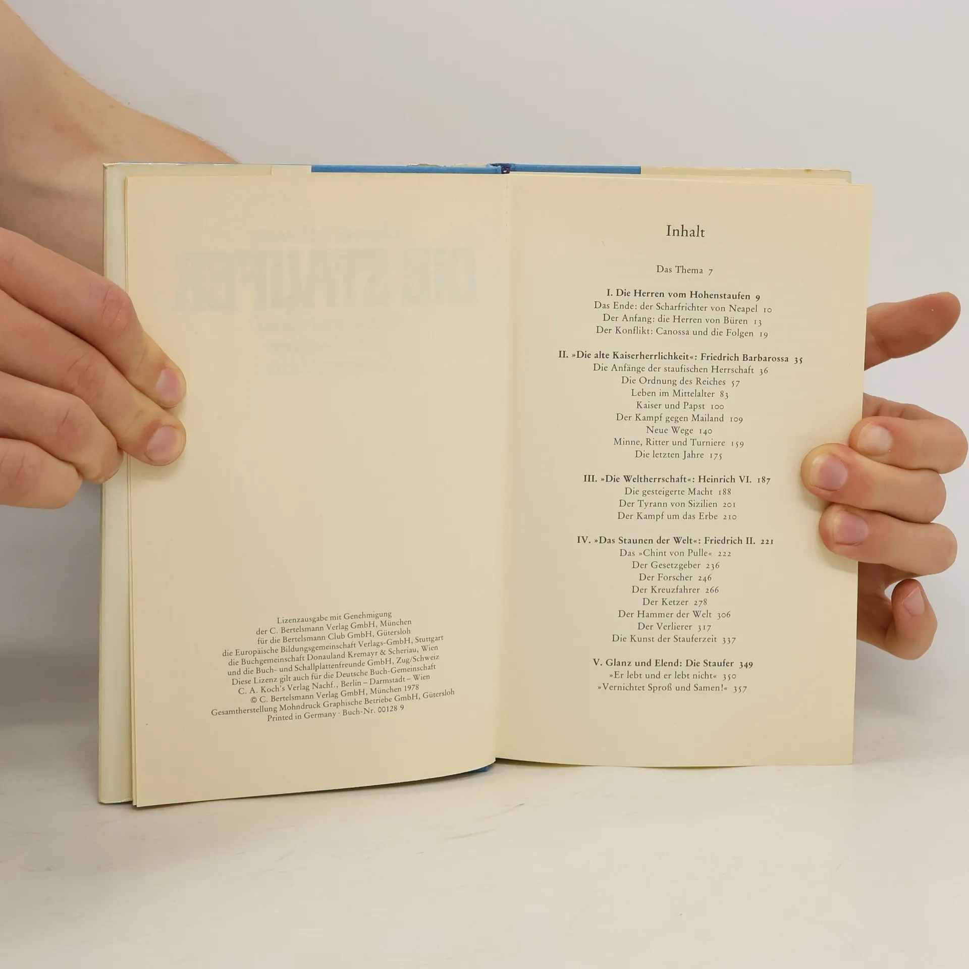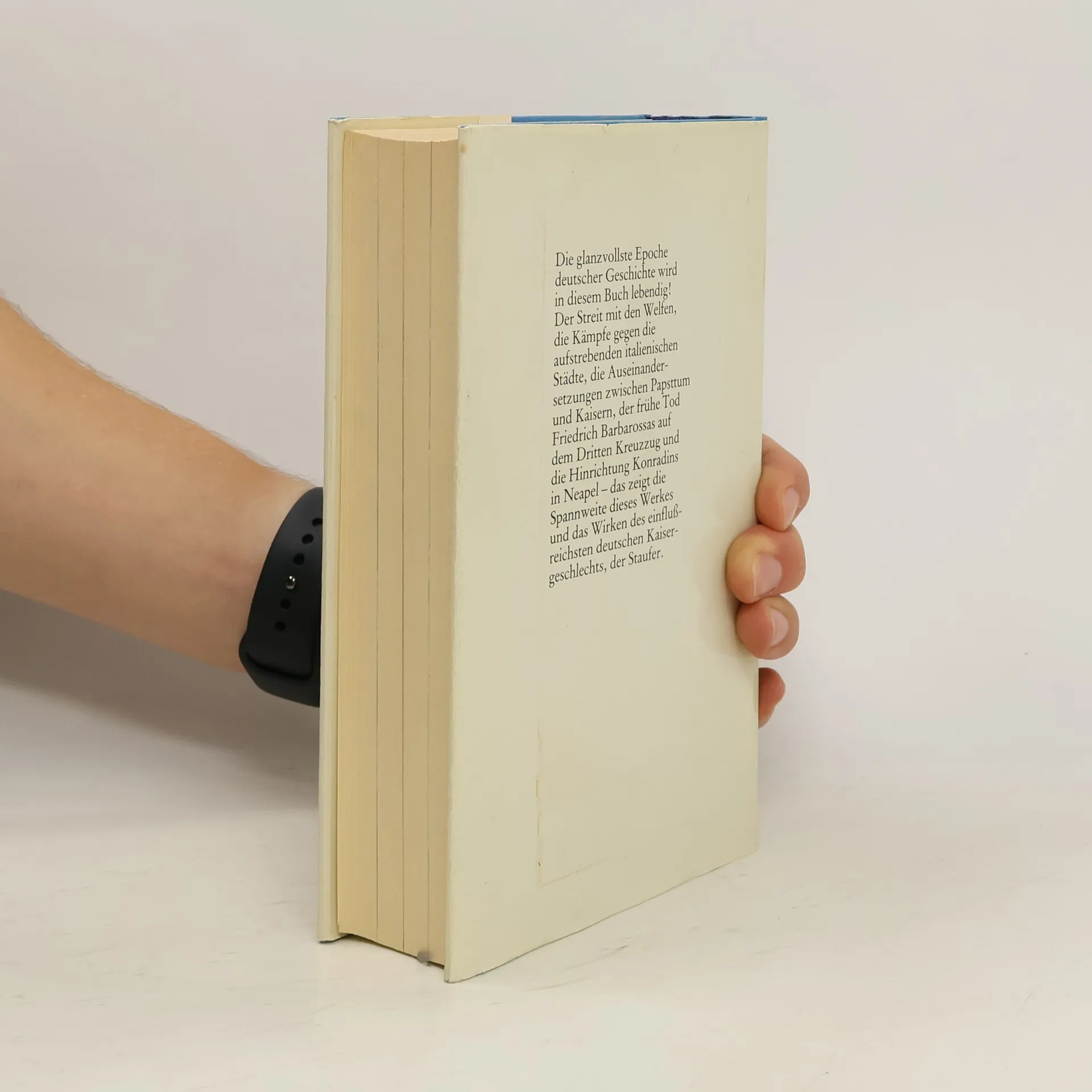 Buchrücken:"Der Streit mit den Welfen, die Kämpfe gegen die aufstrebenden italienischen Städte, die Auseinandersetzungen zwischen Papsttum und Kaisern, der frühe Tod Friedrich Barbarossas auf dem Dritten Kreuzzug und die Hinrichtung Konradins in Neapel - das zeigt die Spannweite dieses Werkes und das Wirken des einflußreichsten deutschen Kaisergeschlechts, der Staufer."