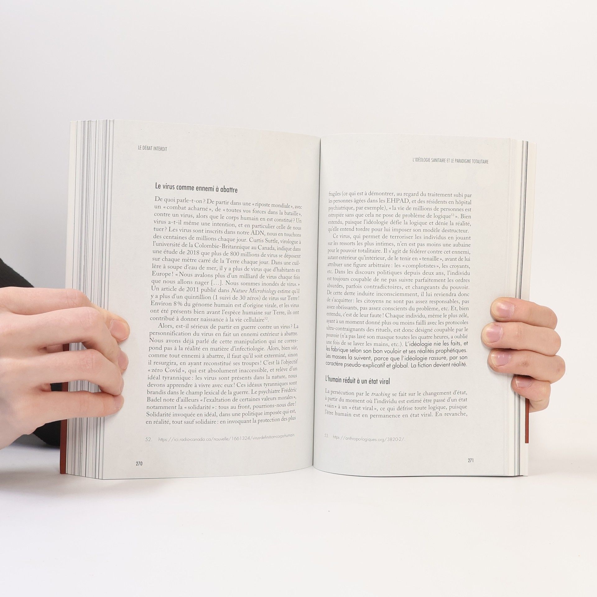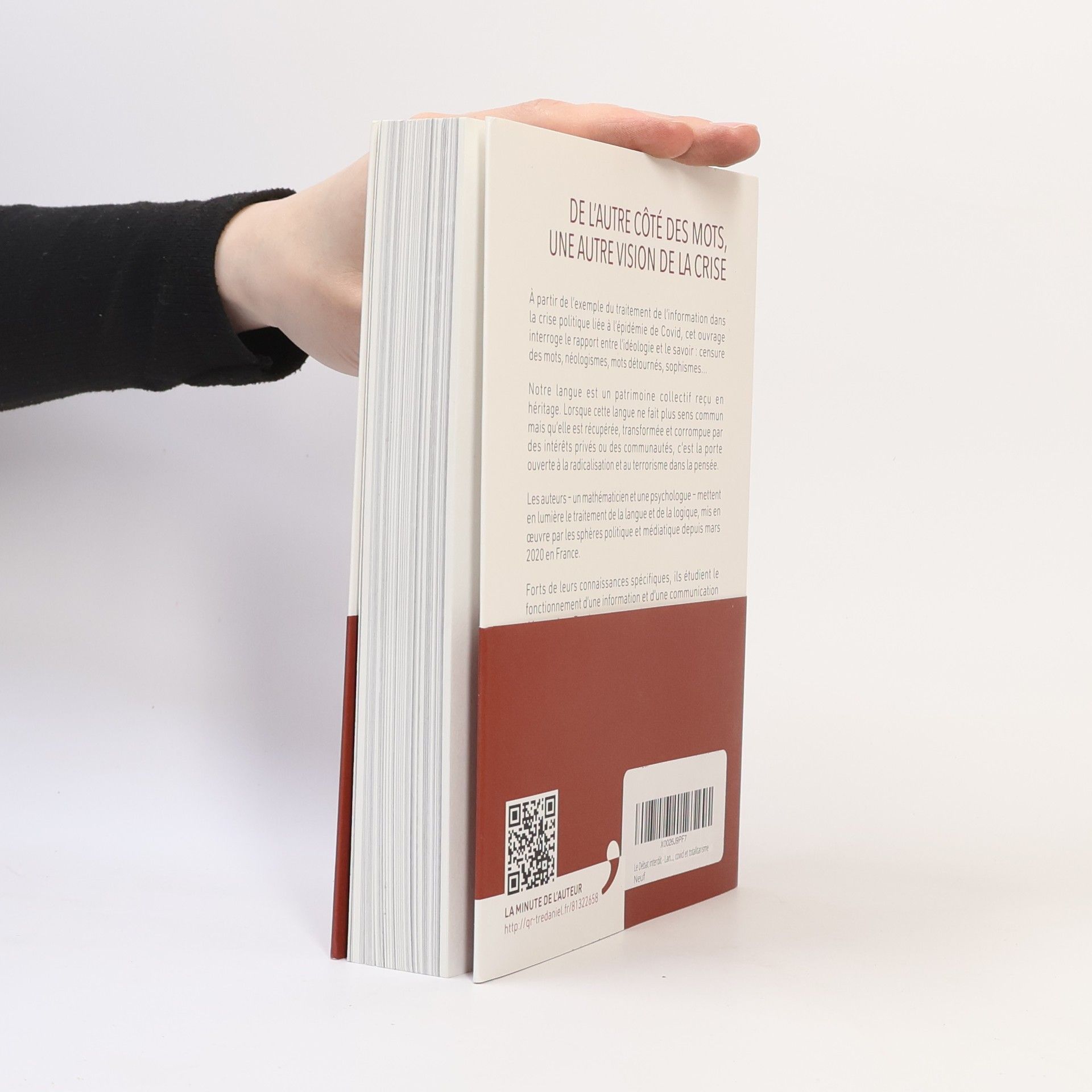 "De l'autre côté des mots, une autre vision de la crise. À partir de l'exemple du traitement de l'information dans la crise politique liée à l'épidémie de Covid, cet ouvrage interroge le rapport entre l'idéologie et le savoir : censure des mots, néologismes, mots détournés, sophismes... Notre langue est un patrimoine collectif reçu en héritage. Lorsque cette langue ne fait plus sens commun mais qu'elle est récupérée, transformée et corrompue par des intérêts privés ou des communautés, c'est la porte ouverte à la radicalisation et au terrorisme dans la pensée. Les auteurs - un mathématicien et une psychologue - mettent en lumière le traitement de la langue et de la logique, mis en œuvre par les sphères politique et médiatique depuis mars 2020 en France. Forts de leurs connaissances spécifiques, ils étudient le fonctionnement d'une information et d'une communication détournées. En s'appuyant sur des arguments sourcés et chiffrés, ils mettent en lumière la déconstruction des « vérités » scientifiques avancées par le gouvernement pour justifier ses actions politiques. Ils proposent une analyse détaillée de la « nouvelle langue », de la « nouvelle normalité » et des méthodes de contrainte psychique utilisées sur la population française. Où est la vérité ?"--Éditeur