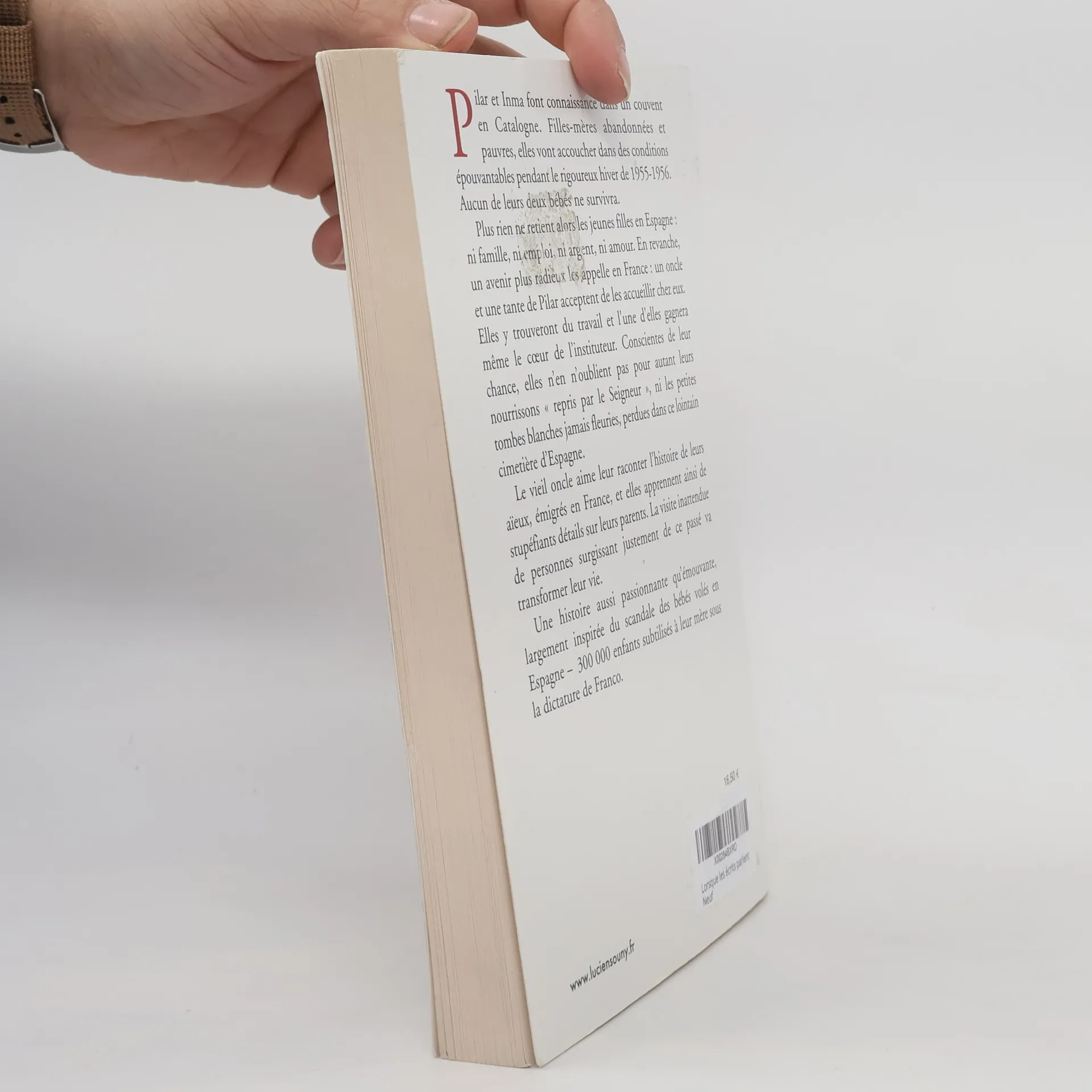Pilar et Inma font connaissance dans un couvent en Catalogne. Filles-mres abandonnes et pauvres, elles vont accoucher dans des conditions pouvantables pendant le rigoureux hiver de 1955-1956. Aucun de leurs deux bbs ne survivra. Plus rien ne retient alors les deux jeunes filles en Espagne : ni famille, ni emploi, ni argent, ni amour. En revanche, un avenir plus radieux les appelle en France : un oncle et une tante de Pilar acceptent de les accueillir chez eux. Elles y trouveront du travail et l'une d'elles gagnera mme le coeur de l'instituteur. Conscientes de leur chance, elles n'en n'oublient pas pour autant leurs nourrissons " repris par le Seigneur ", ni les petites tombes blanches jamais fleuries, perdues dans ce lointain cimetire d'Espagne. Le vieil oncle aime leur raconter l'histoire de leurs aeux, migrs en France, et elles apprennent ainsi de stupfiants dtails sur leurs parents. La visite inattendue de personnes surgissant justement de ce pass va transformer leur vie. Une histoire aussi passionnante qu'mouvante, largement inspire du scandale des bbs vols en Espagne 300 000 enfants subtiliss leur mre sous la dictature de Franco.