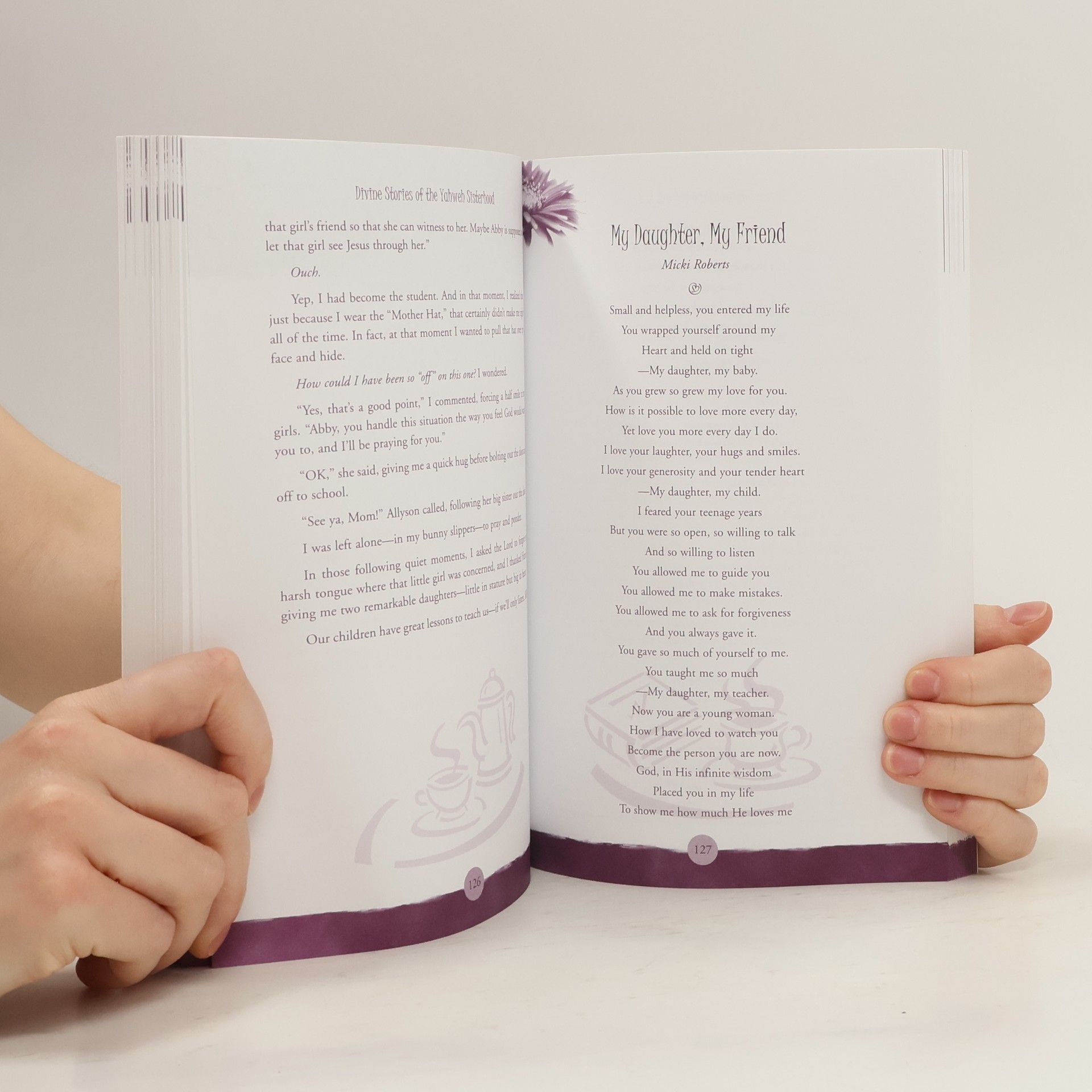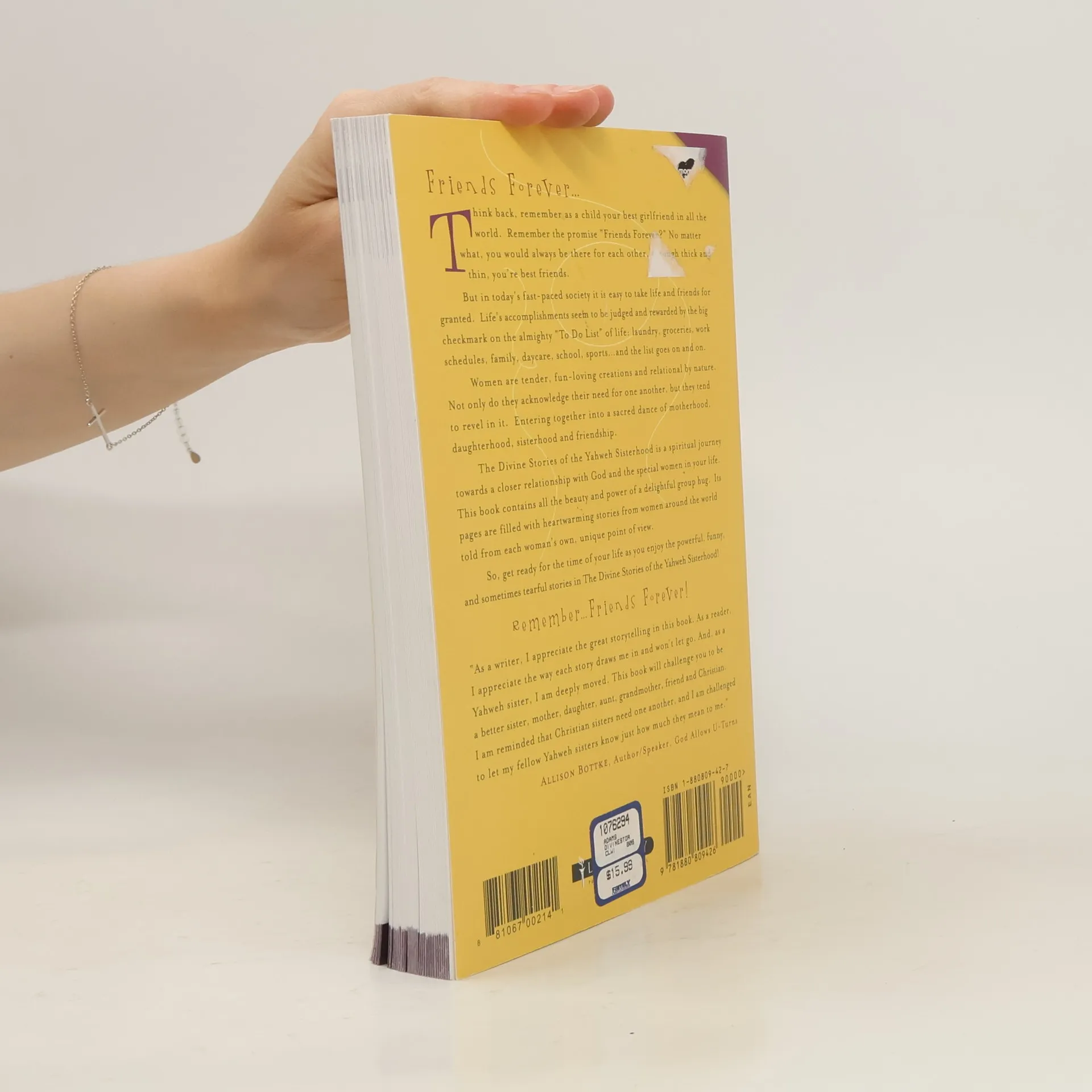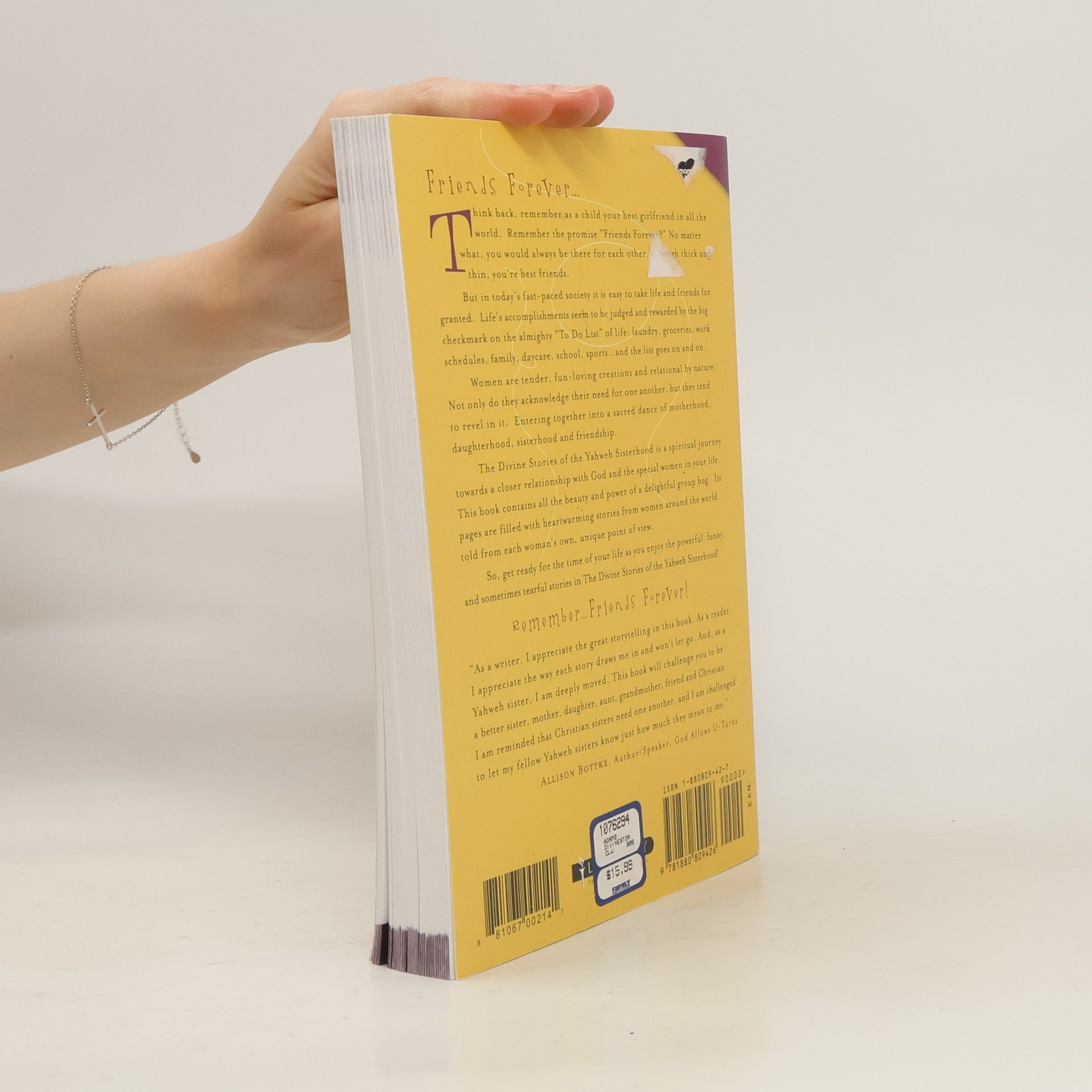 Friends Forever. Think back, remember as a child your best girlfriend in all the world. Remember the promise "Friends Forever?" No matter what, you would always be there for each other, through thick and thin, you're best friends. But in today's fast-paced society it is easy to take life and friends for granted. Life's accomplishments seem to be judged and rewarded by the big checkmark on the almighty "To Do List" of laundry, groceries, work, schedules, family, daycare, school, sports . . . and the list goes on and on. Women are tender, fun-loving creations and relational by nature. Not only do they acknowledge their need for one another, but they tend to revel in it. Entering together into a sacred dance of motherhood, daughterhood, sisterhood and friendship. The Divine Stories of the Yahweh Sisterhood is a spiritual journey towards a closer relationship with God and the special women in your life. This book contains all the beauty and power of a delightful group hug. Its pages are filled with heartwarming stories from women around the world told from each woman's own, unique point of view. So, get ready for the time of your life as you enjoy the powerful, funny, and sometimes tearful stories in The Divine Stories of the Yahweh Sisterhood! Remember . . . Friends Forever!