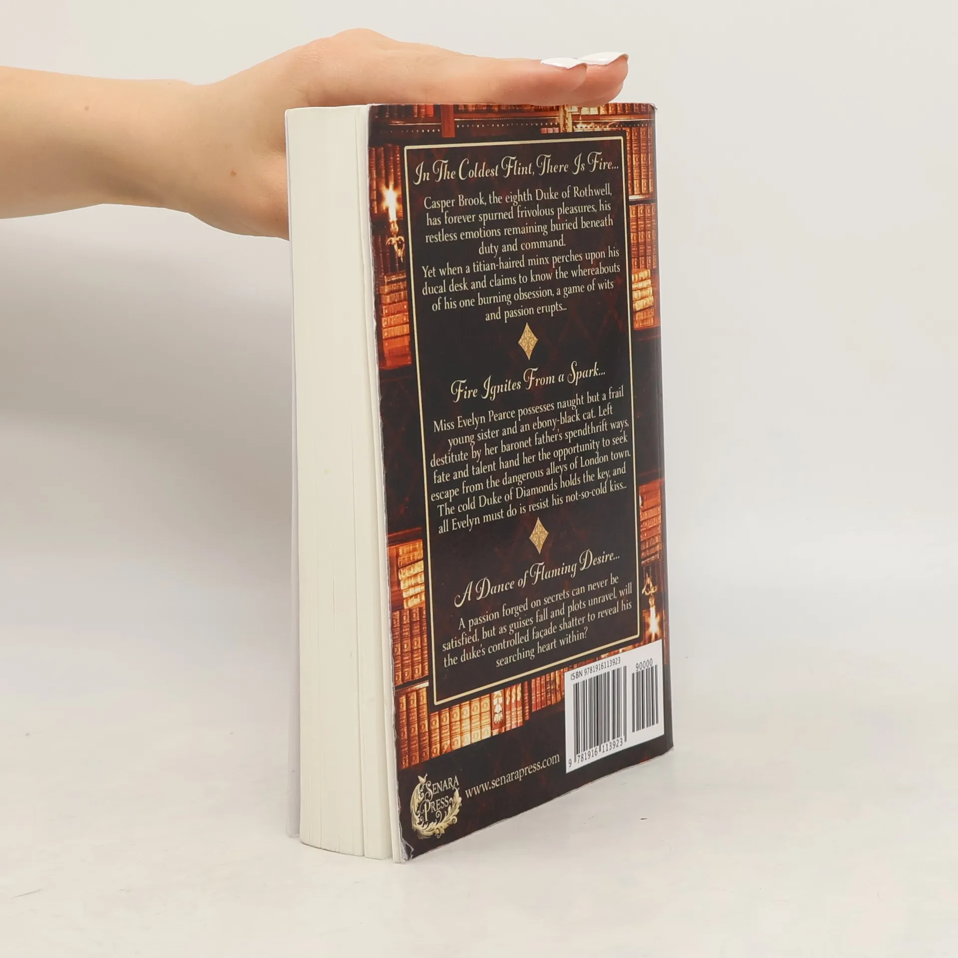 In the coldest flint, there is fire...Casper Brook, the eighth Duke of Rothwell, has forever spurned frivolous pleasures, his restless emotions remaining buried beneath duty and command.Yet when a titian-haired minx perches upon his ducal desk and claims to know the whereabouts of his one burning obsession, a game of wits and passion erupts... Fire ignites from a spark...Miss Evelyn Pearce possesses naught but a frail young sister and an ebony-black cat. Left destitute by her baronet father's spendthrift ways, fate and talent hand her the opportunity to seek escape from the dangerous alleys of London town.The cold Duke of Diamonds holds the key, and all Evelyn must do is resist his not-so-cold kiss... A dance of flaming desire...A passion forged on secrets can never be satisfied, but as guises fall and plots unravel, will the duke's controlled façade shatter to reveal his searching heart within?Regency romance with warmth and wit. This book contains sensual scenes.From the bestselling author of Amazon No.1 Regency Romance, Let Sleeping Dukes Lie, comes a new series...