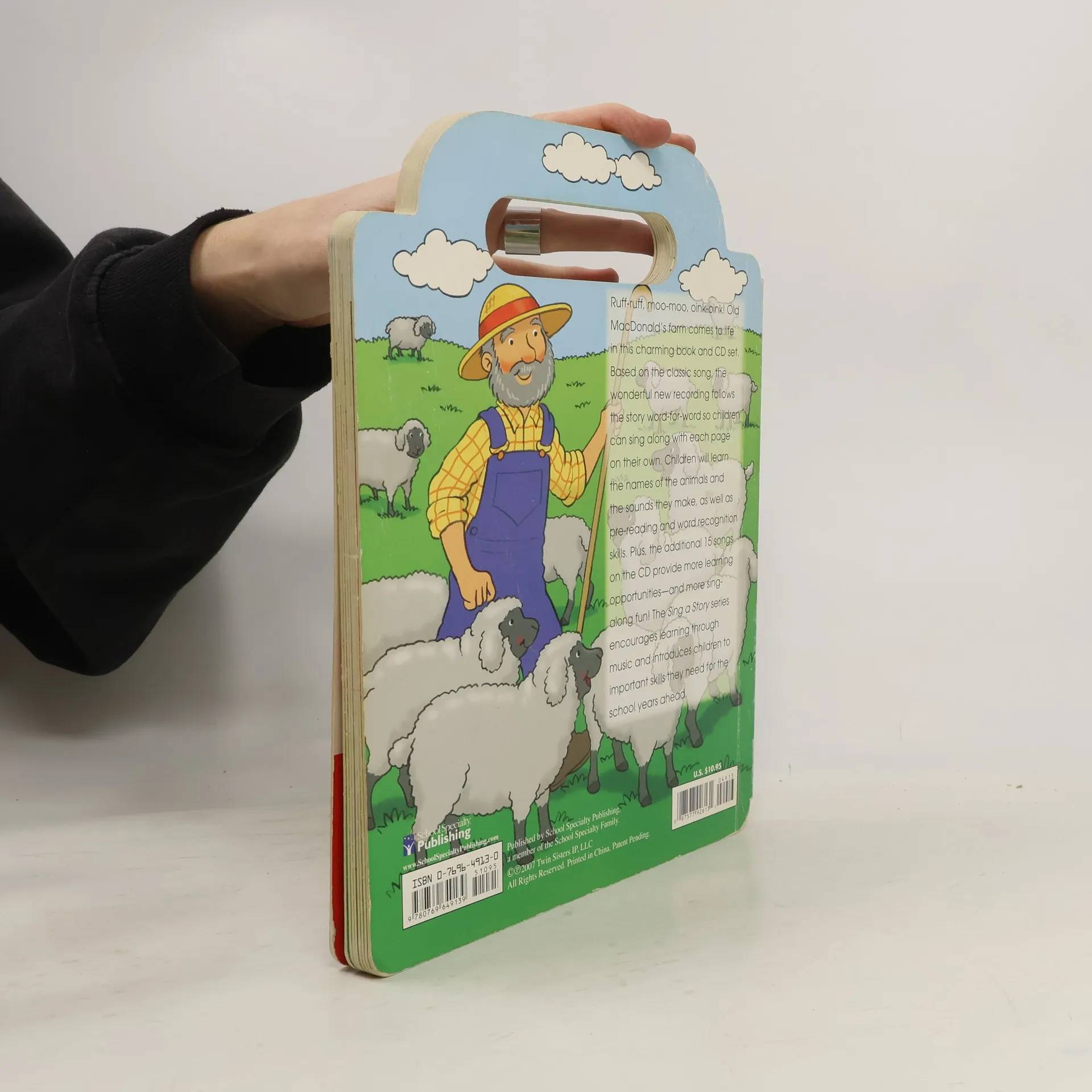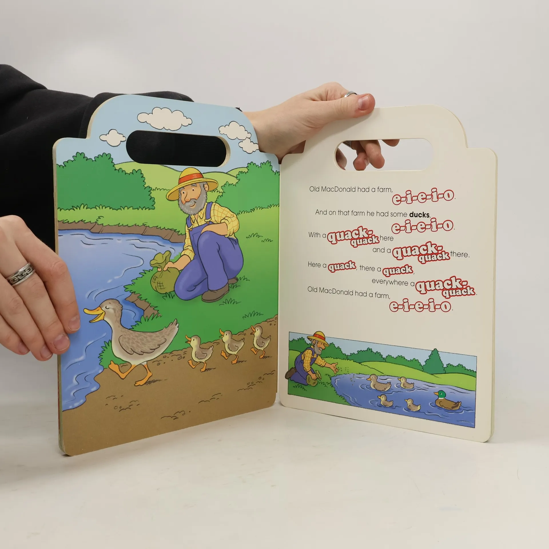 Colorful illustrations enhance the lyrics to the song Old MacDonald Had a Farm presented on die-cut board pages.