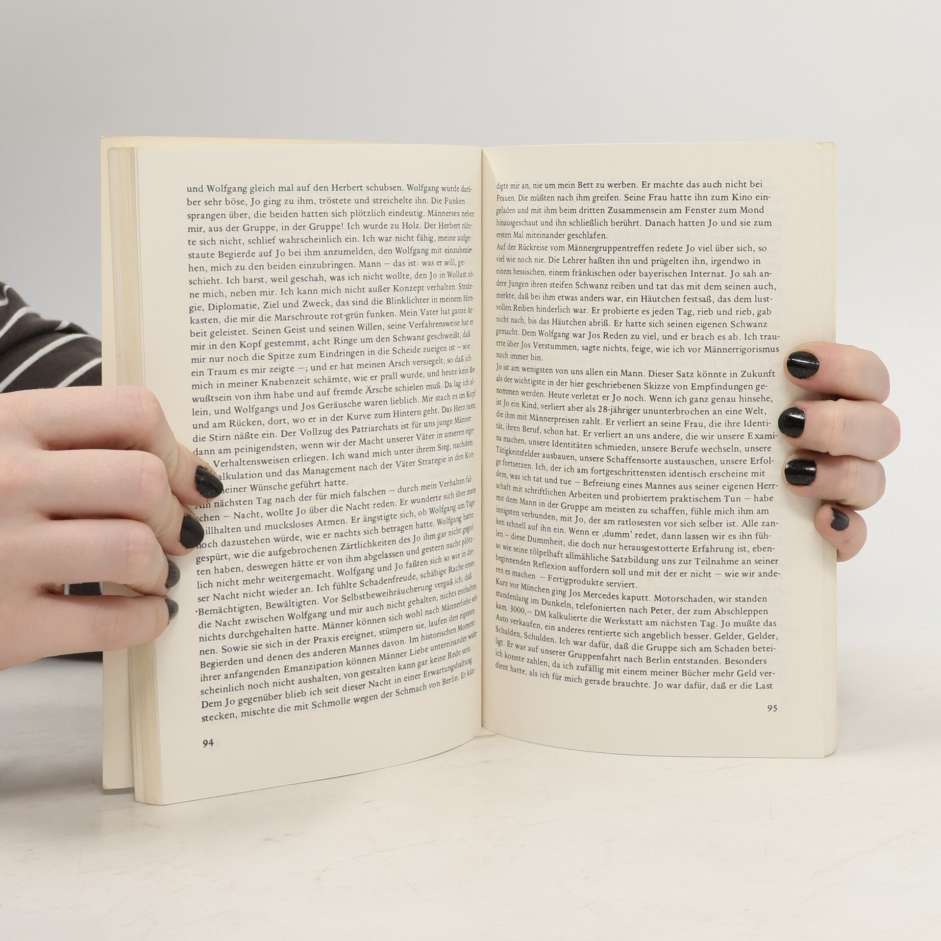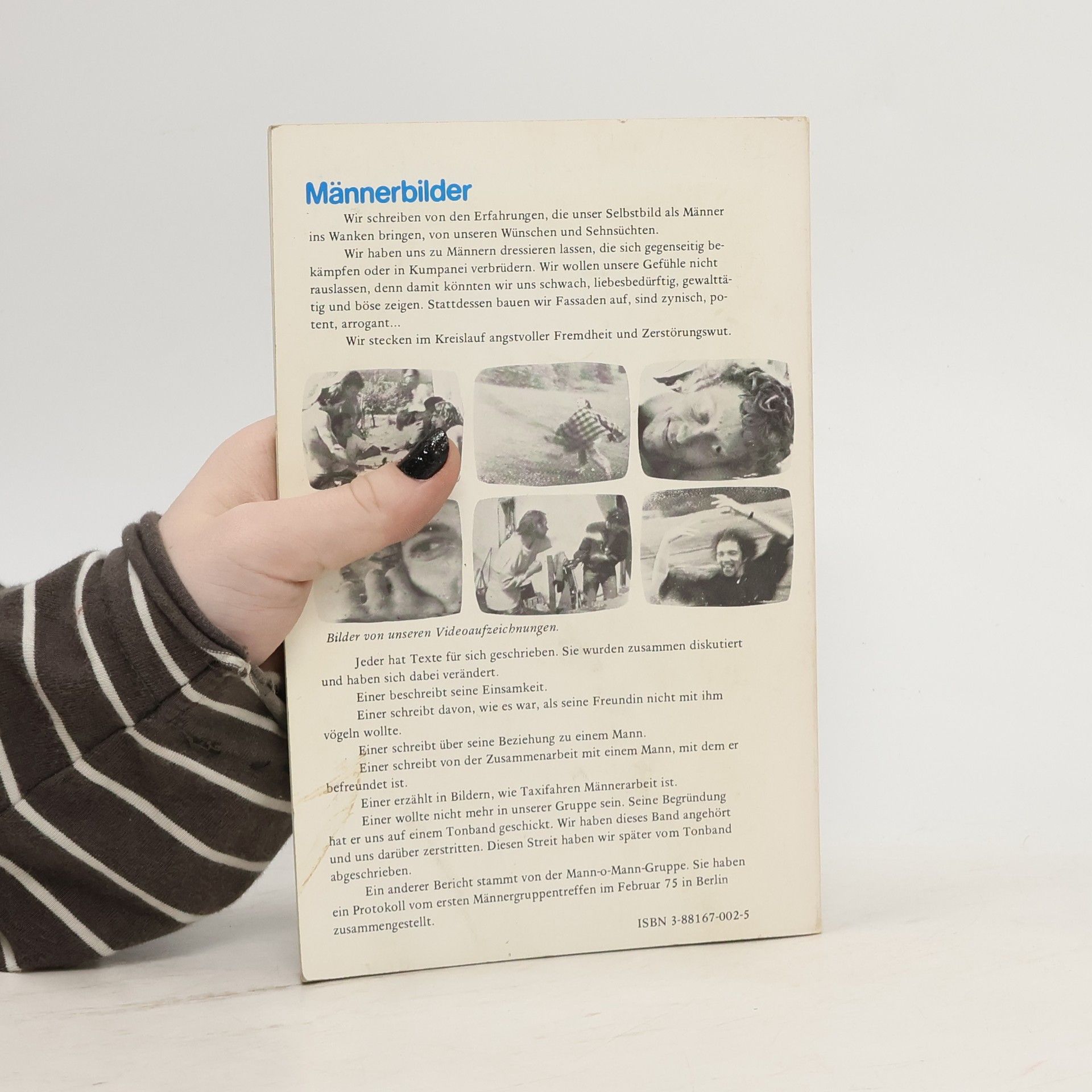 "Wir schreiben von den Erfahrungen, die unser Selbstbild als Männer ins Wanken bringen, von unseren Wünschen und Sehnsüchten. Wir haben uns zu Männern dressieren lassen, die sich gegenseitig bekämpfen oder in Kumpanei verbrüdern. Wir wollen unsere Gefühle nicht rauslassen, denn damit könnten wir uns schwach, liebesbedürftig, gewalttätig und böse zeigen. Stattdessen bauen wir Fassaden auf, sind zynisch, potent, arrogant. Wir stecken im Kreislauf angstvoller Fremdheit und Zerstörungswut. Jeder hat Texte für sich geschrieben. Sie wurden zusammen diskutiert und haben sich dabei verändert. Einer beschreibt seine Einsamkeit ... Einer erzählt in Bildern, wie Taxifahren Männerarbeit ist. Einer wollte nicht mehr in unserer Gruppe sein. Seine Begründung hat er uns auf einem Tonband geschickt. Wir haben dieses Band angehört und uns darüber zerstritten. ..." --P. [4] of cover.