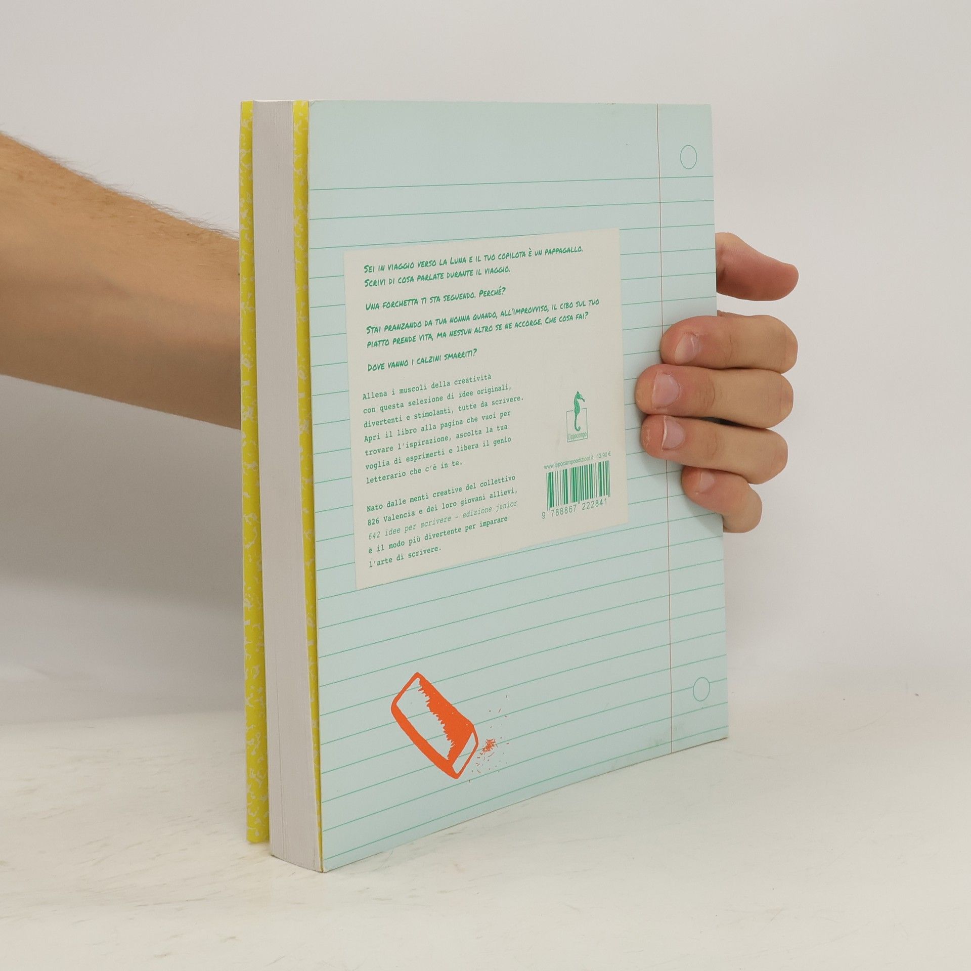 La collana bestseller dei « 642 idee » si espande con 2 nuovi titoli che si rivolgono non più ad adulti bensì a un pubblico di piccoli scrittori ed artisti in erba tra gli 8 e i 12 anni di età. Allena i muscoli della creatività con questa selezione di idee originali, divertenti e stimolanti, tutte da scrivere. Apri il libro alla pagina che vuoi per trovare l’ispirazione, ascolta la tua voglia di esprimerti e libera il genio letterario che c’è in te. Nato dalle menti creative del collettivo 826 Valencia e dei loro giovani allievi, 642 idee per scrivere - edizione junior è il modo più divertente per imparare l’arte di scrivere.Sei in viaggio verso la Luna e il tuo copilota è un pappagallo. Scrivi di cosa parlate durante il viaggio.Una forchetta ti sta inseguendo, perché?Stai pranzando da tua nonna quando, all’improvviso, il cibo sul tuo piatto prende vita, ma nessun altro se ne accorge. Che cosa fai?Dove vanno i calzini smarriti?