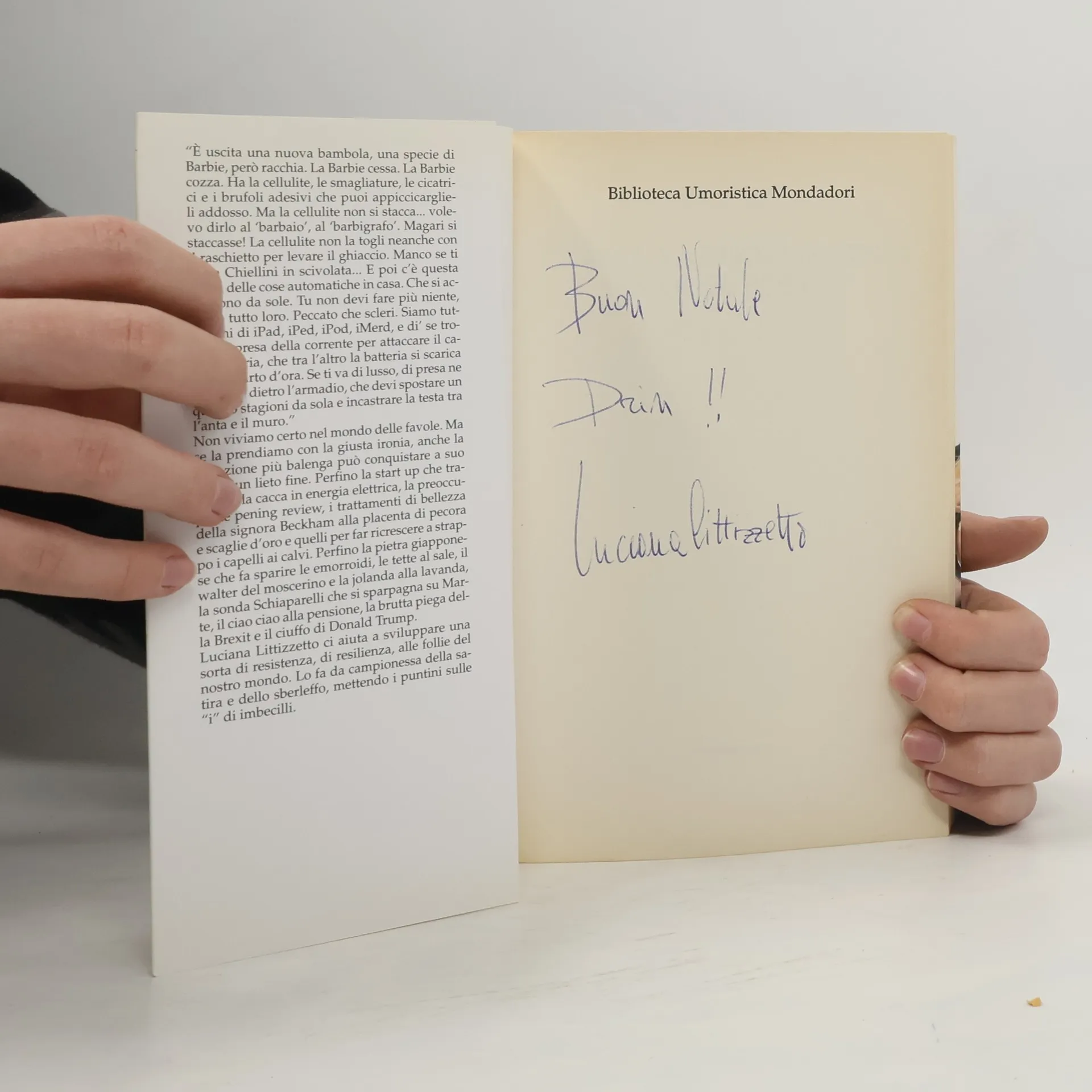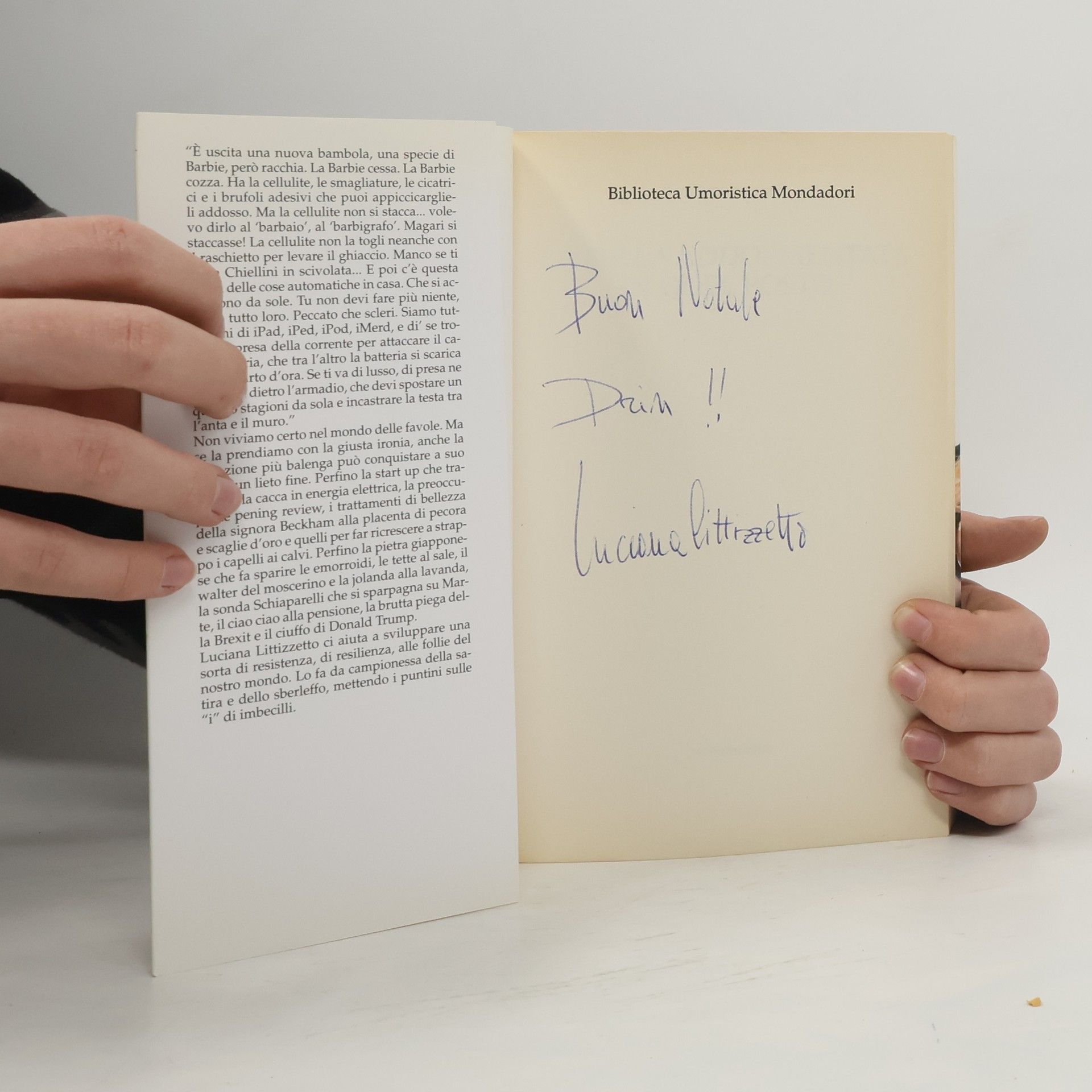 Luciana Littizzetto ci aiuta a sviluppare una sorta di resistenza, di resilienza, alle follie del nostro mondo. Lo fa da campionessa della satira e dello sberleffo, mettendo i puntini sulle "i" di imbecilli. "È uscita una nuova bambola, una specie di Barbie, però racchia. La Barbie cessa. La Barbie cozza. Ha la cellulite, le smagliature, le cicatrici e i brufoli adesivi che puoi appiccicarglieli addosso. Ma la cellulite non si stacca... volevo dirlo al 'barbaio', al 'barbigrafo'. Magari si staccasse! La cellulite non la togli neanche con il raschietto per levare il ghiaccio. Manco se ti entra Chiellini in scivolata... E poi c'è questa moda delle cose automatiche in casa. Che si accendono da sole. Tu non devi fare più niente, fanno tutto loro. Peccato che scleri. Siamo tutti pieni di iPad, iPed, iPod, iMerd, e di' se trovi una presa della corrente per attaccare il caricabatteria, che tra l'altro la batteria si scarica in un quarto d'ora. Se ti va di lusso, di presa ne trovi una dietro l'armadio, che devi spostare un quattro stagioni da sola e incastrare la testa tra l'anta e il muro." Non viviamo certo nel mondo delle favole. Ma se la prendiamo con la giusta ironia, anche la situazione più balenga può conquistare a suo modo un lieto fine. Perfino la start up che trasforma la cacca in energia elettrica, la preoccupante pening review, i trattamenti di bellezza della signora Beckham alla placenta di pecora e scaglie d'oro e quelli per far ricrescere a strappo i capelli ai calvi. Perfino la pietra giapponese che fa sparire le emorroidi, le tette al sale, il walter del moscerino e la jolanda alla lavanda, la sonda Schiaparelli che si sparpagna su Marte, il ciao ciao alla pensione, la brutta piega della Brexit e il ciuffo di Donald Trump