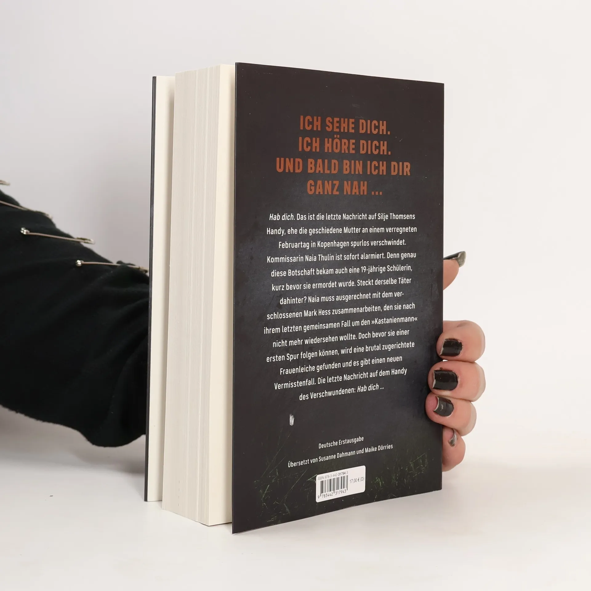 Ich sehe dich. Ich höre dich. Und dann bin ich dir ganz nah ... Hab dich. Das ist die letzte Nachricht auf Silje Thomsens Handy, ehe die geschiedene Mutter an einem verregneten Februartag in Kopenhagen spurlos verschwindet. Kommissarin Naia Thulin ist sofort alarmiert. Denn genau diese Botschaft bekam auch eine 19-jährige Schülerin, kurz bevor sie ermordet wurde. Steckt derselbe Täter dahinter? Naia muss ausgerechnet mit dem verschlossenen Mark Hess zusammenarbeiten, den sie nach ihrem letzten gemeinsamen Fall um den „Kastanienmann“ nicht mehr wiedersehen wollte. Doch bevor sie einer ersten Spur folgen können, wird eine brutal zugerichtete Frauenleiche gefunden – und es gibt einen neuen Vermisstenfall. Die letzte Nachricht auf dem Handy des Vermissten: Hab dich …