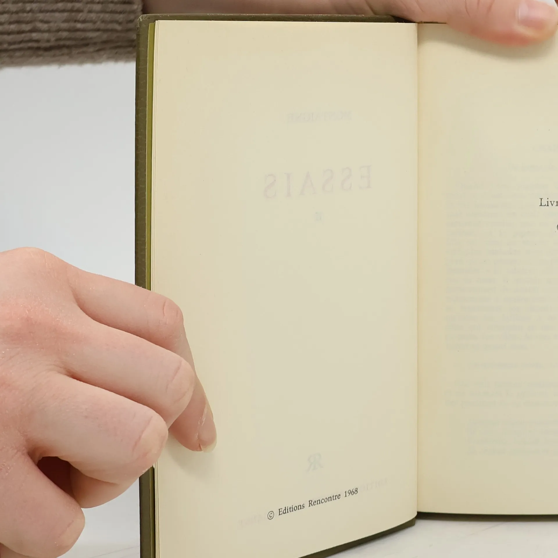 S'il y a quelque personne, quelque bonne compagnie, aux champs, en la ville, en France, ou ailleurs, resséante ou voyagère, à qui mes humeurs soient bonnes, de qui les humeurs me soient bonnes, il n'est que de siffler en paume, je leur irai fournir des essais, en chair et en os. -- 4ème de couverture, Livre troisième.
