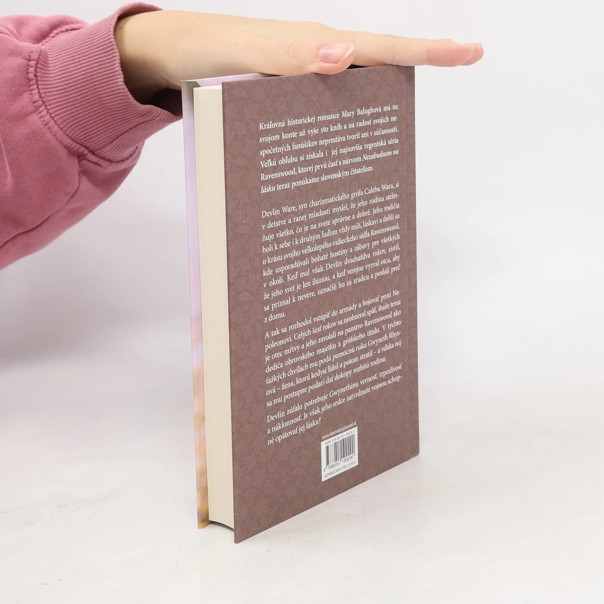 Kráľovná historickej romance Mary Baloghová má na svojom konte už vyše sto kníh a na radosť svojich nespočetných fanúšikov neprestáva tvoriť ani v súčasnosti. Veľkú obľubu si získala i jej najnovšia regentská séria Ravenswood, ktorej prvú časť s názvom Nezabudnem na lásku teraz ponúkame slovenským čitateľom. Devlin Ware, syn charizmatického grófa Caleba Wara, si v detstve a ranej mladosti myslel, že jeho rodina stelesňuje všetko, čo je na svete správne a dobré. Jeho rodičia boli k sebe i k druhým ľuďom vždy milí, láskaví a delili sa o krásu svojho veľkolepého vidieckeho sídla Ravenswood, kde usporadúvali bohaté hostiny a zábavy pre všetkých v okolí. Keď mal však Devlin dvadsaťdva rokov, zistil, že jeho svet je len ilúziou, a keď verejne vyzval otca, aby sa priznal k nevere, označili ho za zradcu a poslali preč z domu. A tak sa rozhodol vstúpiť do armády a bojovať proti Napoleonovi. Celých šesť rokov sa neobzeral späť, ibaže teraz je otec mŕtvy a jeho zavolali na panstvo Ravenswood ako dediča obrovského majetku a grófskeho titulu. V týchto ťažkých chvíľach mu podá pomocnú ruku Gwyneth Rhysová – žena, ktorú kedysi ľúbil a potom stratil - a vďaka nej sa mu postupne podarí dať dokopy rozbitú rodinu. Devlin zúfalo potrebuje Gwynethinu vernosť, trpezlivosť a náklonnosť. Je však jeho srdce zatvrdnuté vojnou schopné opätovať jej lásku?