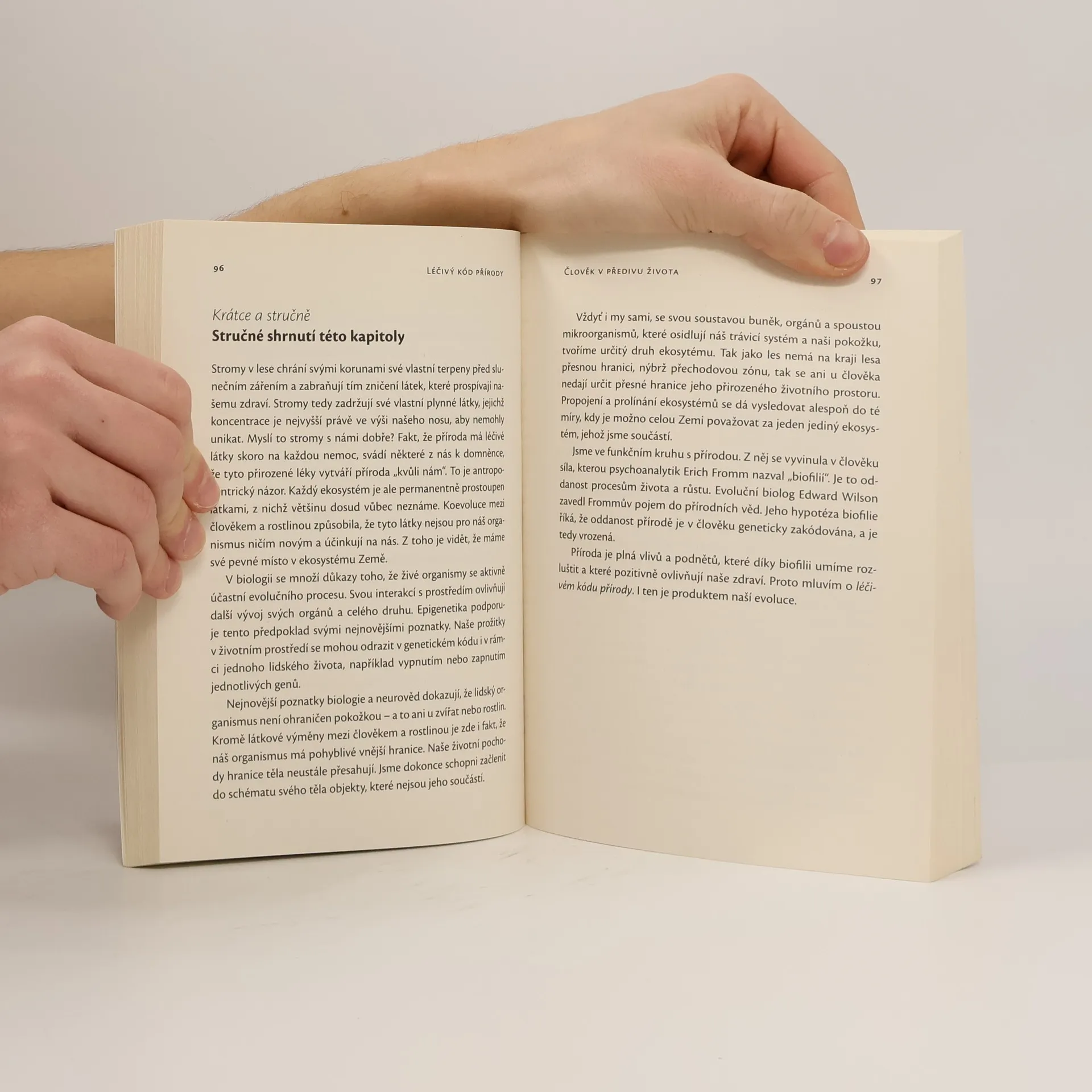 Autor s námi probádá naše spojení s rostlinami a zvířaty. Z těchto poznatků pak vytváří medicínu budoucnosti, v níž je na člověka nahlíženo jako na přírodní bytost, neodlučitelně spojenou se svým přirozeným životním prostředím.Autor přichází s vědeckými důkazy léčivé síly přírody: jak posilují rostlinné látky v lese náš imunitní systém? Které přírodní protirakovinné látky se dají využít i v lécích? Jakou roli hrají zvířata ve velkém organismu Země, ke kterému patří i člověk? A jakým způsobem pozitivně ovlivňuje kontakt se zvířaty naše srdce? Na základě četných aktuálních studií a vlastního bádání dokazuje biolog Clemens G. Arvay, že příroda je tím nejlepším prostředkem proti celé řadě nemocí. A je krátkozraké redukovat člověka jen na materiální rovinu, jak to dnes dělá většina vědců.
