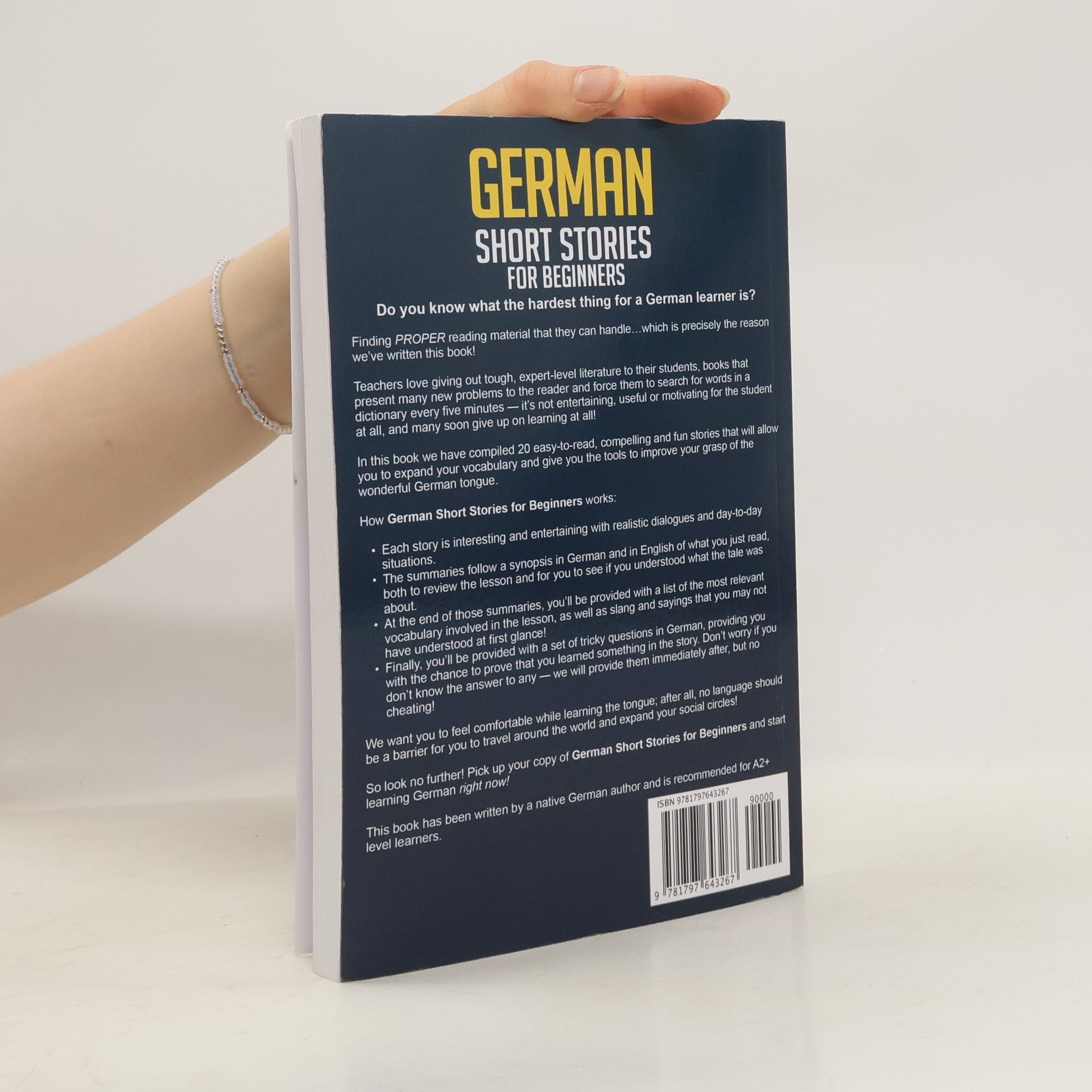 Do you know what the hardest thing for a German learner is?Finding PROPER reading material that they can handle…which is precisely the reason we’ve written this book!Teachers love giving out tough, expert-level literature to their students, books that present many new problems to the reader and force them to search for words in a dictionary every five minutes — it’s not entertaining, useful or motivating for the student at all, and many soon give up on learning at all!In this book we have compiled 20 easy-to-read, compelling and fun stories that will allow you to expand your vocabulary and give you the tools to improve your grasp of the wonderful German tongue.How German Short Stories for Beginners We want you to feel comfortable while learning the tongue; after all, no language should be a barrier for you to travel around the world and expand your social circles!So look no further! Pick up your copy of German Short Stories for Beginners and start learning German right now!This book has been written by a native German author and is recommended for A2+ level learners.