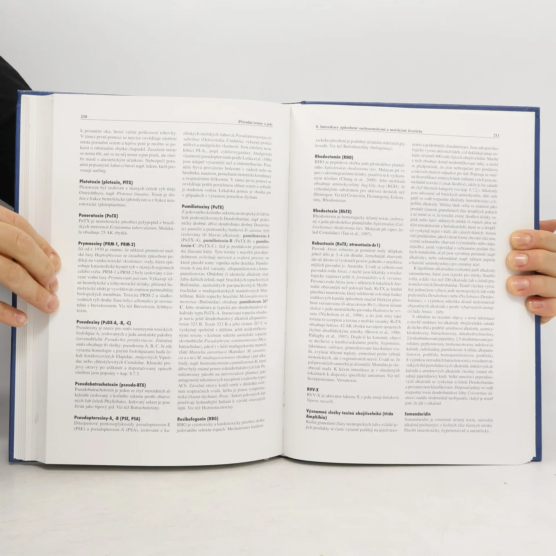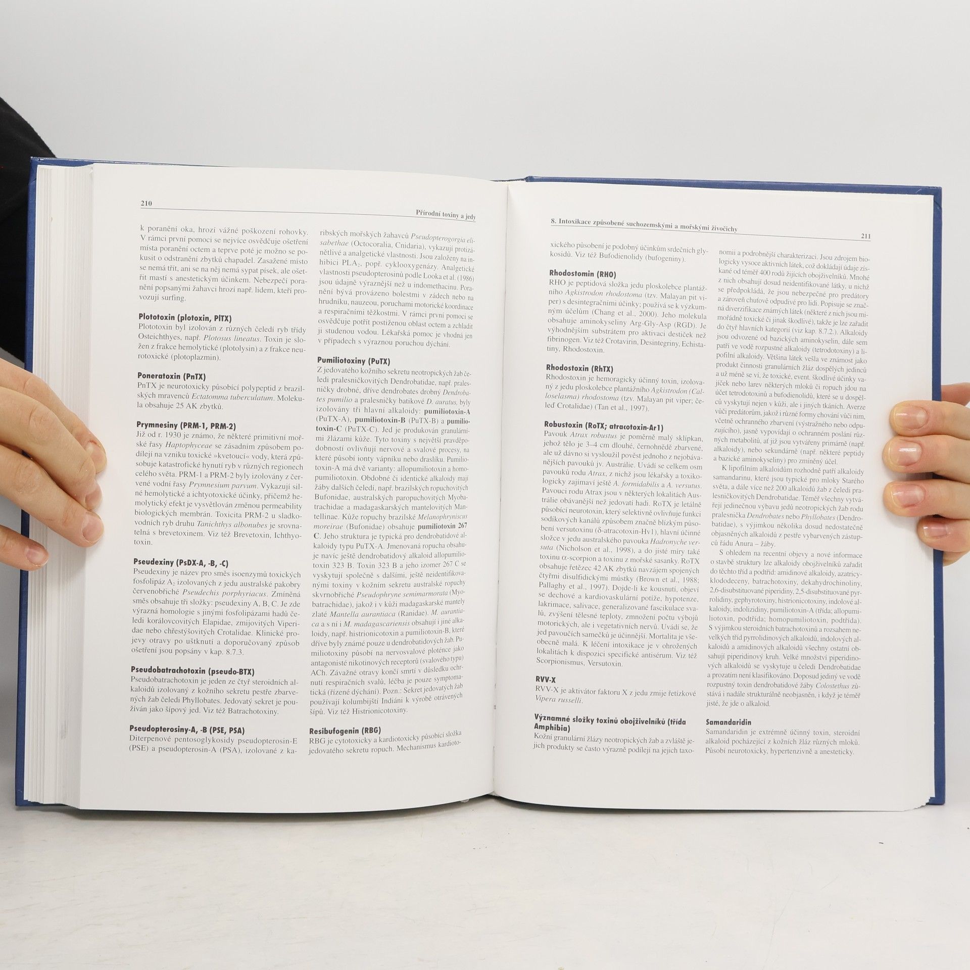 Z předmluvy: Přírodní toxiny jsou chemické látky biologického původu, produkované jednobuněčnými i mnohobuněčnými organismy ve speciálních žlázách, tkáních a pletivech. Utvářely se v procesu evoluce v mikroorganismech, v houbách, rostlinách i živočiších a v tomto časově dlouhém procesu získaly specifické a mnohdy jedinečné vlastnosti. Jedy některých rostlin nebo i živočichů a jejich toxické vlastnosti byly známy a využívány (popřípadě zneužívány) k různým účelům již v nejstarších úsecích lidských dějin. Toxiny jedovatých živočichů a jejich dramatický účinek na jiné organismy fascinoval lidstvo od nepaměti a zřejmě tomu tak bude i v nejbližší budoucnosti.