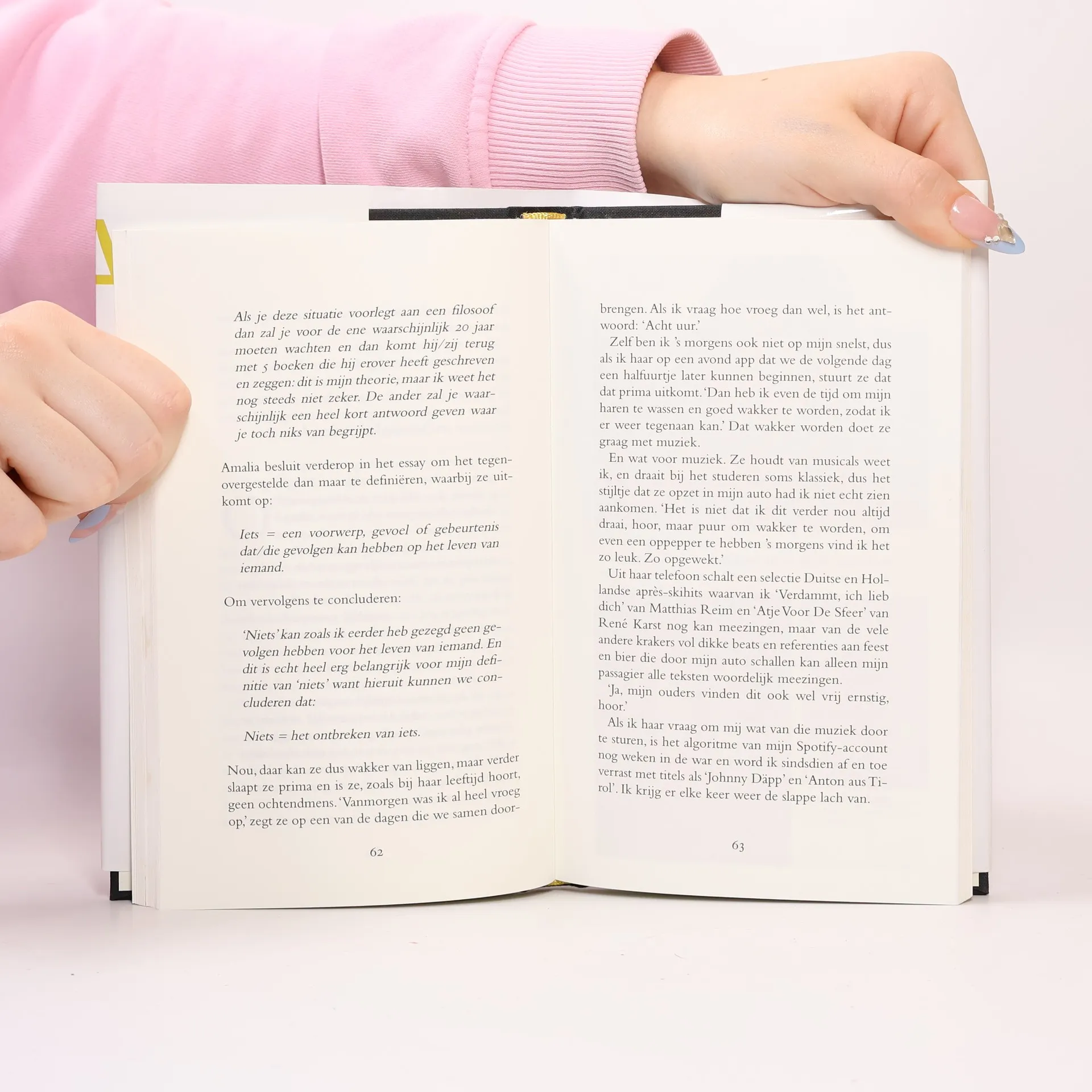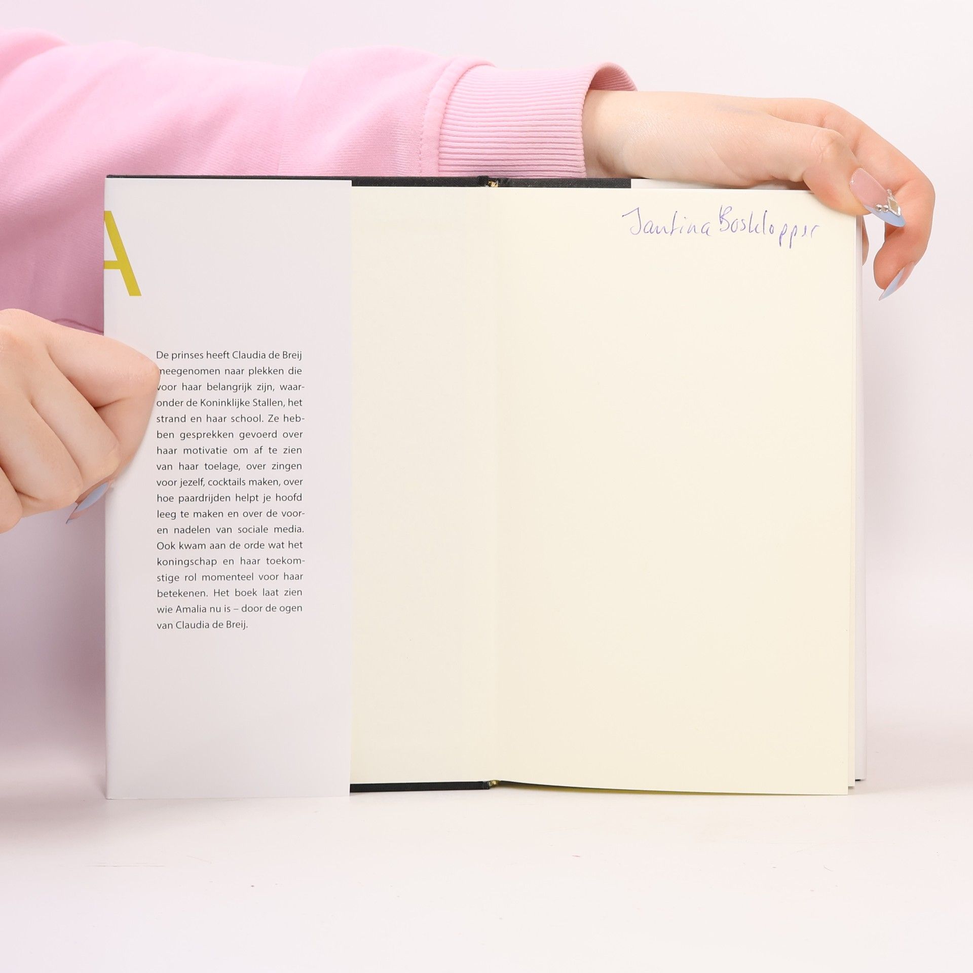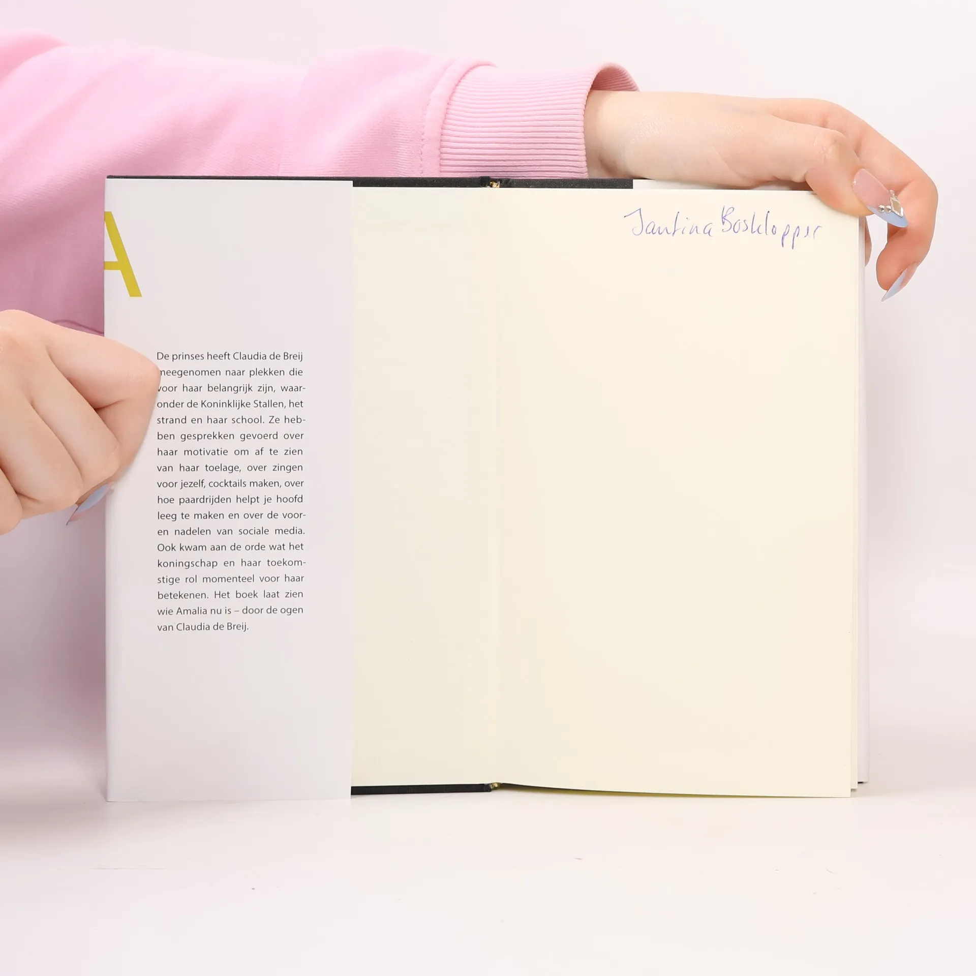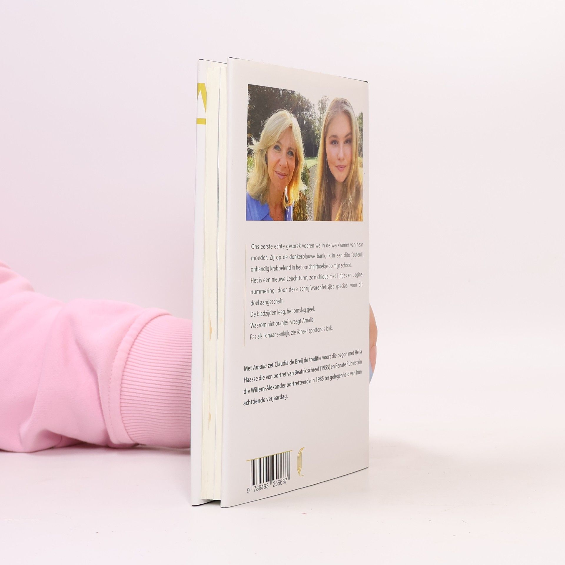 Ons eerste echte gesprek voeren we in de werkkamer van haar moeder. Zij op de donkerblauwe bank, ik in een dito fauteuil, onhandig krabbelend in het opschrijfboekje op mijn schoot. 0Het is een nieuwe Leuchtturm, zo?n chique met lijntjes en paginanummering, door deze schrijfwarenfetisjist speciaal voor dit doel aangeschaft. 0De bladzijden leeg, het omslag geel. "Waarom niet oranje?" vraagt Amalia. Pas als ik haar aankijk, zie ik haar spottende blik.0Met 'Amalia' zet Claudia de Breij de traditie voort die begon met Hella Haasse die een portret van Beatrix schreef (1955) en Renate Rubinstein die Willem-Alexander portretteerde in 1985 ter gelegenheid van hun achttiende verjaardag. 0De prinses heeft Claudia de Breij meegenomen naar plekken die voor haar belangrijk zijn, waaronder de Koninklijke Stallen, het strand en haar school. Ze hebben gesprekken gevoerd over haar motivatie om af te zien van haar toelage, over zingen voor jezelf, cocktails maken, over hoe paardrijden helpt je hoofd leeg te maken en over de voor- en nadelen van sociale media. Ook kwam aan de orde wat het koningschap en haar toekomstige rol momenteel voor haar betekenen. Het boek laat zien wie Amalia nu is door de ogen van Claudia de Breij.0Het boek bevat foto?s uit het privéarchief van de prinses.