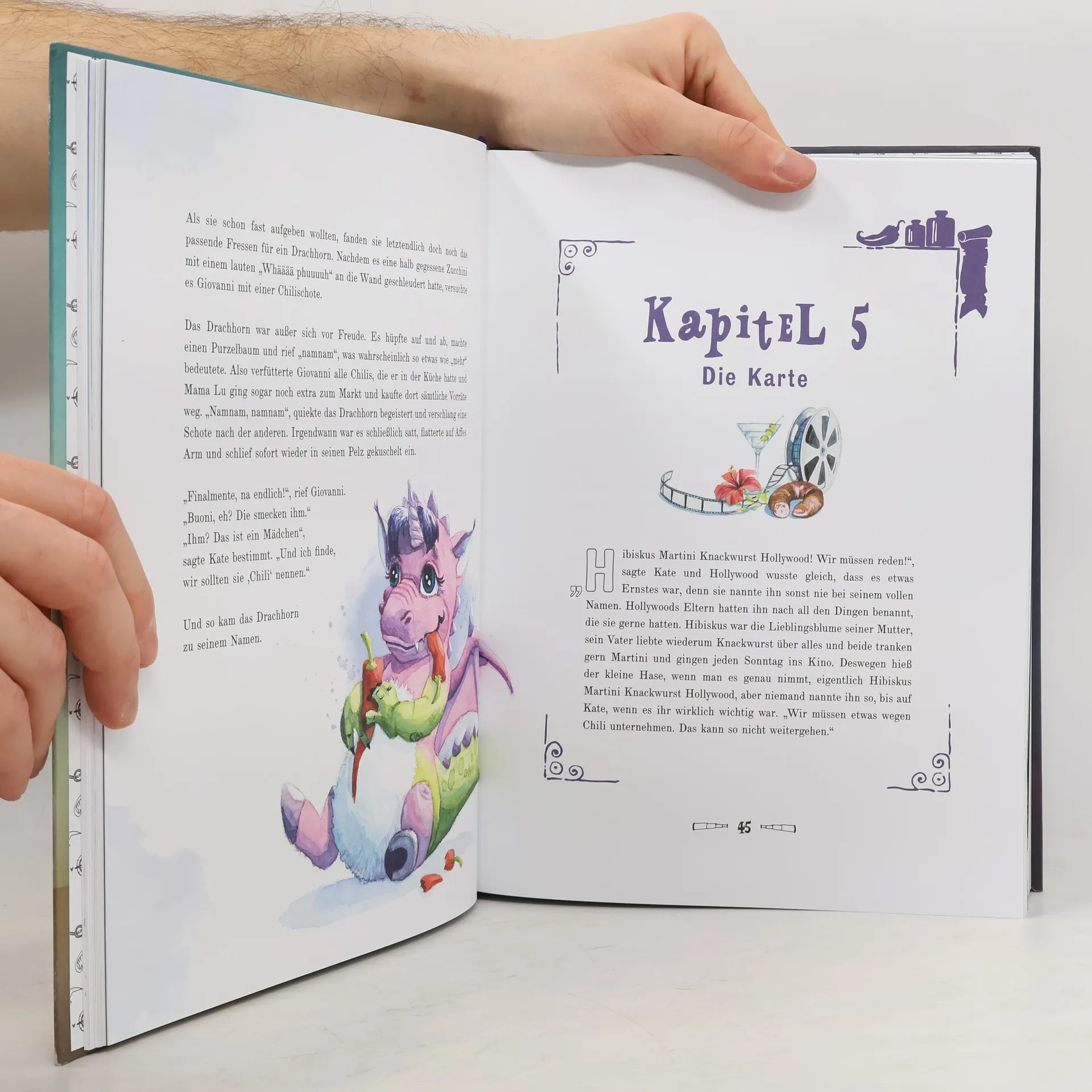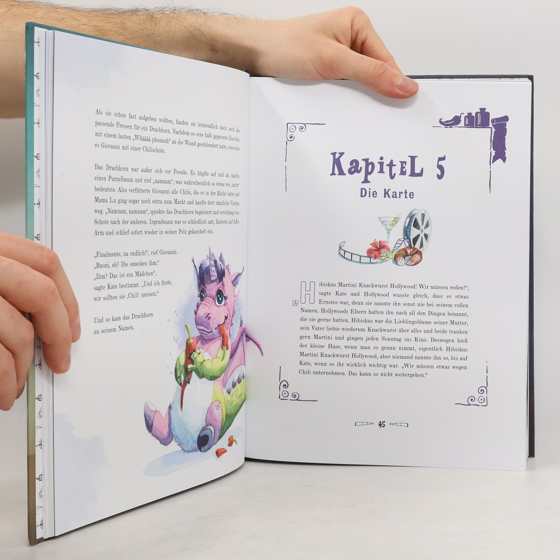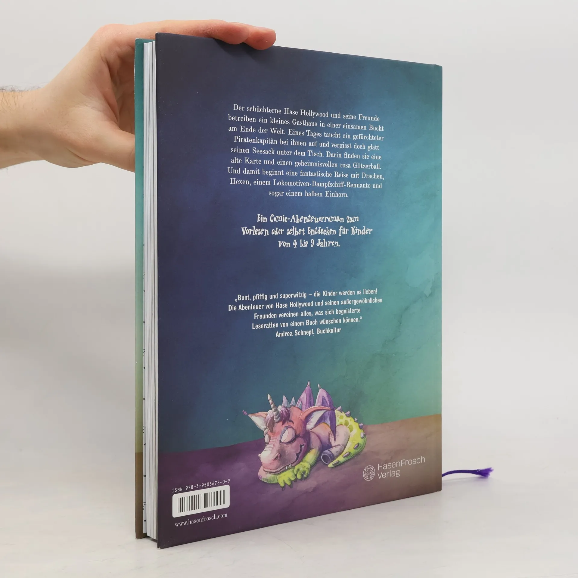 Ein Comic-Abenteuerroman zum Vorlesen oder selbst Entdecken für Kinder von 4 bis 9 Jahren. Der schüchterne Hase Hollywood und seine Freunde betreiben ein kleines Gasthaus in einer einsamen Bucht am Ende der Welt. Eines Tages taucht ein gefürchteter Piratenkapitän bei ihnen auf und vergisst doch glatt seinen Seesack unter dem Tisch. Darin finden sie eine alte Karte und einen geheimnisvollen rosa Glitzerball. Und damit beginnt eine fantastische Reise mit Drachen, Hexen, einem Lokomotiven-Dampfschiff-Rennauto und sogar einem halben Einhorn. Wunderschönes Vorlesebuch mit 208 liebevoll illustrierten Seiten - mit bunten Bildern auf jeder Seite! Spannend, humorvoll und herzerwärmend geschrieben – ohne traurige Momente. Perfekt für sensible Kinder. Mit Drachen, Einhörnern, Hexen, Monstern, Piraten und einem verrückten Lokomotiven-Dampfschiff-Rennauto. Ein Kinderbuch für die ganze Familie, auch für Eltern und Großeltern. Umweltfreundlich produziert: Gedruckt in Österreich, mit Öko-Farben und komplett kreislauffähig nach dem „Cradle 2 Cradle“-Standard. Kinderbuch Empfehlung für Mädchen und Jungen von 4 bis 9 Jahren. Das ideale Geschenk zu Ostern, Weihnachten, zum Geburtstag – oder einfach für zwischendurch.