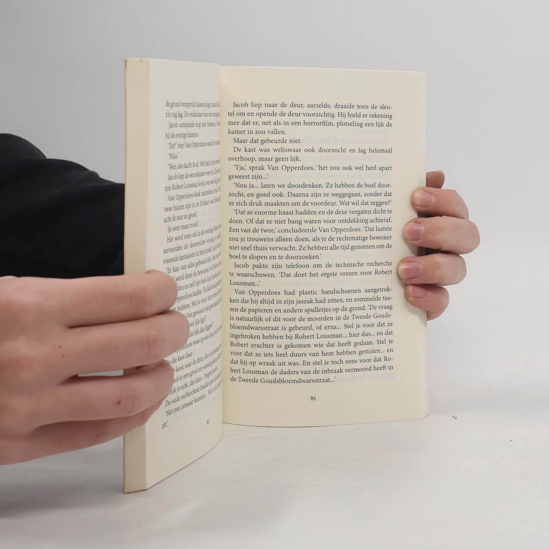 Op een mooie zomerdag, als de Jordaan zucht en steunt van de hitte, werkt rechercheur Peter van Opperdoes op het oude bureau Raampoort. Toch is Van Opperdoes niet echt eenzaam, want hij heeft altijd zijn overleden vrouw nog, met wie hij gesprekken kan voeren en aan wie hij om raad kan vragen. Dan komt een jonge vrouw bij Van Opperdoes op het bureau langs. Zij vertelt zojuist in een woning te zijn geweest, die ze op het punt staat te huren. Van de makelaar kreeg ze de sleutels, want ze wilde het huis eerst bezichtigen voordat ze definitief ja zou zeggen. De makelaar had bovendien gezegd dat er iets in de woning was gebeurd, maar dat alle nu netjes en schoon was. Bij binnenkomst schrok ze zich wild in de woning lagen twee lijken. Peter van Opperdoes, in zijn eentje op het bureau omdat zijn jonge collega Jacob op de camping zit, loopt met haar mee naar de woning. Dit wil hij met eigen ogen aanschouwen. Hij opent de deur, maar de woning is leeg. Jacob, die trouw iedere dag even met zijn oude vriend belt om te vragen hoe het hem vergaat, komt onder veel gemopper van zijn vrouw snel terug naar Amsterdam, om dit onderzoek vol mysterieuze wendingen samen met Van Opperdoes op te lossen.