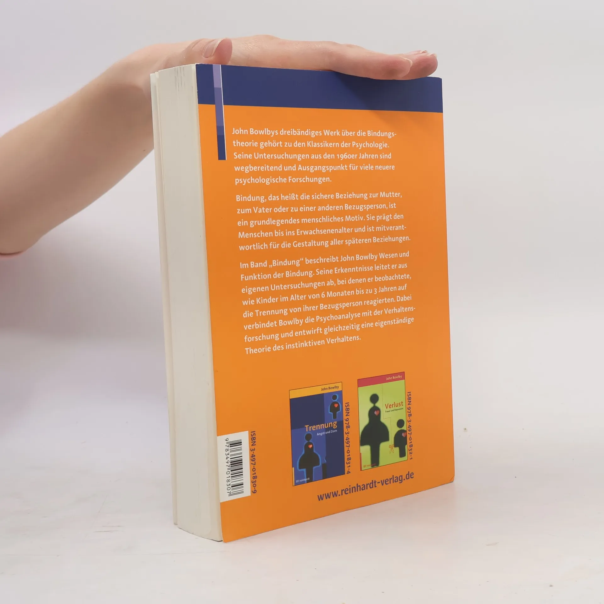 Bindung ist ein elementares Bedürfnis, vergleichbar mit Hunger oder Sex, das schon Säuglinge an eine erwachsene Bezugsperson knüpft. Werden kleine Kinder über längere Zeit von ihrer Bezugsperson getrennt, erleiden sie schwere psychische Schäden: von chronischer Trauer und Depression bis zur völligen Apathie, von Aggression bis zur Delinquenz. In seinem Grundlagenwerk stellt John Bowlby ausführlich seine Theorie dar. Jeder Einzelband ist einem thematischen Schwerpunkt gewidmet. Bowlby beobachtete Kinder, die nach dem Zweiten Weltkrieg von ihren Eltern z. B. bei Krankenhausaufenthalten getrennt wurden oder die in Waisenhäusern ohne feste Bezugsperson aufwuchsen. Aus diesen Forschungsergebnissen leitete er therapeutische Maßnahmen ab, um die Kinder in ihrer Entwicklung zu fördern. Deutsche Übersetzung der Originalausgabe "Attachment and Loss, Volume 1: Attachment", The Tavistock Institute of Human Relations, 1969.