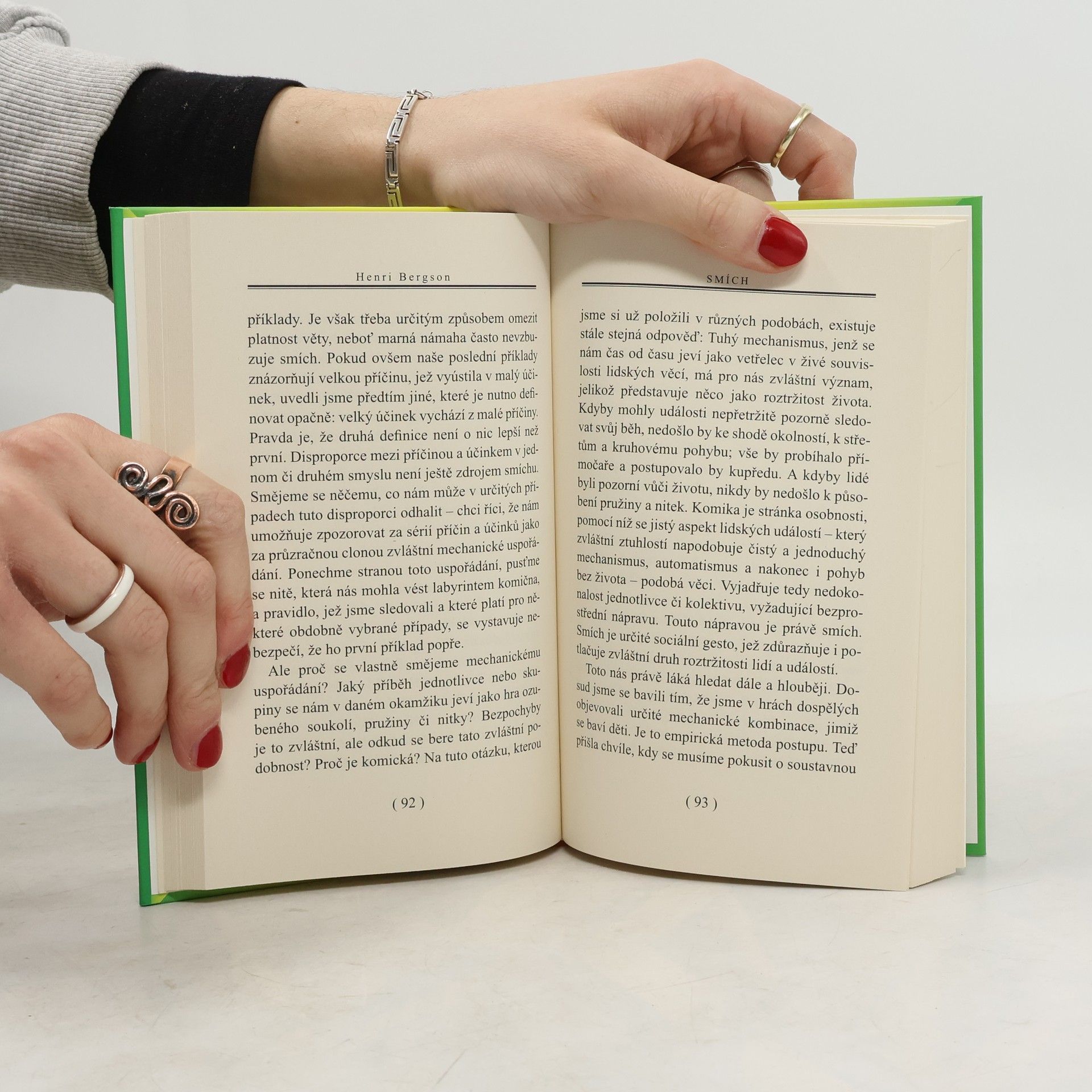 Proslulá Bergsonova esej Smích se zamýšlí nad otázkou zdroje a smyslu smíchu. Odpověď zní, že plní závažnou společenskou roli. Kriticky totiž reaguje na vše komické, tj. na to, co vyjadřuje strnulé, mechanické stránky lidského myšlení a chování. Autor se zde projevuje nejen jako dobrý znalec literatury, ale též jako mistrný a vtipný pozorovatel každodenního života.