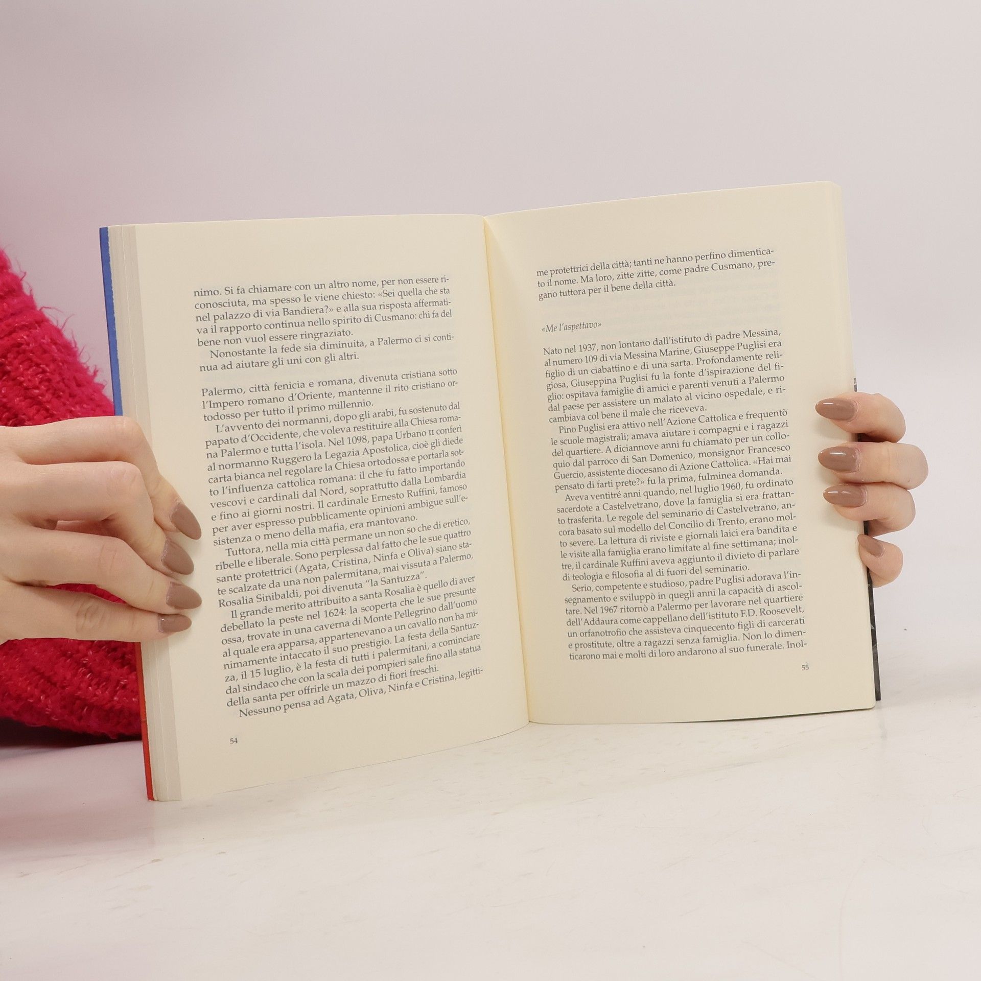 Siamo Palermo: ovvero siamo fatti della stessa pasta di cui è fatta questa città. Simonetta Agnello Hornby e Mimmo Cuticchio si sono incontrati in anni recenti, ne è nata un’amicizia, ne è nata un’intesa che ha destato la visione a due voci di Palermo, Capitale italiana della Cultura 2018. Simonetta e Mimmo raccontano e si raccontano, obbedendo al fascinoso labirinto che storia e memoria disegnano per loro. Ecco allora la Palermo della guerra, la Palermo vista dal mare e attraverso le trasparenze delle acque dolci che ancora la attraversavano, la Palermo della ricostruzione selvaggia, la Palermo dei morti per mafia. Ecco i vicoli della “munnizza”, i palazzi nobiliari, le statue del Serpotta, magnifiche e sensuali, le prostitute (la bionda Nicoletta che faceva sollevare le pietre sulle quali camminava), il cuntista che fa roteare la spada per impressionare il pubblico, le grandi figure della Chiesa che si sono schierate con i poveri e contro la mafia, le atmosfere di sangue degli anni Novanta, lo Spasimo e Palazzo Butera, Palazzo Branciforte, l’arte e le isole pedonali.Simonetta e Mimmo evocano una città che guarda all’Europa, non solo in ragione della sua bellezza e delle sue contraddizioni, ma anche per il desiderio di futuro che vengono esprimendo le istituzioni e le nuove generazioni.