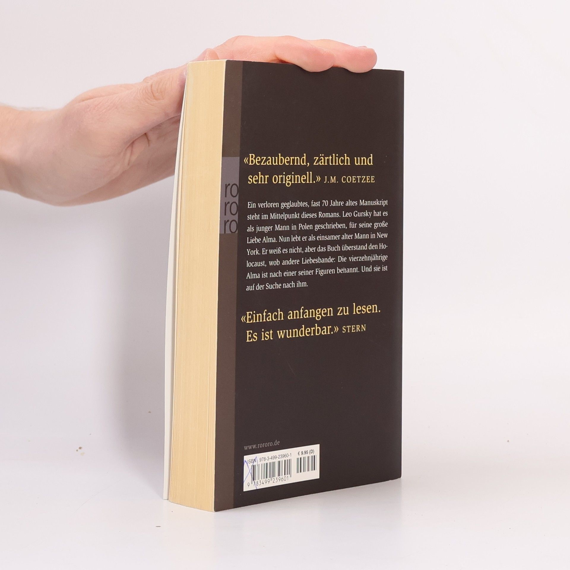 „Bezaubernd, zärtlich und sehr originell.“ (J. M. Coetzee)Ein verloren geglaubtes, fast 70 Jahre altes Manuskript steht im Mittelpunkt dieses Romans. Leo Gursky hat es als junger Mann in Polen geschrieben, für seine große Liebe Alma. Nun lebt er als einsamer alter Mann in New York. Er weiß es nicht, aber das Buch überstand den Holocaust, wob andere Liebesbande: die 14-jährige Alma ist nach einer seiner Figuren benannt. Und sie ist auf der Suche nach ihm.„Einfach anfangen zu lesen. Es ist wunderbar.“ (Stern)