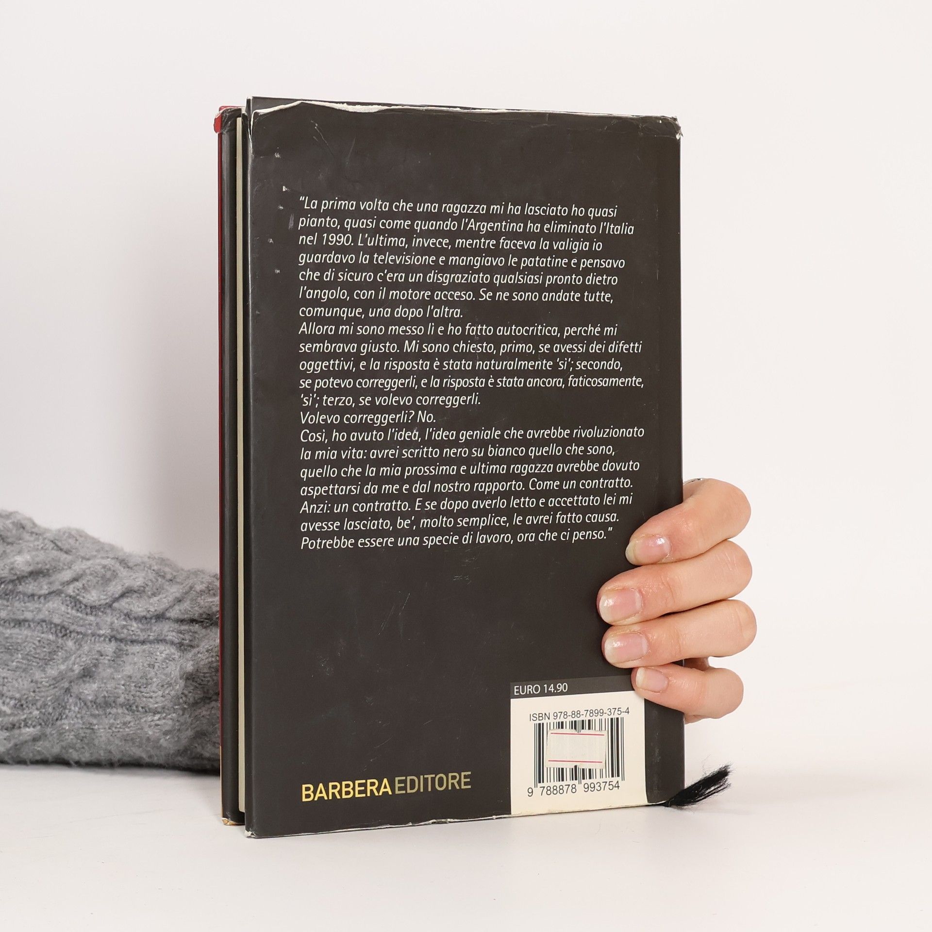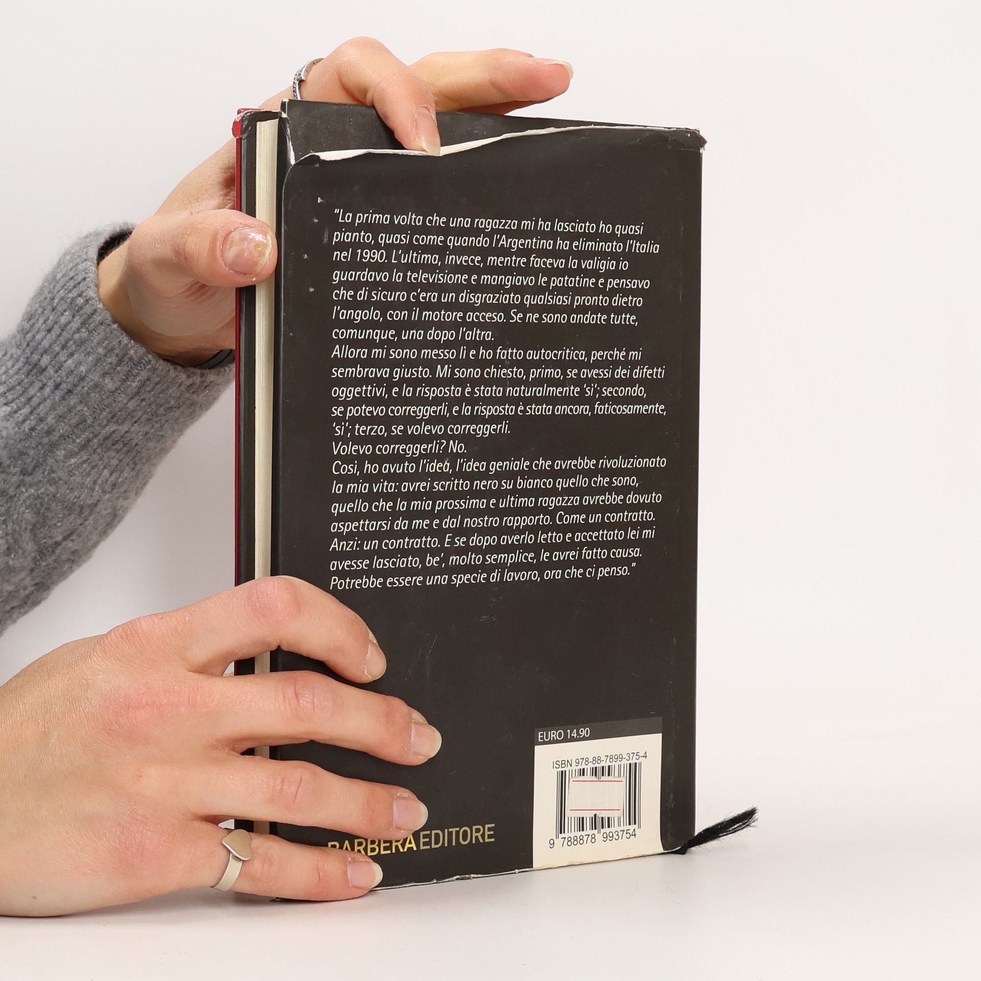 “La prima volta che una ragazza mi ha lasciato ho quasipianto, quasi come quando l’Argentina ha eliminato l’Italianel 1990. L’ultima, invece, mentre faceva la valigia ioguardavo la televisione e mangiavo le patatine e pensavoche di sicuro c’era un disgraziato qualsiasi pronto dietrol’angolo, con il motore acceso. Se ne sono andate tutte,comunque, una dopo l’altra.Allora mi sono messo lì e ho fatto autocritica, perché misembrava giusto. Mi sono chiesto, primo, se avessi dei difettioggettivi, e la risposta è stata naturalmente ‘sì’; secondo,se potevo correggerli, e la risposta è stata ancora, faticosamente, ‘sì’; terzo, se volevo correggerli.Volevo correggerli? No.Così, ho avuto l’idea, l’idea geniale che avrebbe rivoluzionatola mia vita: avrei scritto nero su bianco quello che sono,quello che la mia prossima e ultima ragazza avrebbe dovutoaspettarsi da me e dal nostro rapporto. Come un contratto.Anzi: un contratto. E se dopo averlo letto e accettato lei miavesse lasciato, be’, molto semplice, le avrei fatto causa.Potrebbe essere una specie di lavoro, ora che ci penso”.