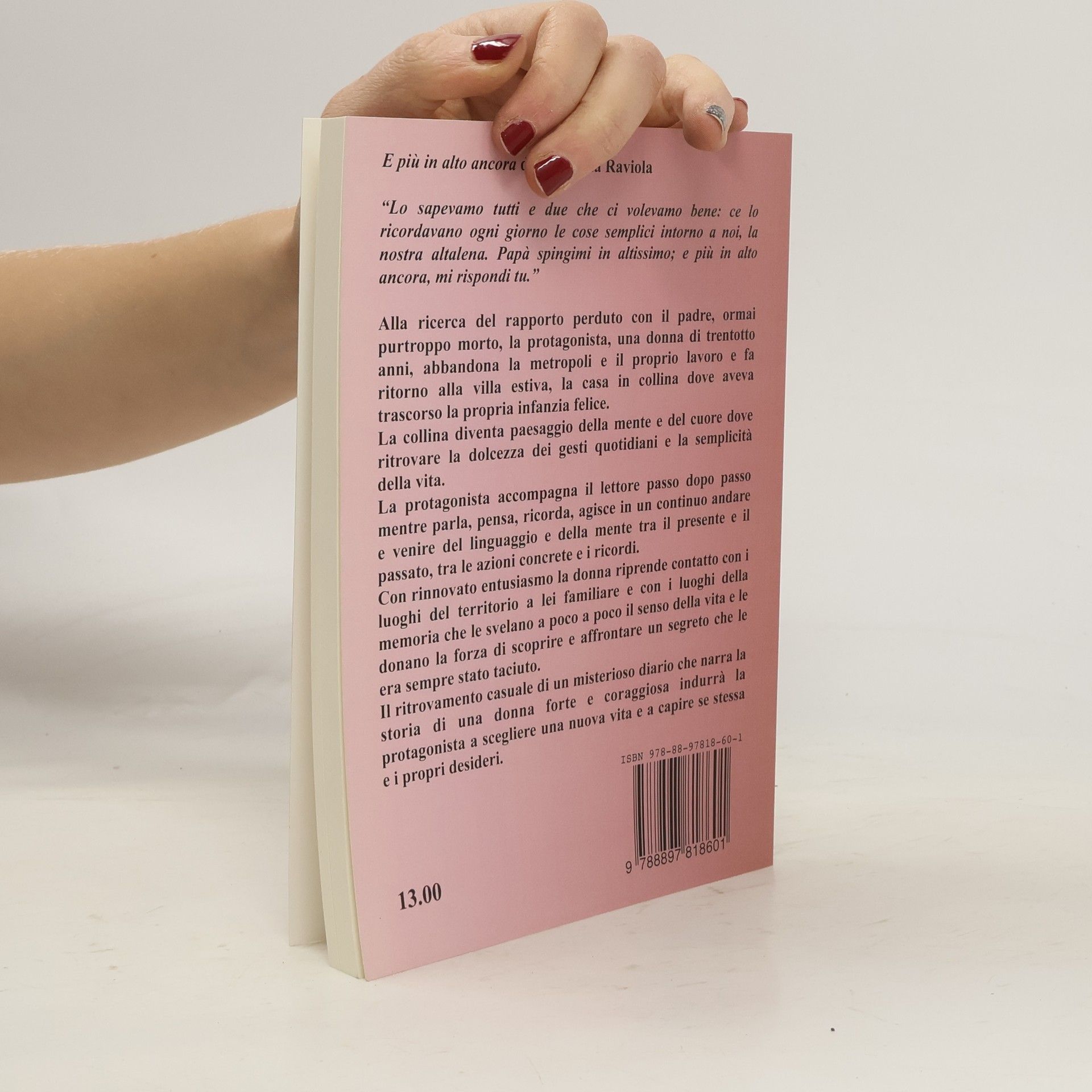 Alla ricerca del rapporto perduto con il padre, ormai purtroppo morto, la protagonista, una donna di trentotto anni, abbandona la metropoli e il proprio lavoro e fa ritorno alla villa estiva, la casa in collina dove aveva trascorso la propria infanzia felice.La collina diventa paesaggio della mente e del cuore dove ritrovare la dolcezza dei gesti quotidiani e la semplicità della vita.La protagonista accompagna il lettore passo dopo passo mentre parla, pensa, ricorda, agisce in un continuo andare e venire del linguaggio e della mente tra il presente e il passato, tra le azioni concrete e i ricordi.Con rinnovato entusiasmo la donna riprende contatto con i luoghi del territorio a lei familiare e con i luoghi della memoria che le svelano il senso della vita e le donano la forza di scoprire e affrontare un segreto che le era sempre stato taciuto.Il ritrovamento casuale di un misterioso diario che narra la storia di una donna forte e coraggiosa indurrà la protagonista a scegliere una nuova vita e a capire se stessa e i propri desideri.