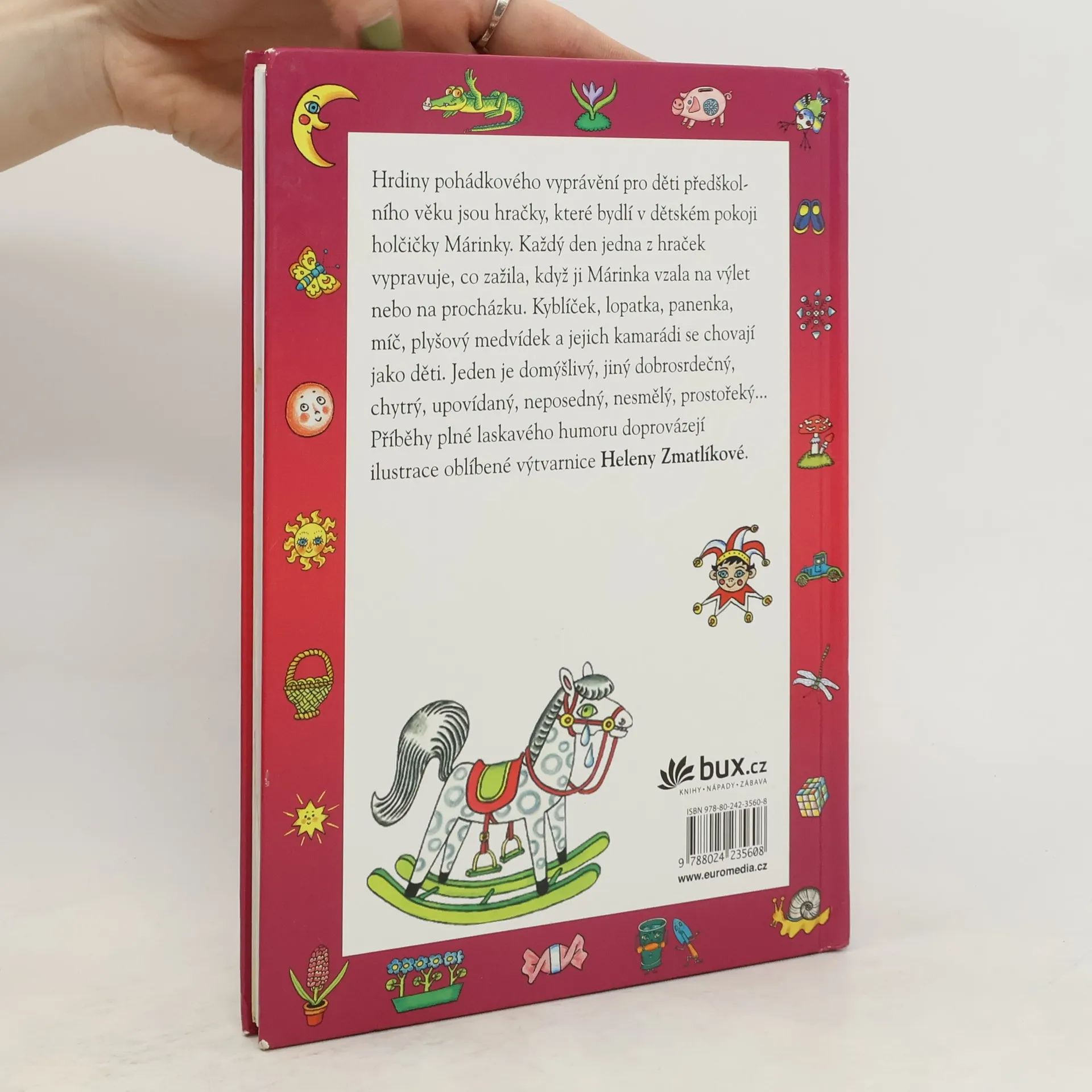 V knížce pro děti předškolního věku vyprávějí hračky z dětského pokoje malé Márinky o tom, co zažily s holčičkou na výletě nebo na procházce. Kyblíček, lopatka, panenka, míč, plyšový medvídek a ostatní jsou jako děti. Jeden je domýšlivý, jiný dobrosrdečný, chytrý, upovídaný, neposedný… Laskavé i úsměvné příběhy doprovázejí ilustrace Heleny Zmatlíkové.