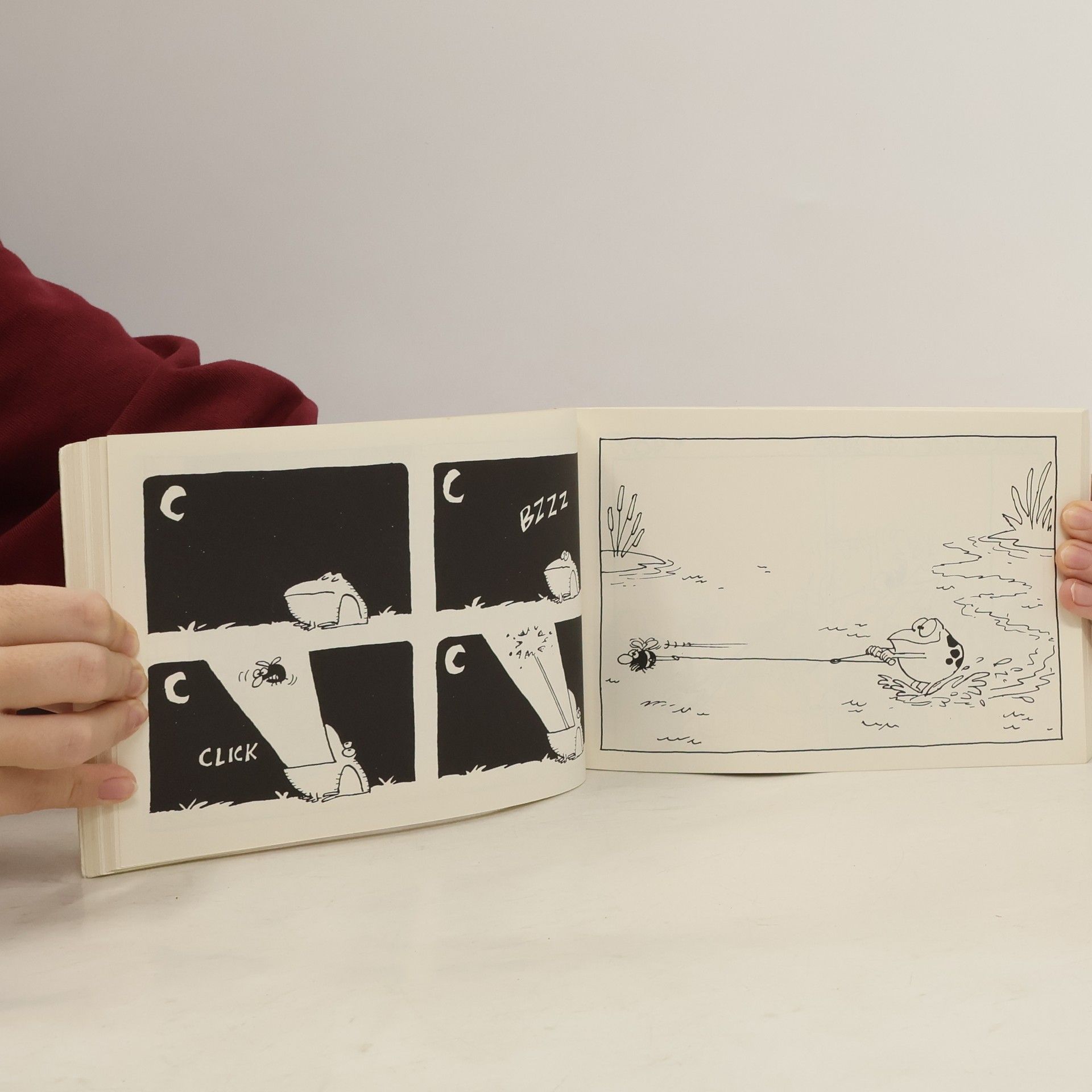 Cartoons poke fun at the social life of frogs and their appetite for flies