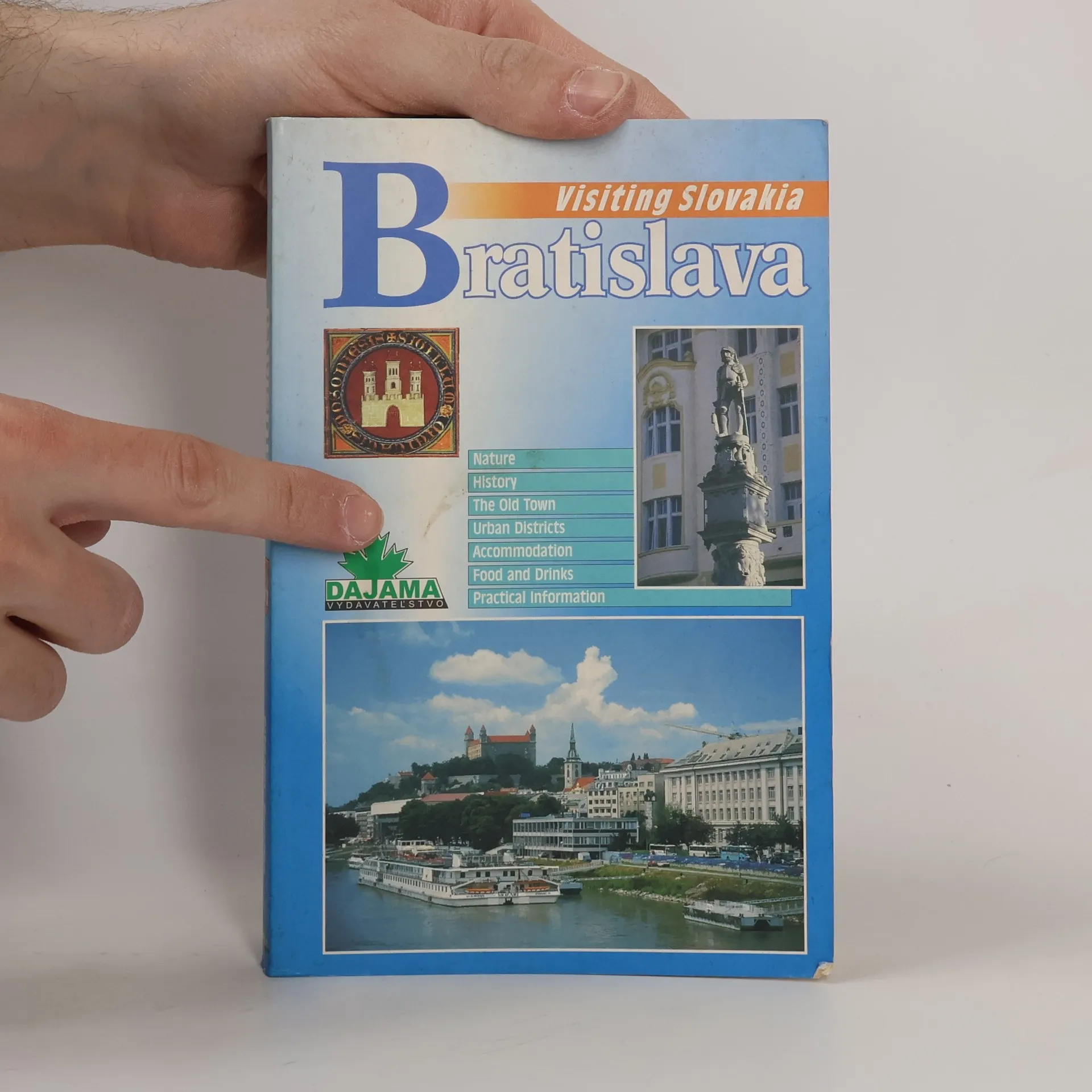 Small color photographs and street maps and written descriptions and directions guide visitors through the city, which like nearby Vienna and Budapest, is situated on the Danube River where it comes out of a mountain range. No date is noted for the first edition. There is no index. Annotation c. Boo