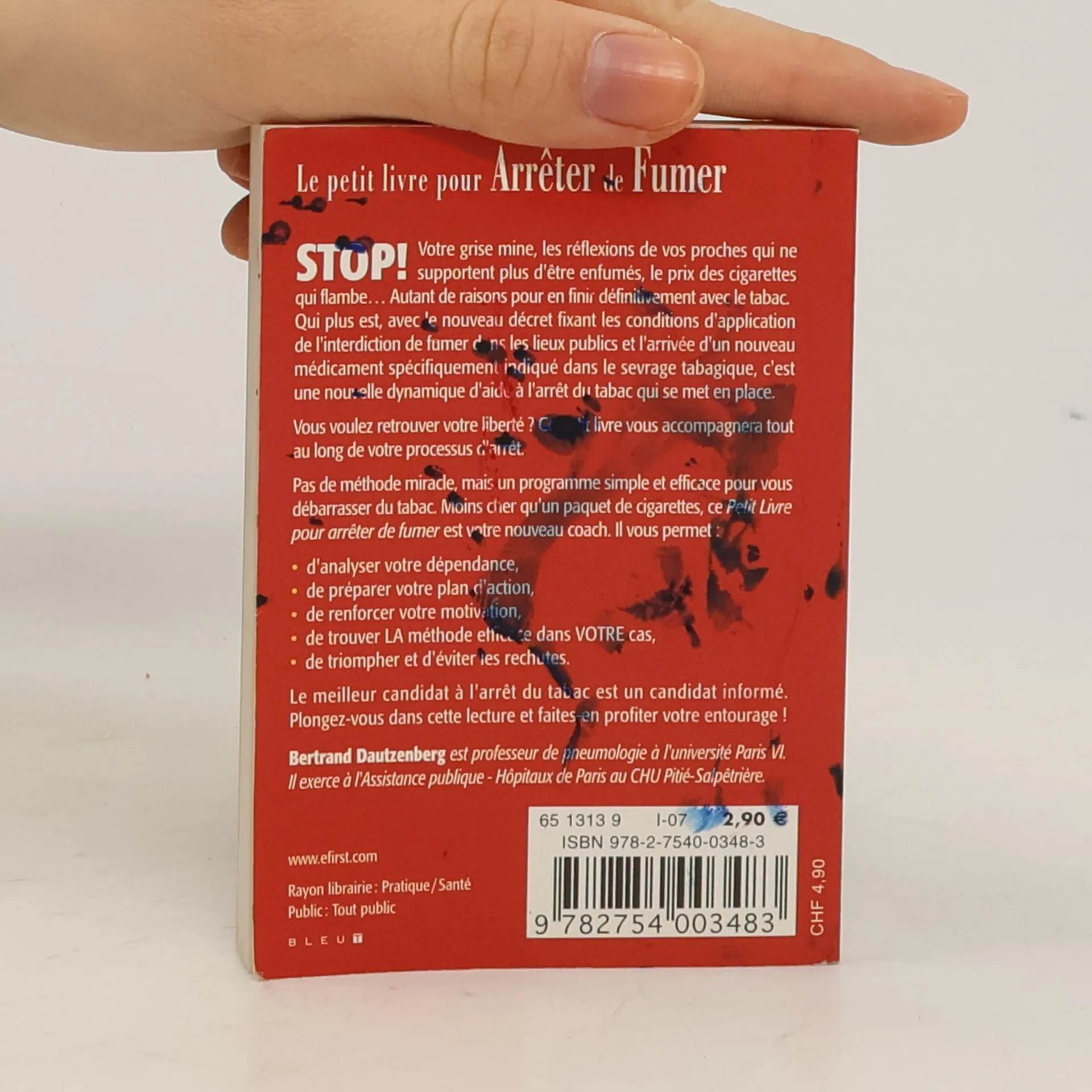 STOP ! Votre grise mine, les réflexions de vos proches qui ne supportent plus d'être enfumés, le prix des cigarettes qui flambe... Autant de raisons pour en finir définitivement avec le tabac. Qui plus est, avec le nouveau décret fixant les conditions d'application de l'interdiction de fumer dans les lieux publics et l'arrivée d'un nouveau médicament spécifiquement indiqué dans le sevrage tabagique c'est une nouvelle dynamique d'aide à l'arrêt du tabac qui se met en place. Vous voulez retrouver votre liberté ? Ce petit livre vous accompagnera tout au long de votre processus d'arrêt. Pas de méthode miracle, mais un programme simple et efficace pour vous débarrasser du tabac. Moins cher qu'un paquet de cigarettes, ce Petit Livre pour arrêter de fumer est votre nouveau coach. Il vous permet d'analyser votre dépendance, de préparer votre plan d'action, de renforcer votre motivation, de trouver LA méthode efficace dans VOTRE cas, de triompher et d'éviter les rechutes. Le meilleur candidat à l'arrêt du tabac est un candidat informé. Plongez-vous dans cette lecture et faites-en profiter votre entourage !