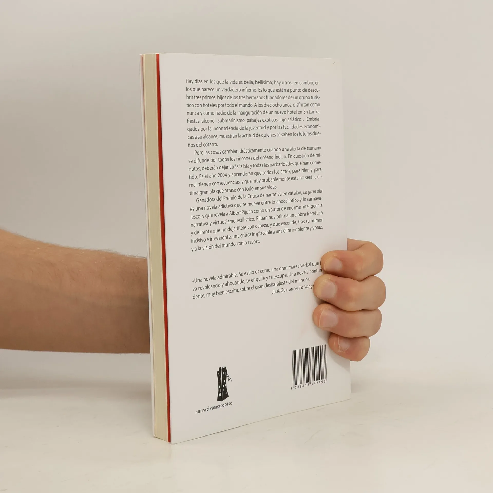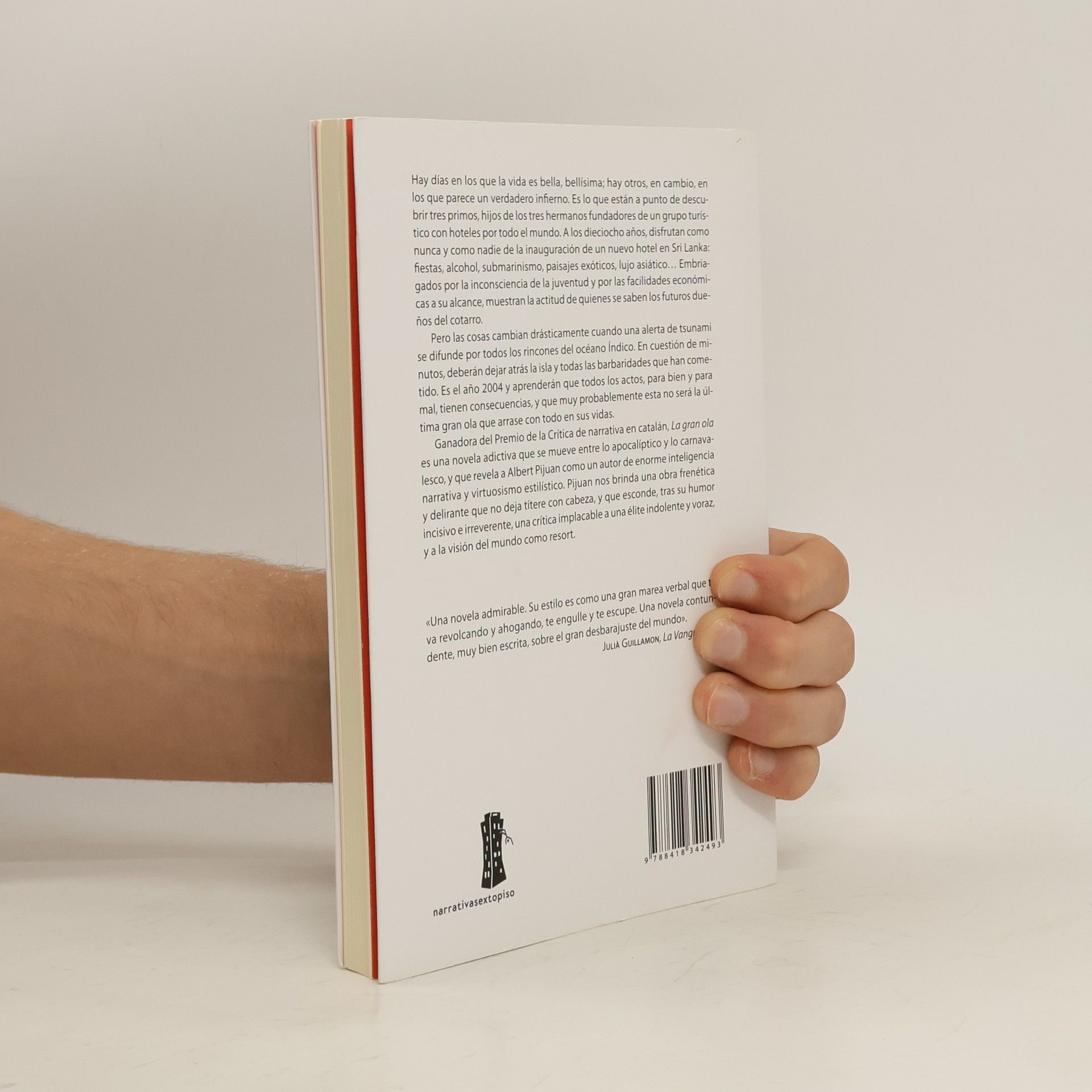 Hay días en los que la vida es bella, bellísima; hay otros, en cambio, en los que parece un verdadero infierno. Es lo que están a punto de descubrir tres primos, hijos de los tres hermanos fundadores de un grupo turístico con hoteles por todo el mundo. A los dieciocho años, disfrutan como nunca y como nadie de la inauguración de un nuevo hotel en Sri Lanka: fiestas, alcohol, submarinismo, paisajes exóticos, lujo asiático… Embriagados por la inconsciencia de la juventud y por las facilidades económicas a su alcance, muestran la actitud de quienes se saben los futuros dueños del cotarro.Pero las cosas cambian drásticamente cuando una alerta de tsunami se difunde por todos los rincones del océano Índico. En cuestión de minutos, deberán dejar atrás la isla y todas las barbaridades que han cometido. Es el año 2004 y aprenderán que todos los actos, para bien y para mal, tienen consecuencias, y que muy probablemente esta no será la última gran ola que arrase con todo en sus vidas.Ganadora del Premio Nacional de la Crítica de narrativa en catalán, La gran ola es una novela adictiva que se mueve entre lo apocalíptico y lo carnavalesco, y que revela a Albert Pijuan como un autor de enorme inteligencia narrativa y virtuosismo estilístico. Pijuan nos brinda una obra frenética y delirante que no deja títere con cabeza, y que esconde, tras su humor incisivo e irreverente, una crítica implacable a una élite indolente y voraz, y a la visión del mundo como resort.