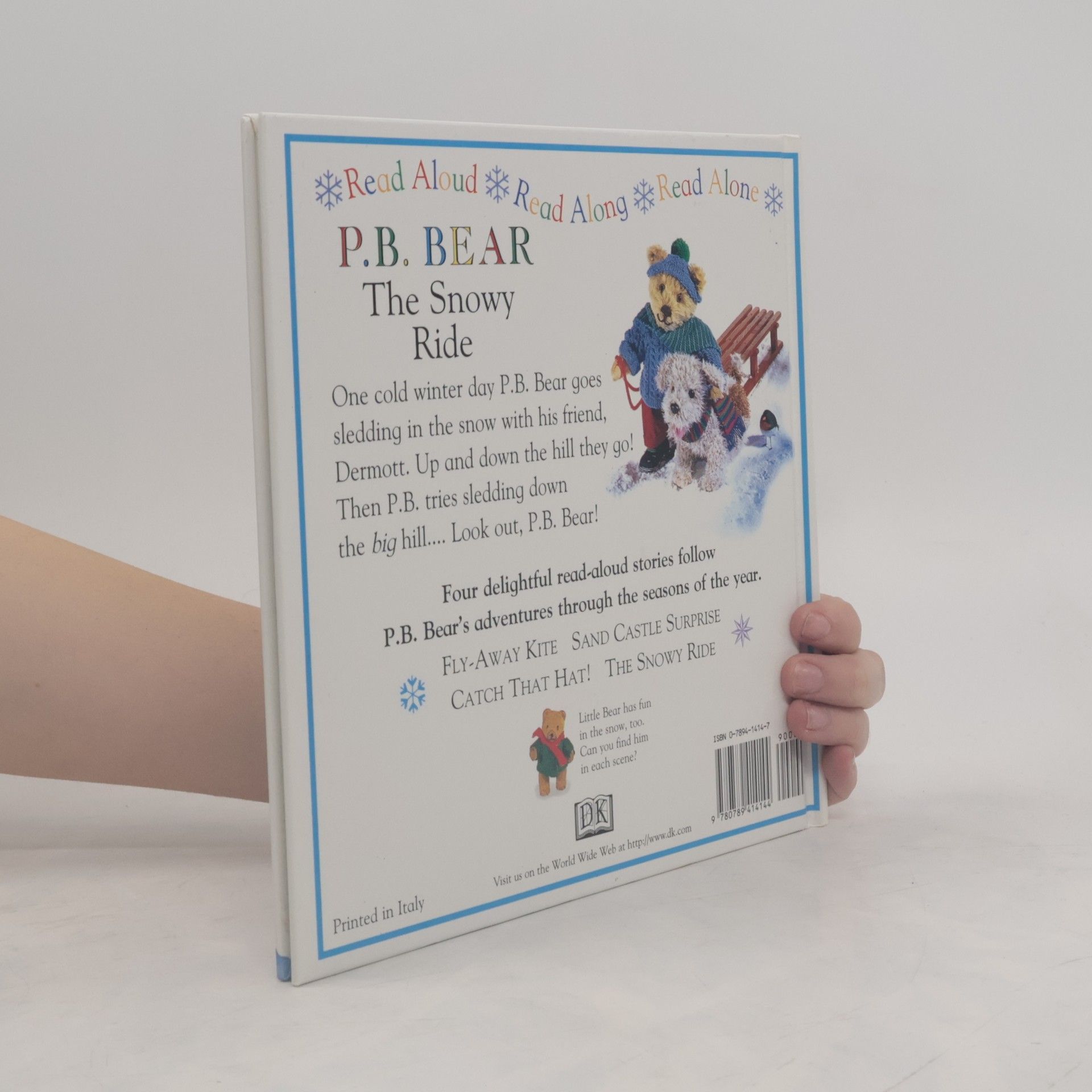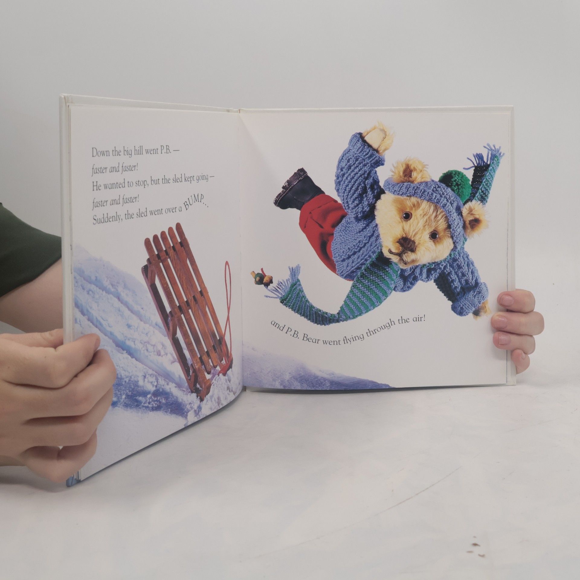 After pulling on his warmest socks, boots, sweater, wooly scarf, and hat, P.B. Bear steps out into the snow and Dermott arrives with a sled.