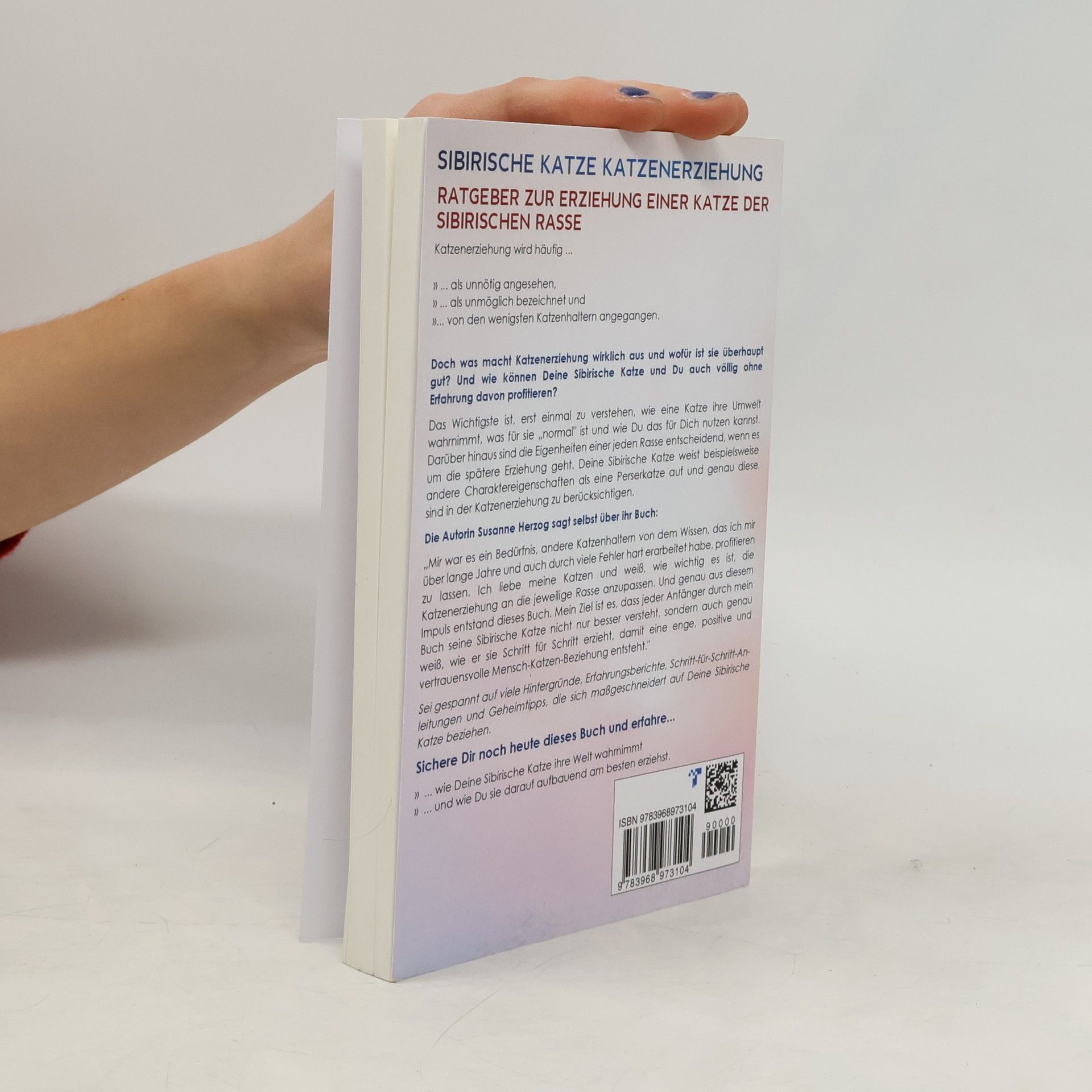 Sibirische Katze Katzenerziehung - Ratgeber zur Erziehung einer Katze der sibirischen Rasse Ein Buch für Katzenbabys, Kitten und junge Katzen Katzenerziehung wird häufig ... Doch was macht Katzenerziehung wirklich aus und wofür ist sie überhaupt gut? Und wie können Deine Sibirische Katze und Du auch völlig ohne Erfahrung davon profitieren? Das Wichtigste ist, erst einmal zu verstehen, wie eine Katze ihre Umwelt wahrnimmt, was für sie „normal" ist und wie Du das für Dich nutzen kannst. Darüber hinaus sind die Eigenheiten einer jeden Rasse entscheidend, wenn es um die spätere Erziehung geht. Deine Sibirische Katze weist beispielsweise andere Charaktereigenschaften als eine Perser Katze auf und genau diese sind in der Katzenerziehung zu berücksichtigen.Dies ist der erste Teil der Sibirische-Katzen-Erziehungsbücher.Teil 2 für Deine ausgewachsene Sibirische Katze findest Du auch bei Amazon unter dem Titel "Sibirische Katze Katzentraining - Ratgeber zum Trainieren einer Katze der sibirischen Rasse".Die Autorin Susanne Herzog sagt selbst über ihr „Mir war es ein Bedürfnis, andere Katzenhaltern von dem Wissen, das ich mir über lange Jahre und auch durch viele Fehler hart erarbeitet habe, profitieren zu lassen. Ich liebe meine Katzen und weiß, wie wichtig es ist, die Katzenerziehung an die jeweilige Rasse anzupassen. Und genau aus diesem Impuls entstand dieses Buch. Mein Ziel ist es, dass jeder Anfänger durch mein Buch seine Sibirische Katze nicht nur besser versteht, sondern auch genau weiß, wie er sie Schritt für Schritt erzieht, damit eine enge, positive und vertrauensvolle Mensch-Katzen-Beziehung entsteht." Sei gespannt auf viele Hintergründe, Erfahrungsberichte, Schritt-für-Schritt-Anleitungen und Geheimtipps, die sich maßgeschneidert auf Deine Sibirische Katze beziehen. Sichere Dir noch heute dieses Buch und erfahre... Deine Sibirische Katze wird es Dir danken...... daher ist mein Greife schnell zu! Inhalt des